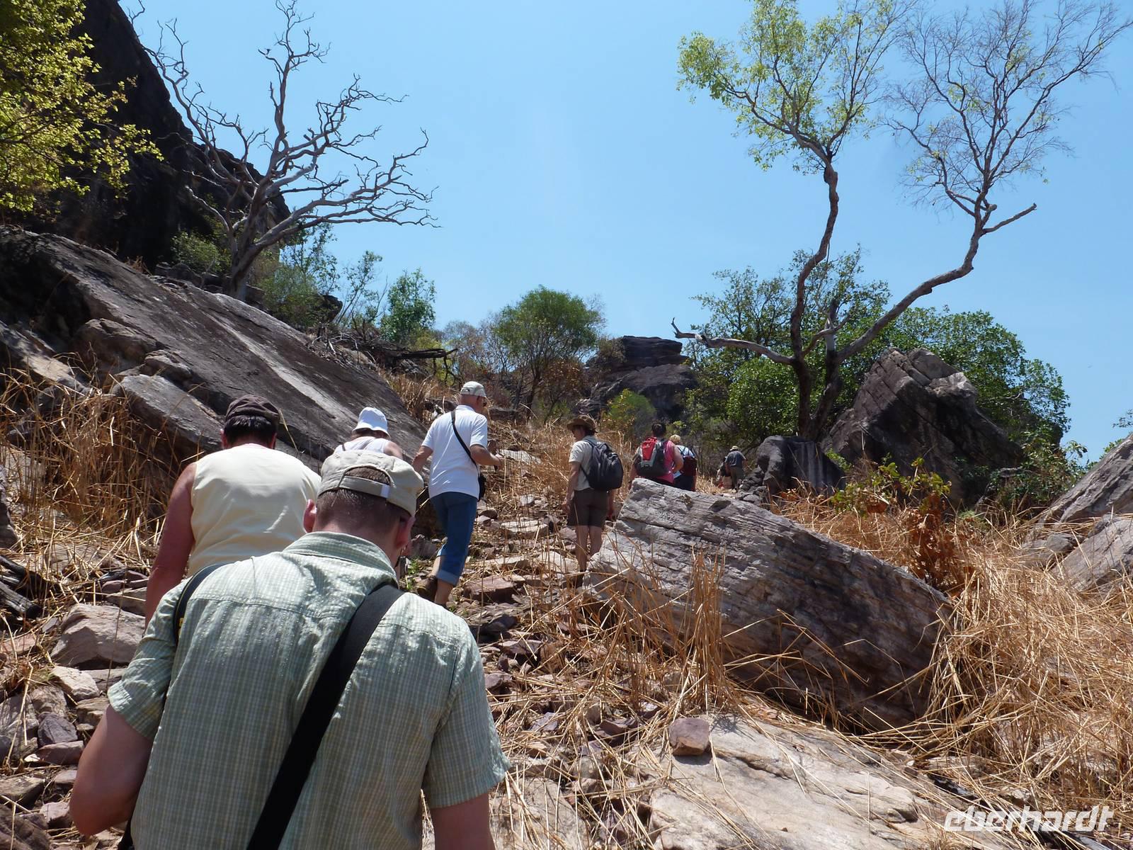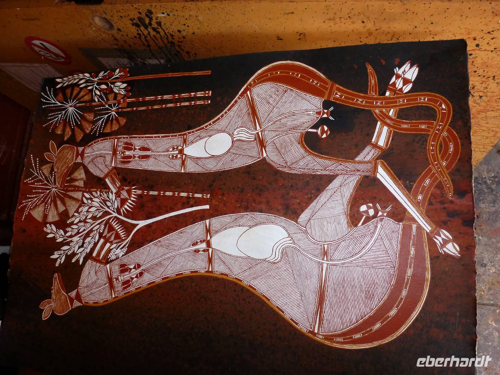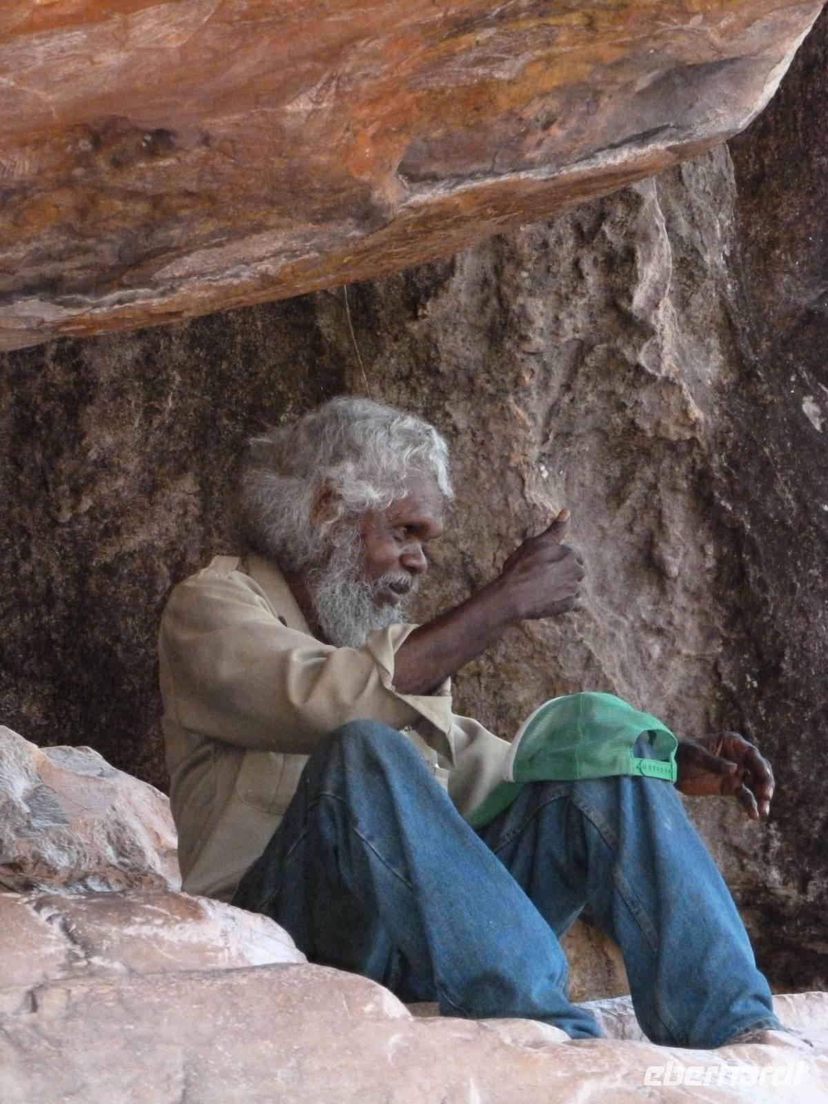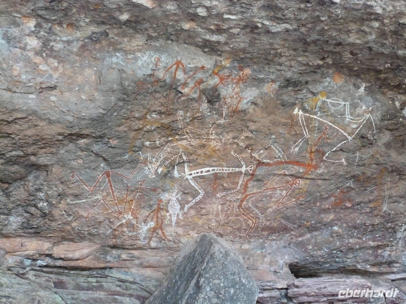Ein großer Wochenendausflug lag vor uns: Noch vor Sonnenaufgang machten wir uns in zwei Kleinbussen auf den Weg gen Osten - in den 20000km² großen, ursprünglichen Kakadu Nationalpark und ins 4x so große Land der Ureinwohner - Arnhemland! Unsere Guides Robin und Donna fuhren uns sicher in diese tolle Landschaft. Und sogar einen weiteren runden Geburtstag durften wir heute in unserer Reisegruppe feiern. Wir fuhren über den Arnhem Highway durch den Nationalpark und erreichten bald den East Alligator Fluss, welchen wir zwar auf einer Überführung, jedoch durch Wasser mit unseren Bussen überquerten. Und wir sahen unser erstes Krokodil, welches gleich neben der Überführung im Wasser schwamm. Und schon waren wir im Arnhemland - ein fast 100000km² großes, fast unberührtes Gebiet, in dem seit tausenden Jahren Australiens Ureinwohner leben. Wir fuhren auf einer Naturpiste weiter und besuchten die Aborigine Gemeinde Oenpelli mit deren Kunstzentrum. Dor werden nach traditioneller Art tolle Bilder gemalt und Körbe von den Ureinwohnern geflochten. Ein hier lebender Mann führte uns durch das Zentrum. Und dann wanderten wir auf den für die Ureinwohner wichtigen und heiligen Berg Injalak. Die zwei Aborigine Führer Thomas und Nelson begleiteten uns auf der doch recht anspruchsvollen Tour hinauf auf den „heiligen Berg". Unterwegs zeigten sie uns bis zu 20.000 Jahre alte Felsmalereien ihrer Vorfahren. Und diese sind so toll erhalten, sehr beeindruckend. Nachdem wir auf allen vieren durch eine Felsspalte gekrabbelt sind, genossen wir ein tolles Picknick in einer Felshöhle mit gigantischem Ausblick über das Arnhemland. Wunderbar!!! Später fuhren wir zurück in den Kakadu Nationalpark, wo wir unser Hotel Aurora Kakadu Resort bezogen. Eine wunderschöne Anlage mit Bungalows, vielen Kakadus und Wildgänsen und einem tollen Pool. Den Geburtstagsabend ließen wir nach einem schönen Nachmittag im Pool gemütlich an der Bar ausklingen, wo wir Knoblauchbrot und Chips genossen.