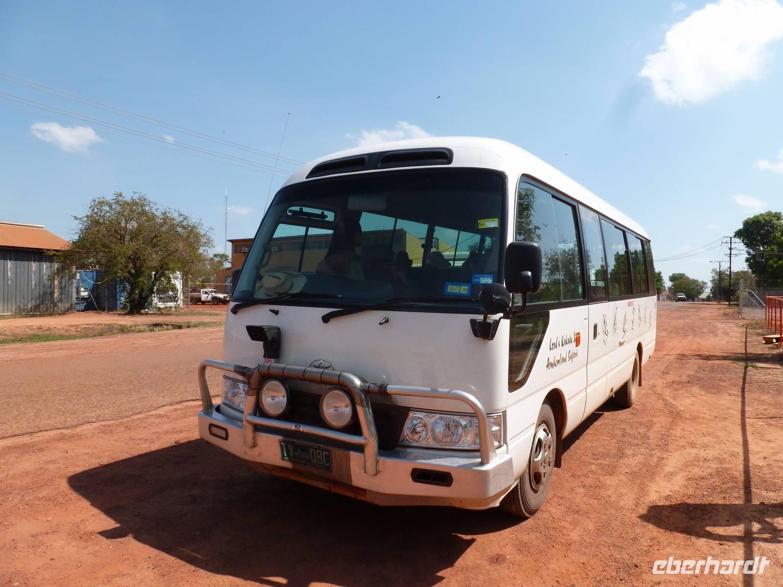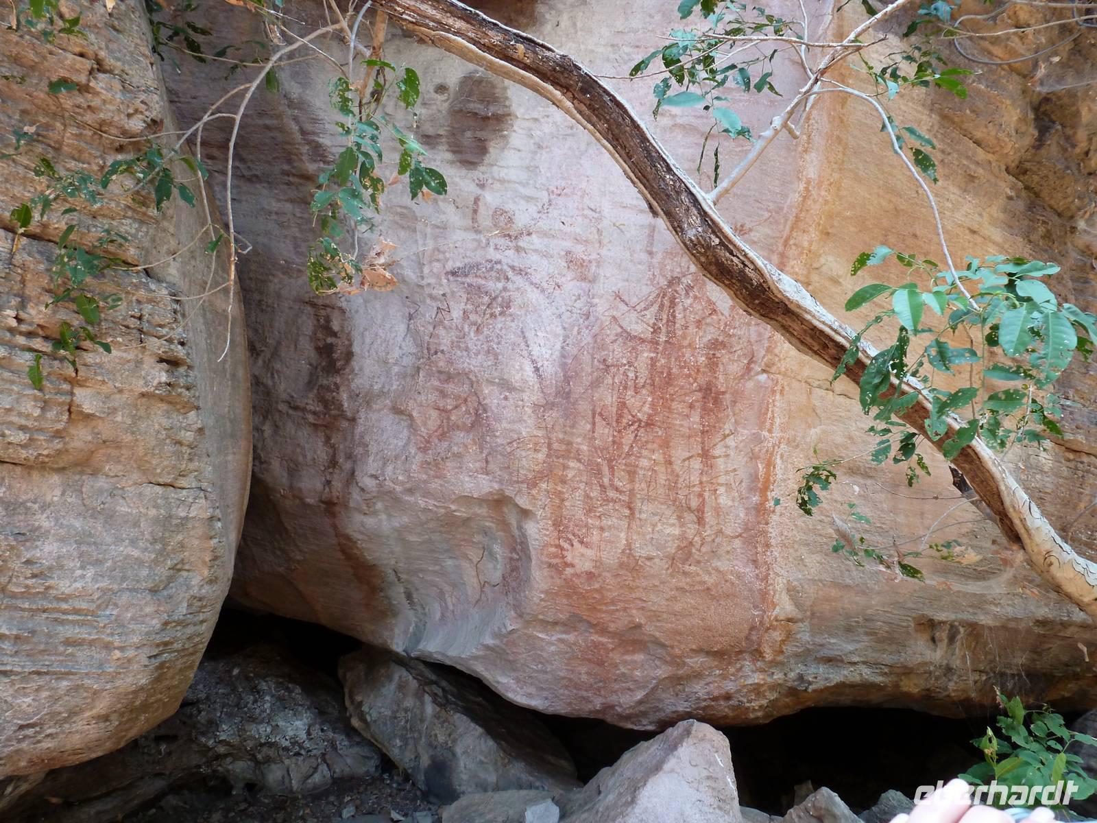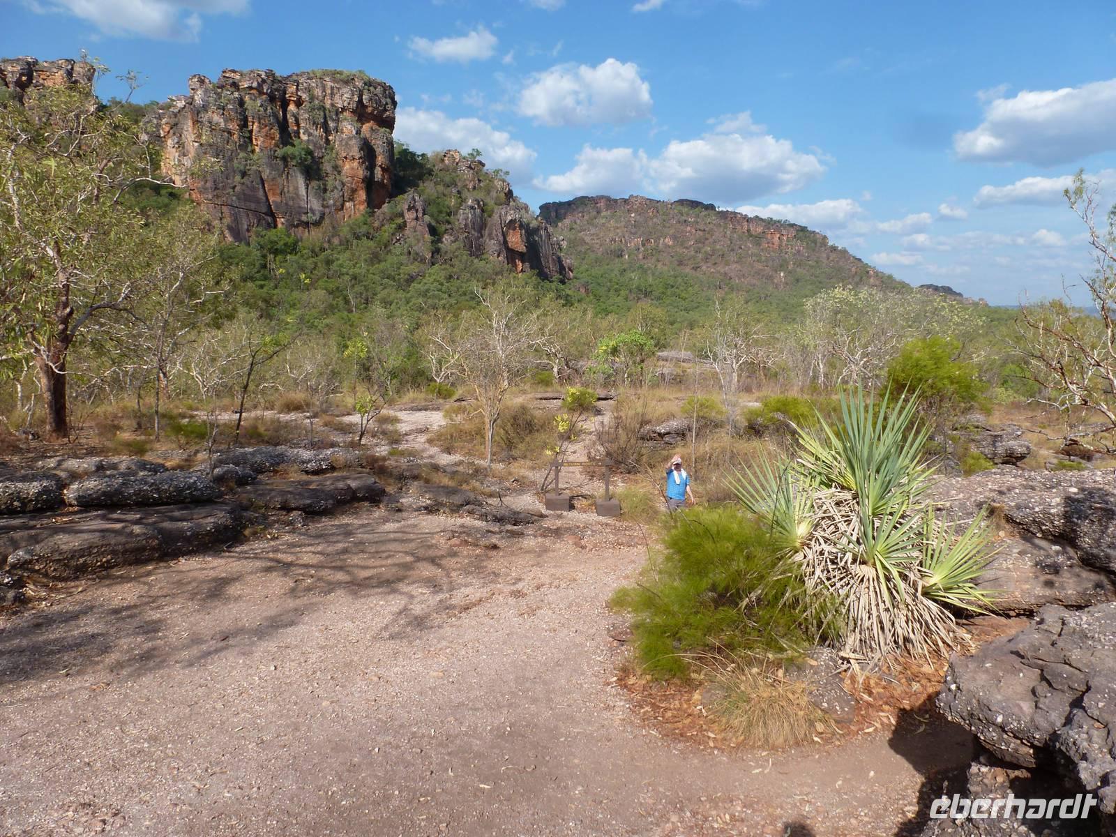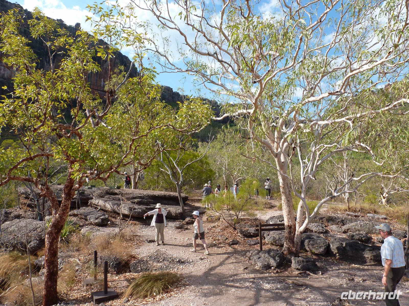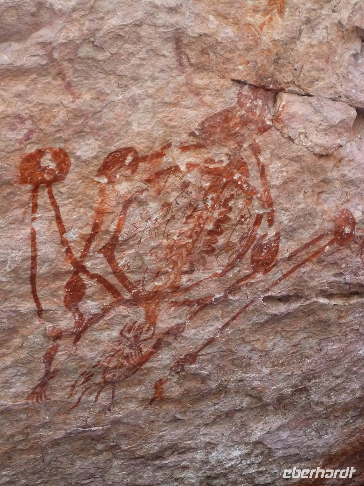 Ein großer Wochenendausflug lag vor uns: Noch vor Sonnenaufgang machten wir uns in zwei Kleinbussen auf den Weg gen Osten - in den 20000km² großen, ursprünglichen Kakadu Nationalpark und ins 4x so große Land der Ureinwohner - Arnhemland! Unsere Guides Robin und Donna fuhren uns sicher in diese tolle Landschaft. Und sogar einen weiteren runden Geburtstag durften wir heute in unserer Reisegruppe feiern. Wir fuhren über den Arnhem Highway durch den Nationalpark und erreichten bald den East Alligator Fluss, welchen wir zwar auf einer Überführung, jedoch durch Wasser mit unseren Bussen überquerten. Und wir sahen unser erstes Krokodil, welches gleich neben der Überführung im Wasser schwamm. Und schon waren wir im Arnhemland - ein fast 100000km² großes, fast unberührtes Gebiet, in dem seit tausenden Jahren Australiens Ureinwohner leben. Wir fuhren auf einer Naturpiste weiter und besuchten die Aborigine Gemeinde Oenpelli mit deren Kunstzentrum. Dor werden nach traditioneller Art tolle Bilder gemalt und Körbe von den Ureinwohnern geflochten. Ein hier lebender Mann führte uns durch das Zentrum. Und dann wanderten wir auf den für die Ureinwohner wichtigen und heiligen Berg Injalak. Die zwei Aborigine Führer Thomas und Nelson begleiteten uns auf der doch recht anspruchsvollen Tour hinauf auf den „heiligen Berg". Unterwegs zeigten sie uns bis zu 20.000 Jahre alte Felsmalereien ihrer Vorfahren. Und diese sind so toll erhalten, sehr beeindruckend. Nachdem wir auf allen vieren durch eine Felsspalte gekrabbelt sind, genossen wir ein tolles Picknick in einer Felshöhle mit gigantischem Ausblick über das Arnhemland. Wunderbar!!! Später fuhren wir zurück in den Kakadu Nationalpark, wo wir unser Hotel Aurora Kakadu Resort bezogen. Eine wunderschöne Anlage mit Bungalows, vielen Kakadus und Wildgänsen und einem tollen Pool. Den Geburtstagsabend ließen wir nach einem schönen Nachmittag im Pool gemütlich an der Bar ausklingen, wo wir Knoblauchbrot und Chips genossen.
