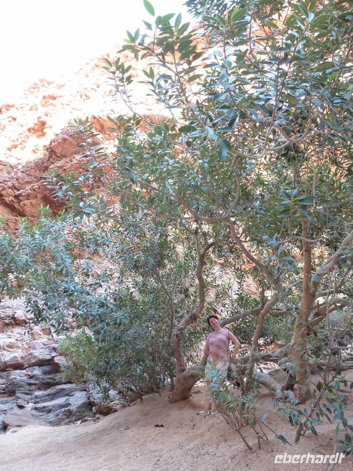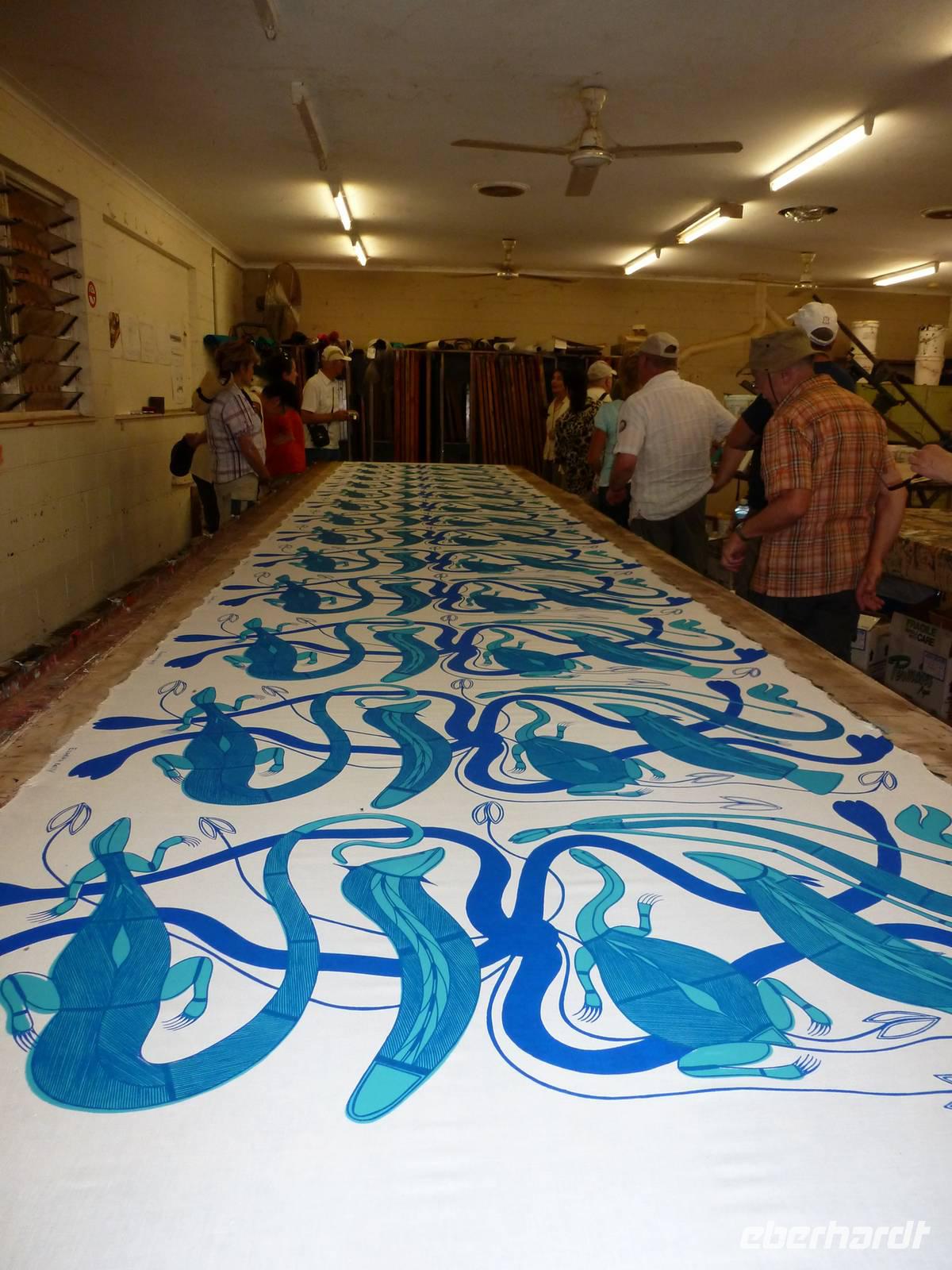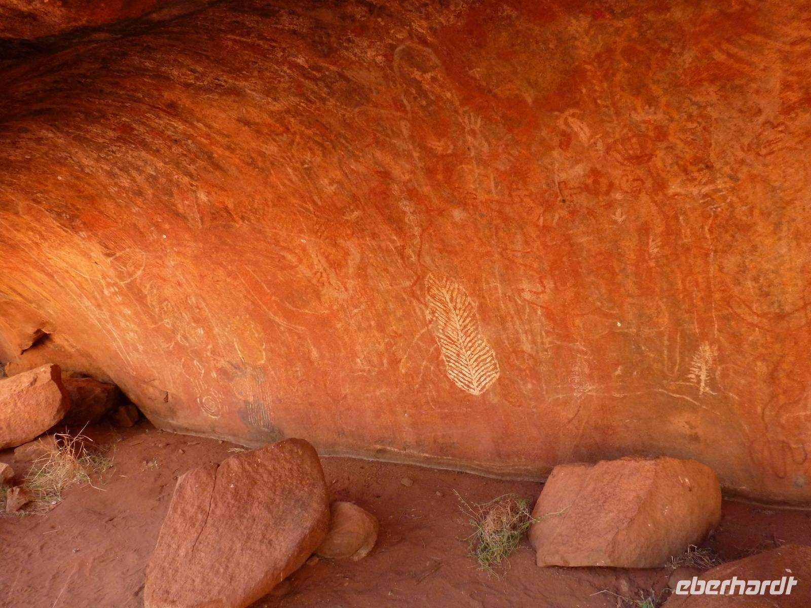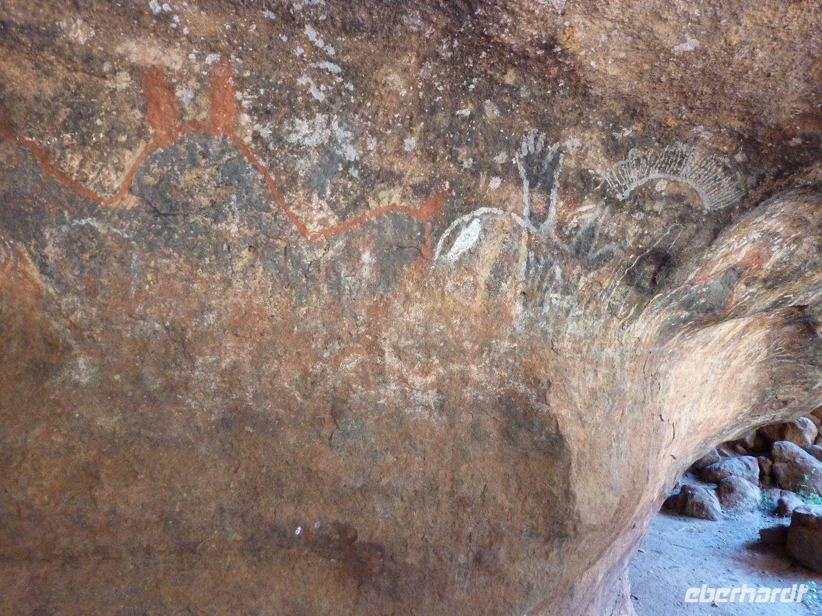 Ein großer Wochenendausflug lag vor uns: Noch vor Sonnenaufgang machten wir uns in zwei Kleinbussen auf den Weg gen Osten - in den 20000km² großen, ursprünglichen Kakadu Nationalpark und ins 4x so große Land der Ureinwohner - Arnhemland! Unsere Guides Robin und Donna fuhren uns sicher in diese tolle Landschaft. Und sogar einen weiteren runden Geburtstag durften wir heute in unserer Reisegruppe feiern. Wir fuhren über den Arnhem Highway durch den Nationalpark und erreichten bald den East Alligator Fluss, welchen wir zwar auf einer Überführung, jedoch durch Wasser mit unseren Bussen überquerten. Und wir sahen unser erstes Krokodil, welches gleich neben der Überführung im Wasser schwamm. Und schon waren wir im Arnhemland - ein fast 100000km² großes, fast unberührtes Gebiet, in dem seit tausenden Jahren Australiens Ureinwohner leben. Wir fuhren auf einer Naturpiste weiter und besuchten die Aborigine Gemeinde Oenpelli mit deren Kunstzentrum. Dor werden nach traditioneller Art tolle Bilder gemalt und Körbe von den Ureinwohnern geflochten. Ein hier lebender Mann führte uns durch das Zentrum. Und dann wanderten wir auf den für die Ureinwohner wichtigen und heiligen Berg Injalak. Die zwei Aborigine Führer Thomas und Nelson begleiteten uns auf der doch recht anspruchsvollen Tour hinauf auf den „heiligen Berg". Unterwegs zeigten sie uns bis zu 20.000 Jahre alte Felsmalereien ihrer Vorfahren. Und diese sind so toll erhalten, sehr beeindruckend. Nachdem wir auf allen vieren durch eine Felsspalte gekrabbelt sind, genossen wir ein tolles Picknick in einer Felshöhle mit gigantischem Ausblick über das Arnhemland. Wunderbar!!! Später fuhren wir zurück in den Kakadu Nationalpark, wo wir unser Hotel Aurora Kakadu Resort bezogen. Eine wunderschöne Anlage mit Bungalows, vielen Kakadus und Wildgänsen und einem tollen Pool. Den Geburtstagsabend ließen wir nach einem schönen Nachmittag im Pool gemütlich an der Bar ausklingen, wo wir Knoblauchbrot und Chips genossen.