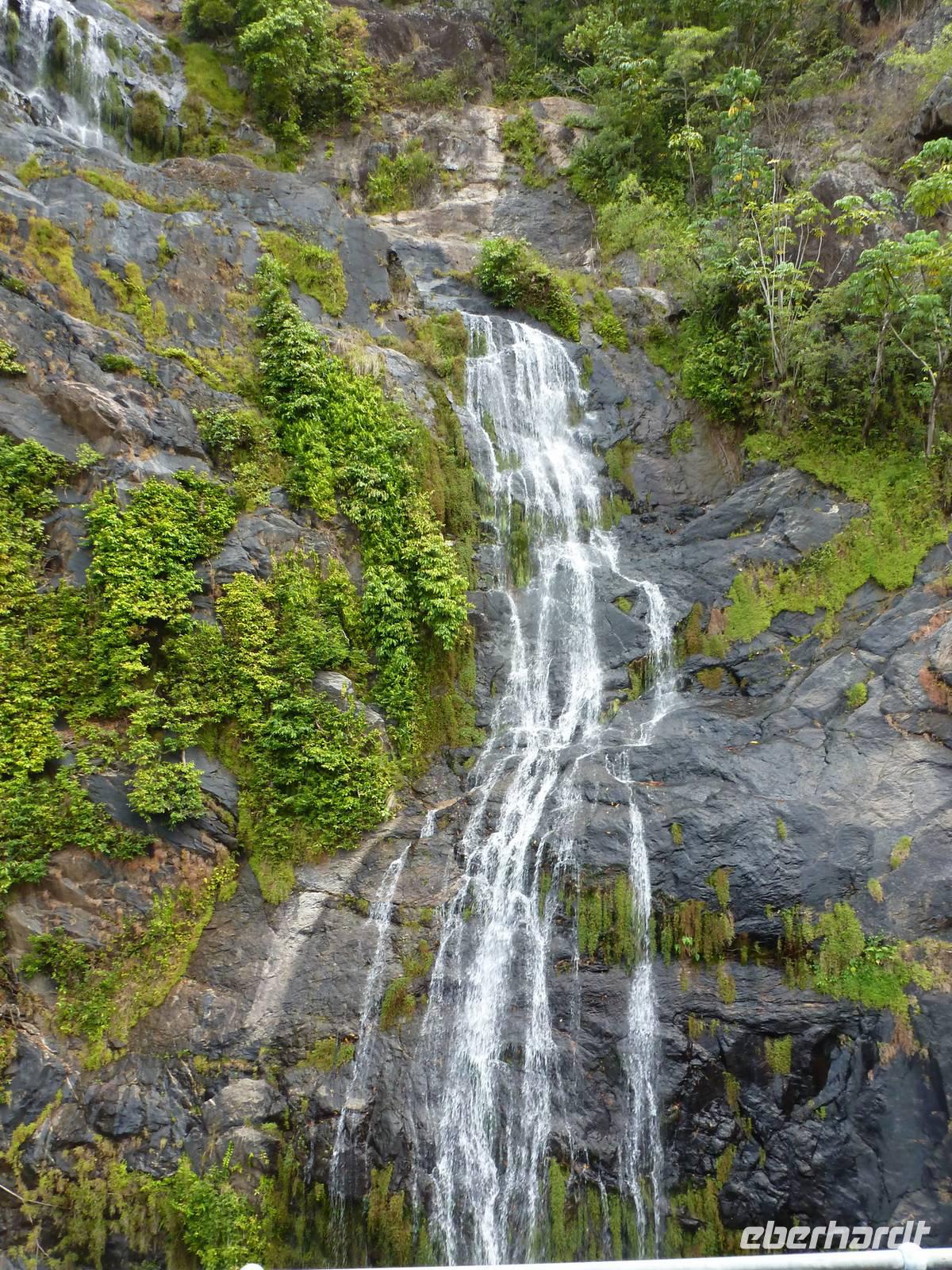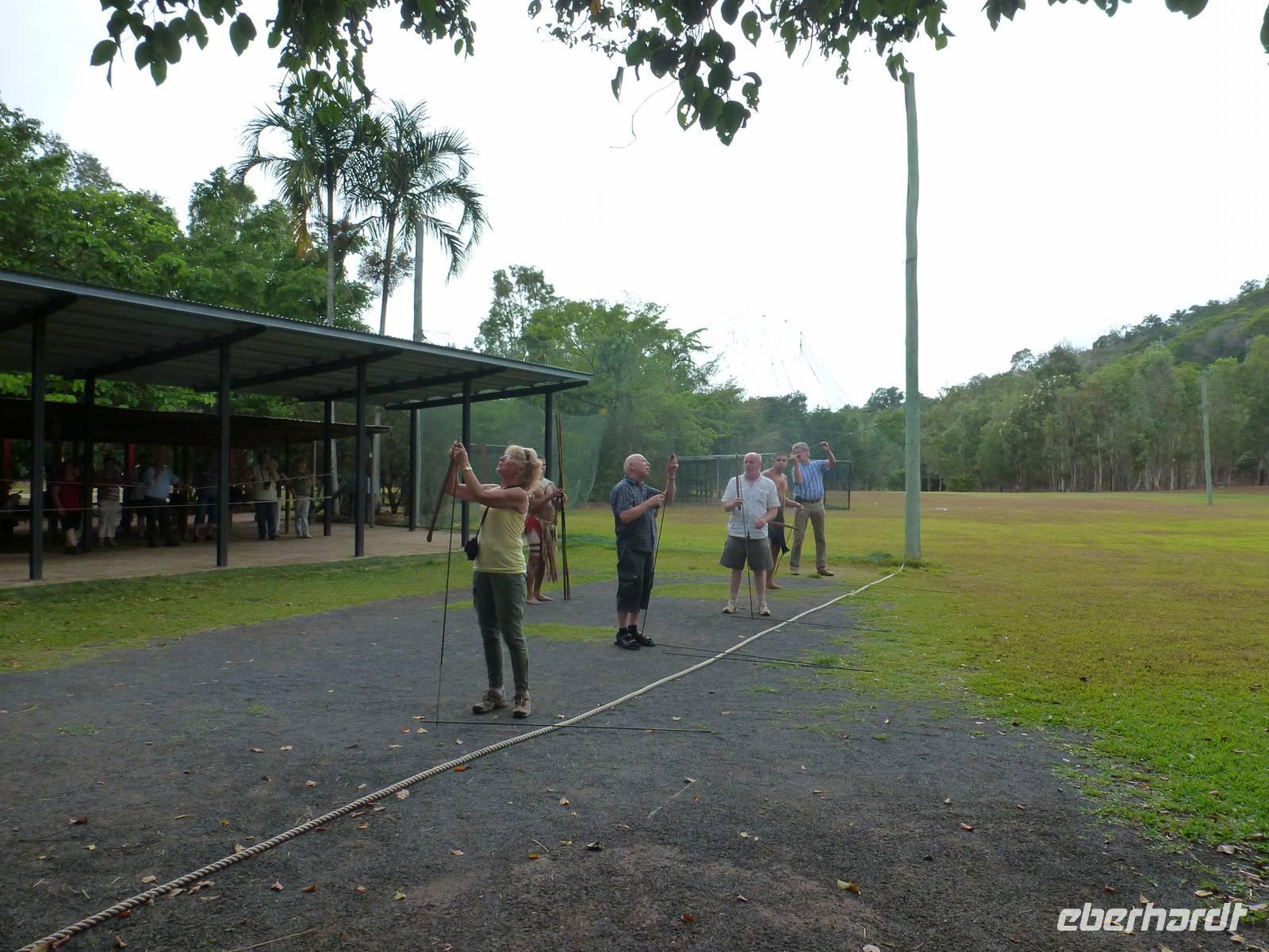 Der letzte Tag unserer großen Reise stand uns bevor L. Und dieser stand ganz im Sinne des tropischen Regenwaldes hier im Norden Queenslands. Am Morgen besuchten wir den tollen Aboriginepark nördlich von Cairns, wo wir das Leben der früher hier im Regenwald lebenden Ureinwohner kennengelernt haben. Bei drei tollen Shows zeigten uns Ureinwohner Didgeridoo spielen, die Entstehungsgeschichte der Welt aus ihrer Sicht und die typischen Tänze der Region. Es ist wirklich sehr schön gemacht. Und dann war jeder von uns dran: Wir haben mit einem Ureinwohner Bumerang werfen geübt...und wir hatten einige Talente unter uns, sehr beeindruckend. Sperr werfen haben wir auch noch probiert und schon wieder zeigte sich, dass einige unserer Gruppe durchaus im Busch überleben könntenJ. Wir nahmen aber alle unsere lieben Gäste wieder mit, denn wir wollten jetzt über den Dächern des Regenwaldes schweben! Mit der längsten Seilbahn der Welt, der Sky Rail fuhren wir über 7km über den Regenwald. Es war zwar etwas nebelig aber man konnte sogar den Pazifik sehen. Wir machten am Red Peak einen Zwischenstopp und spazierten durch den nassen Regenwald, es regnete sogar leicht was ja hier sehr passend ist...weiter ging es zur Endstation nach Kuranda - ein Dorf mitten im Regenwald. Dort hatten wir einige Stunden Zeit und konnten so auf eigene Faust die vielen kleinen Geschäfte, Märkte, das Schmetterlingshaus oder den Vogelpark ODER das deutsche Wursthaus besuchen! Es ist ein kleinen schönes Dorf mit vielen Möglichkeiten...Halb vier fuhren wir dann mit der „Scenic Railway", einem Panoramazug zurück Richtung Cairns. Die Zugstrecke schlängelt sich durch den dichten Regenwald und vorbei an den Baron Wasserfällen bis nach Cairns. Wir stiegen aber in Freshwater aus und unser Bus erwartete uns schon. So fuhren wir zurück in unser Hotel, wo unser Abschiedsabendessen auf uns wartete. Ein tolles Barbecue auf der Terrasse am Pool. Und zwei ganz liebe Gäste haben ein total schönes Lieb über unsere Reise gedichtet und es uns vogetragen:"..wiederalala, wiederalala, wiederalalala..." Vielen lieben Dank dafür. Und mit ganz lieben Worten haben sich meine lieben Reisegäste dann für die Reise durch Australien gedankt! Vielen herzlichen Dank an Sie alle!!!