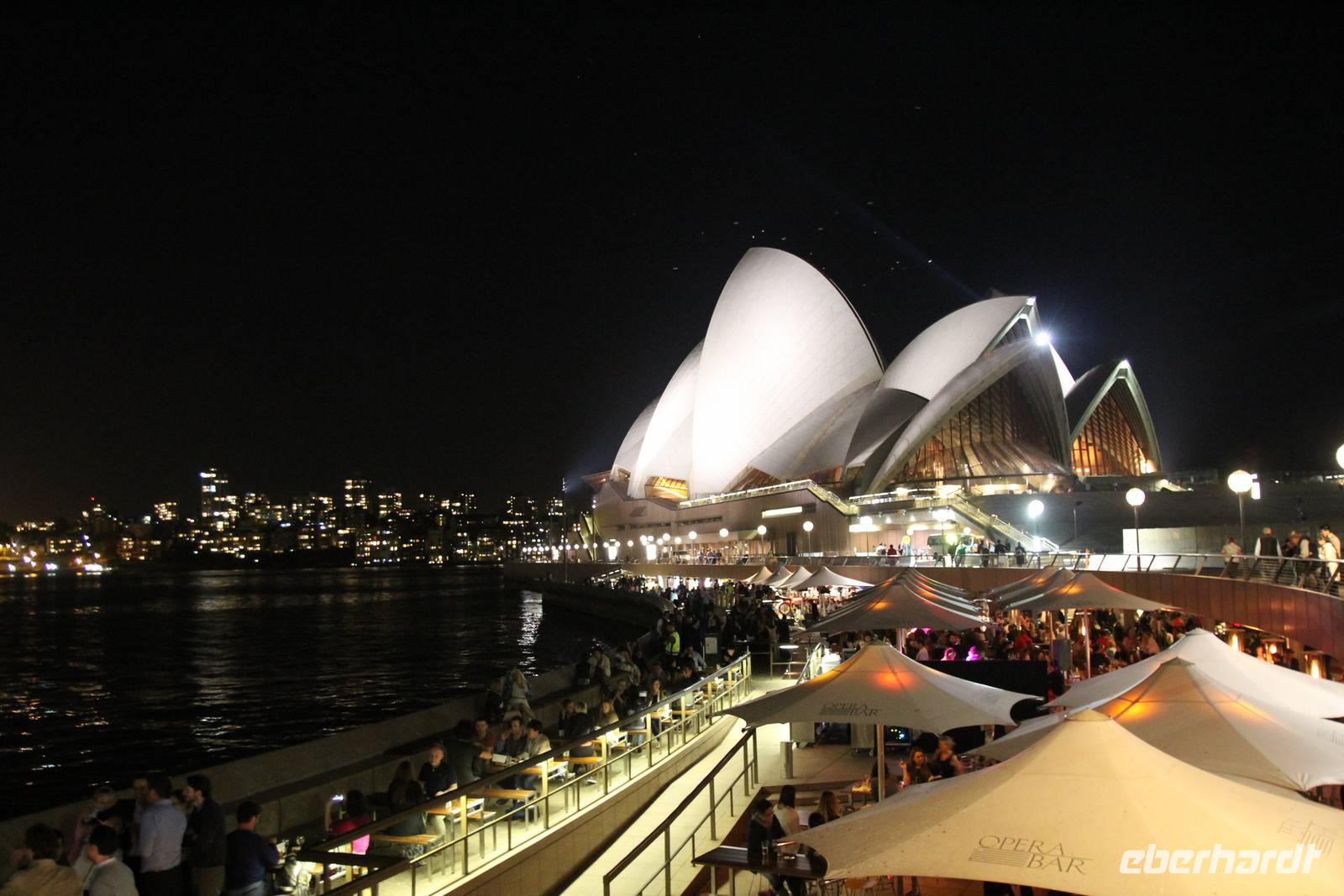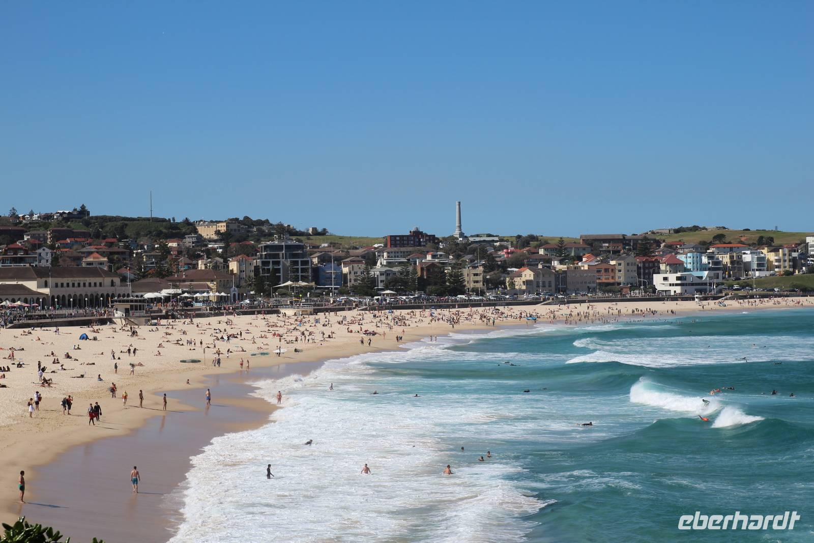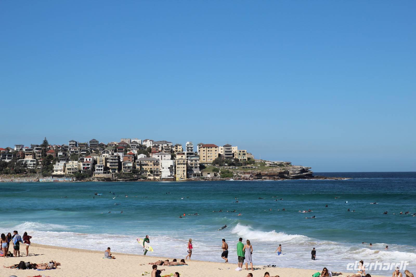 Zum Mittag starteten wir dann auf eine erste kleine Erkundungsfahrt mit dem Bus. Bei diversen Fotostopps und kleineren Spaziergängen bekamen wir unsere ersten Fotomotive von der Hafenbrücke und natürlich auch vom bekannten Opernhaus. Auch an dem Felsen Mrs. Macquarie's Chair kamen wir vorbei, bevor wir zum Bondi Beach weiter fuhren. Hier gönnten wir uns eine gemütliche Pause zum Entspannen und schauten den Surfern bei Ihren Versuchen zu, die Wellen zu erobern. Das war dann für heute auch genug, denn der Flug steckte uns alle in den Knochen und so einige hingen heute doch deutlich durch, aber das sollte morgen schon deutlich besser werden. Dennoch ging es für viele nach dem Abendessen noch auf einen nächtlichen Spaziergang, der uns meist in Richtung Opernhaus führte.