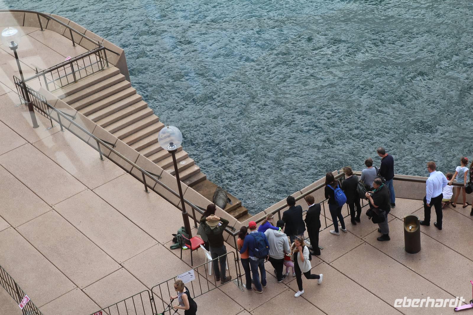 Heute war uns das Ausschlafen gegönnt, denn Uli startete mit uns erst am späteren Vormittag in den Tag. Es ging zu Fuß durch die Stadt, wir starteten von unserem Hotel, dem Travelodge Wynyard, in Richtung des Hafenviertels „The Rocks". Vorbei am Observatorium erkundeten wir die Gassen dieses historischen Stadtteils von Sydney. Durch den Stadtteil Circular Quay ging es dann in Richtung Opernhaus, wo wir mit einer Führerin einen Rundgang durch das Opernhaus und seine Säle machen konnten. Wir hatten sogar etwas Glück, und konnten kurz einer Probe beiwohnen, die gerade stattfand. Und auch einen ungewöhnlichen Gast hatten wir an der Oper: Ein Seehund hat es sich auf einer Treppe gemütlich gemacht.