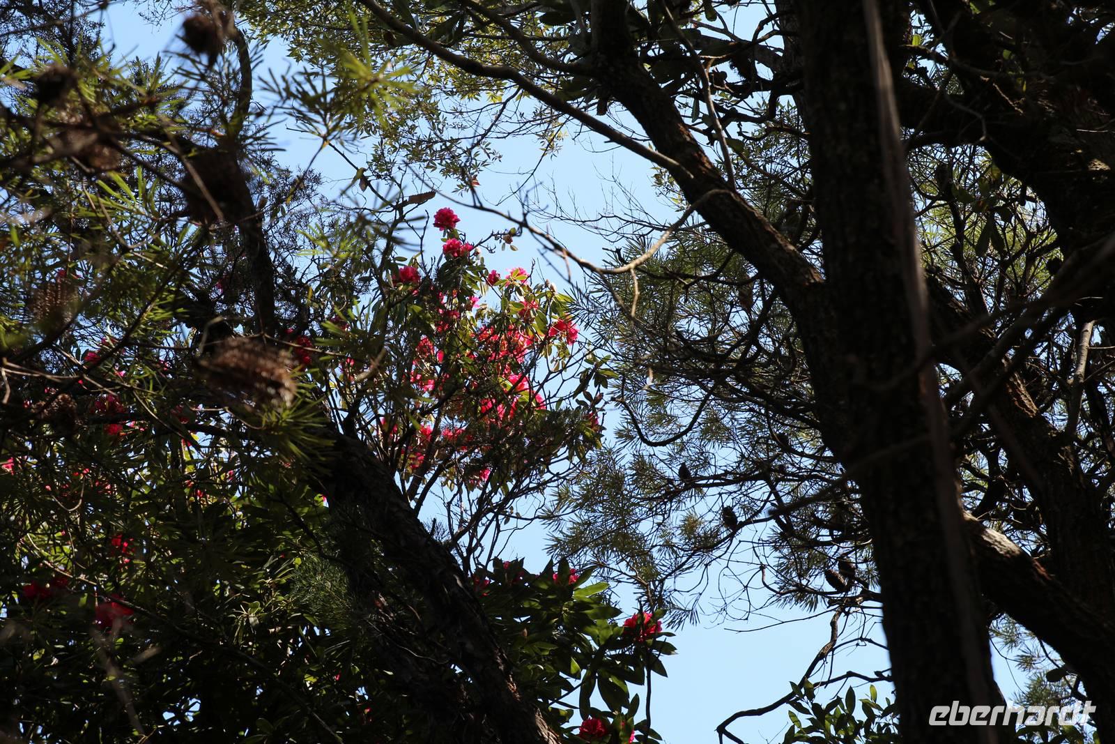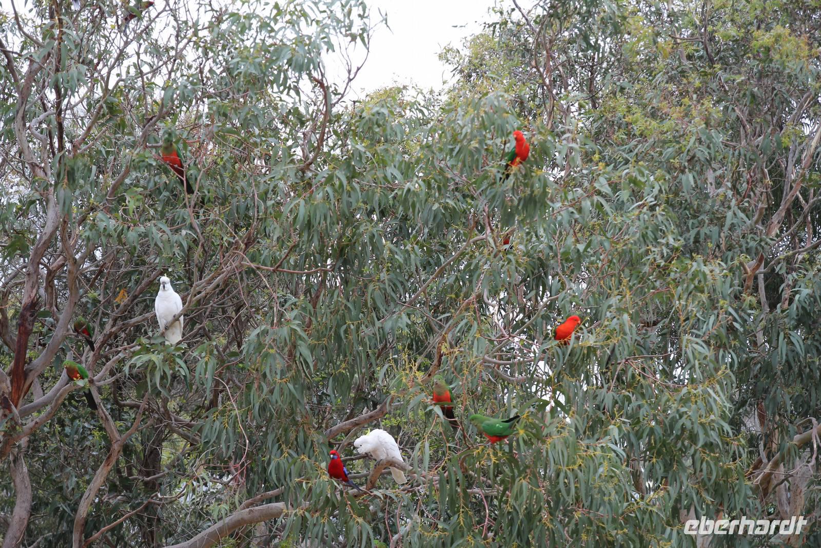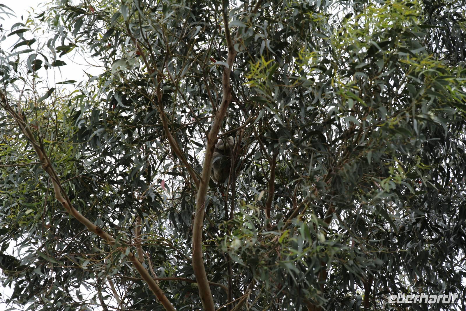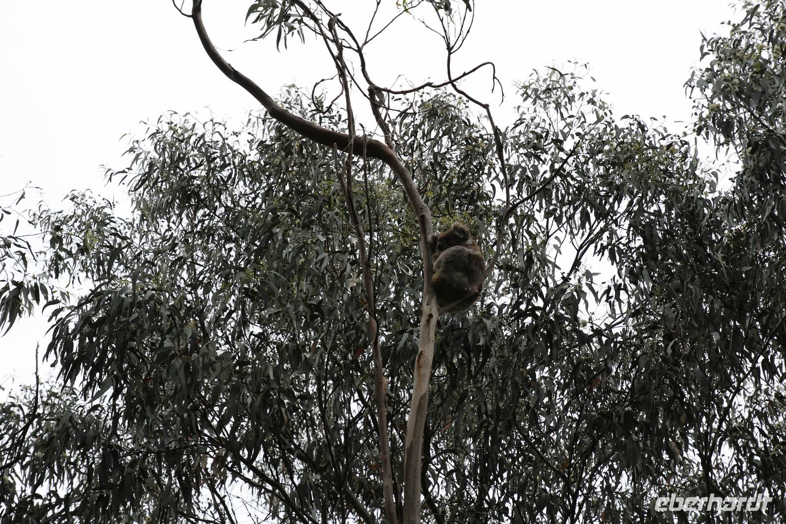Unseren nächsten Stopp legten wir am Campingplatz Kennett River ein, hier wurden uns Koalas versprochen und das Versprechen sollte auch gehalten werden. Denn auf einem Baum konnten wir einen Koala entdecken, aber wie nahezu typisch für einen Koala, machte er keine Anzeichen sich großartig zu bewegen, sondern er schaute nur ein wenig hin und her. Etwas mehr Action gab es da am Eingang zum Campingplatz, denn hier warteten Papageien auf uns. Diese besiedelten dann ganz schnell unsere Arme und Köpfe, zunächst ein etwas komisches Gefühl, doch dann ließen wir uns zum gegenseitigen Fotografieren hinreißen. Wann hat man das schon, gerade hier in der freien Natur.