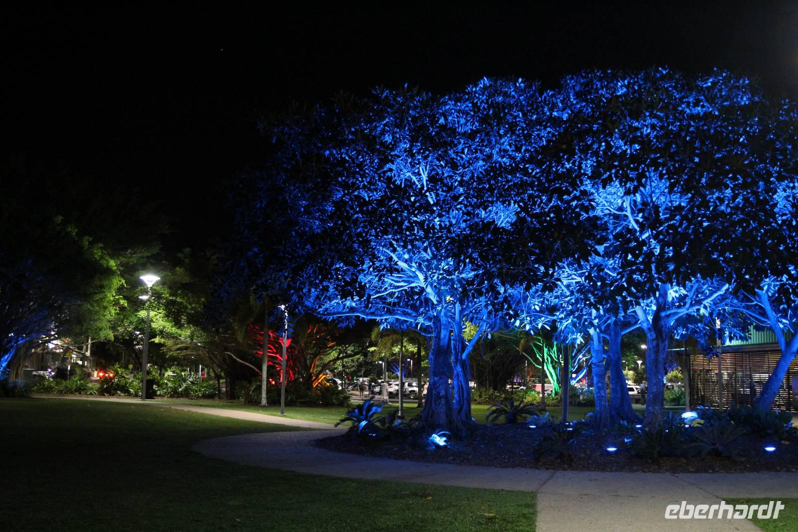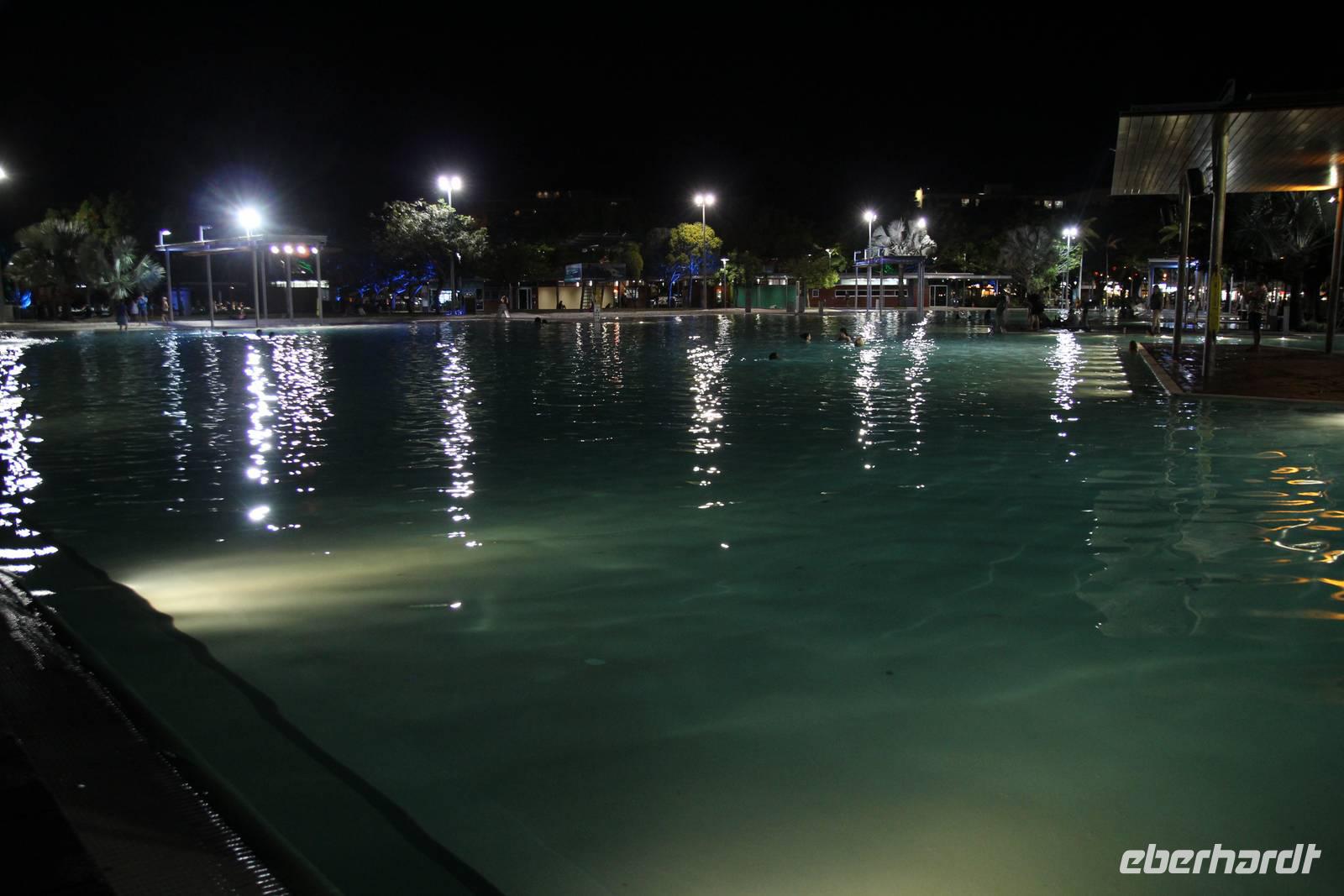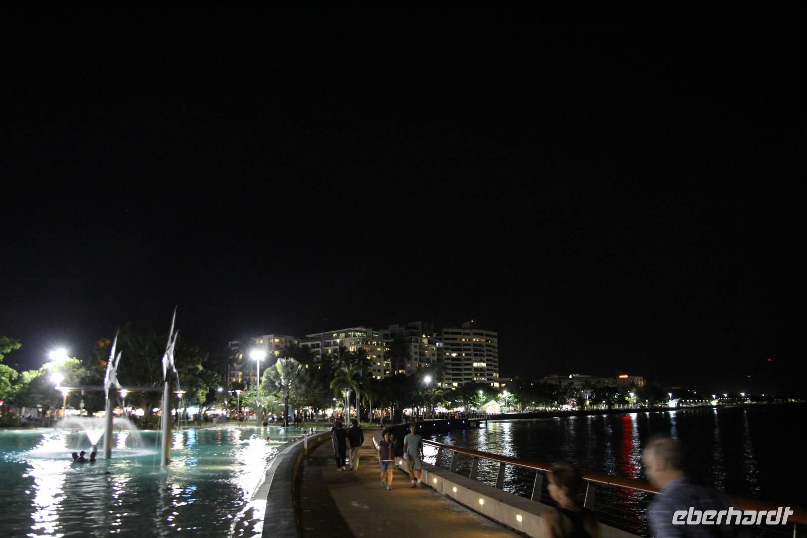 Die weitere Tagesgestaltung konnte sich dann wieder jeder für sich überlegen. Vom Hotel konnte man entlang der Promenade in Richtung Stadt. Wir sahen dabei mehrere Grillstellen, wo sich die Australier zum gemeinsamen Barbecue versammelten. Das Wasser lud auch zunächst zum Baden ein, aber Schilder warnten hier vor Krokodilen. Wir sahen aber nur eine Gruppe von Pelikanen. In der Stadt waren dann die Bäume bunt illuminiert und es fand auch gerade ein Lampionumzug statt, was natürlich ein tolles Erlebnis war. Auch der Nachtmarkt von Cairns war durchaus noch eine interessante Adresse, die man besichtigen konnte, bevor man sich zum Abschluss den Tages noch ein leckeres Getränk in einer der Bars oder auch im Hotel genehmigte.