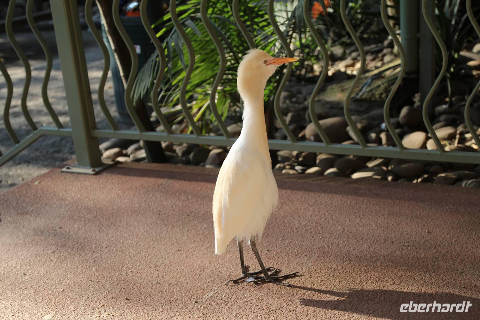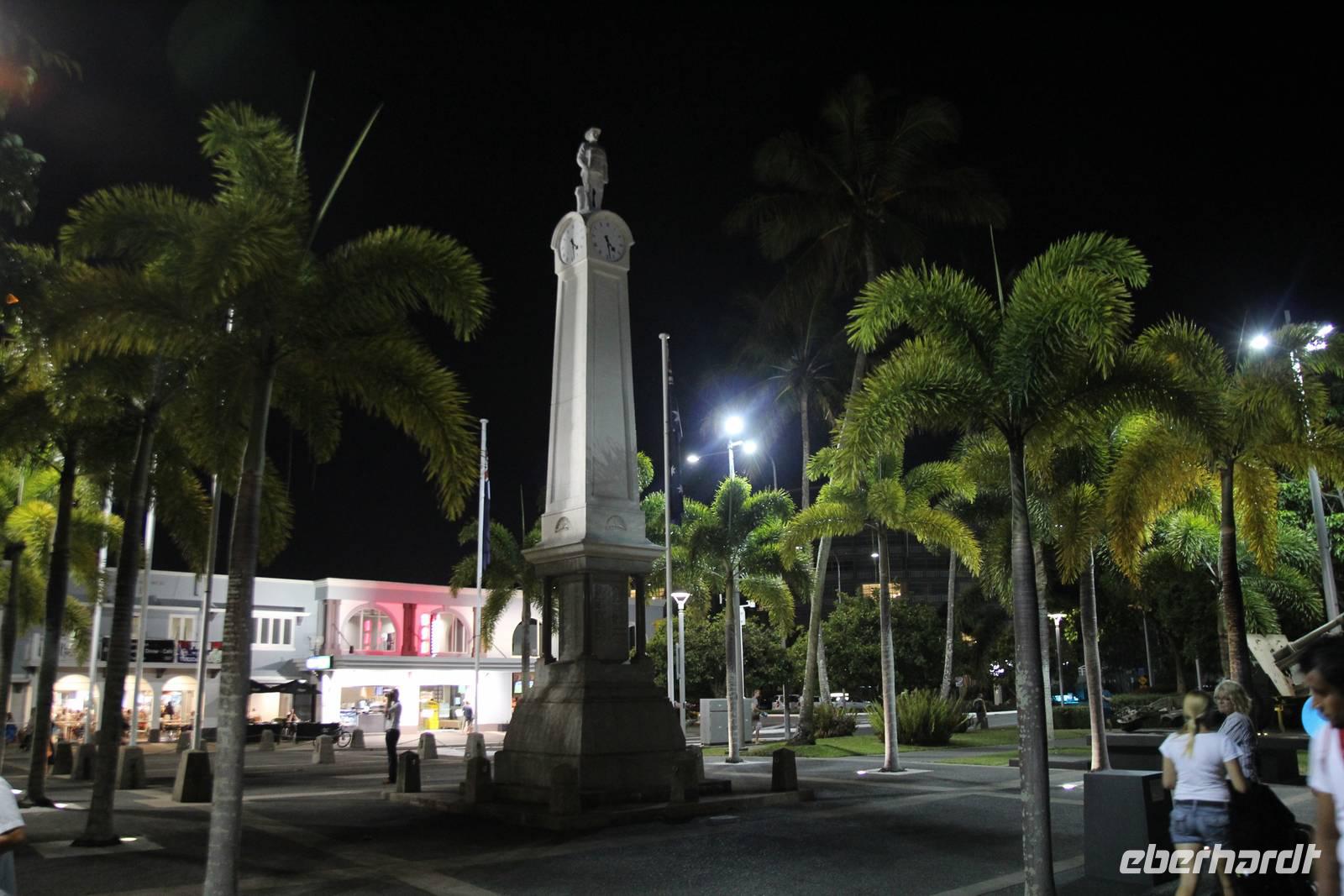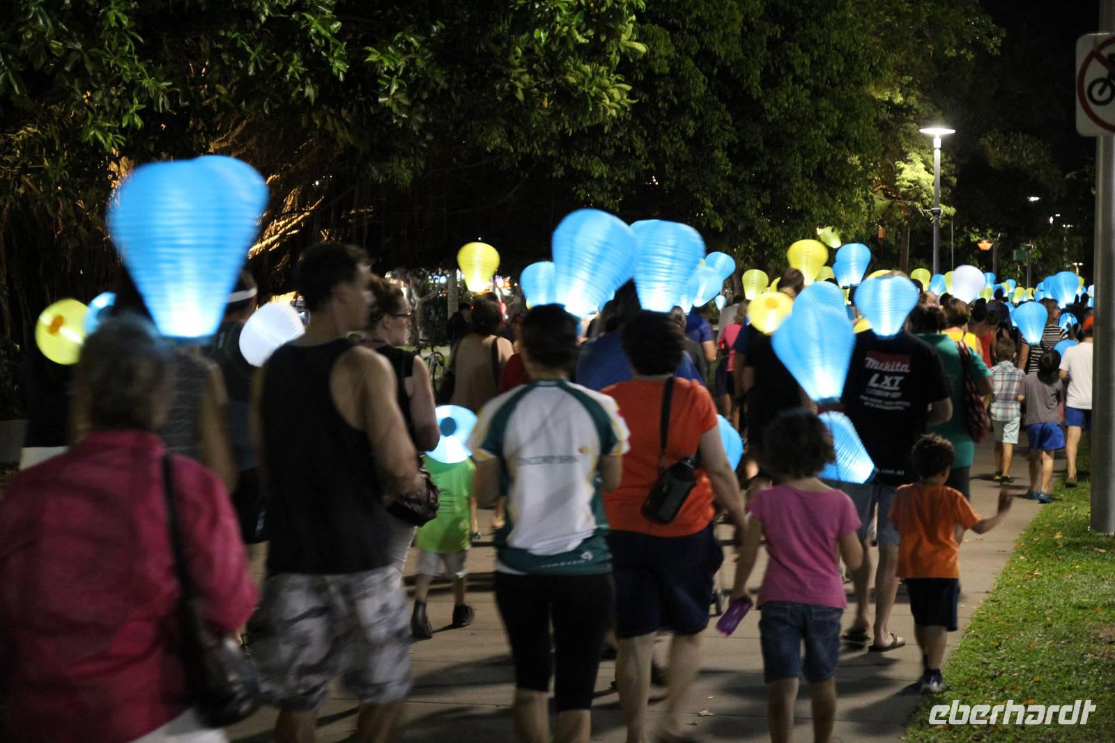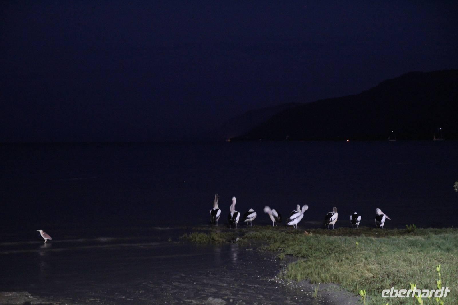 Die weitere Tagesgestaltung konnte sich dann wieder jeder für sich überlegen. Vom Hotel konnte man entlang der Promenade in Richtung Stadt. Wir sahen dabei mehrere Grillstellen, wo sich die Australier zum gemeinsamen Barbecue versammelten. Das Wasser lud auch zunächst zum Baden ein, aber Schilder warnten hier vor Krokodilen. Wir sahen aber nur eine Gruppe von Pelikanen. In der Stadt waren dann die Bäume bunt illuminiert und es fand auch gerade ein Lampionumzug statt, was natürlich ein tolles Erlebnis war. Auch der Nachtmarkt von Cairns war durchaus noch eine interessante Adresse, die man besichtigen konnte, bevor man sich zum Abschluss den Tages noch ein leckeres Getränk in einer der Bars oder auch im Hotel genehmigte.