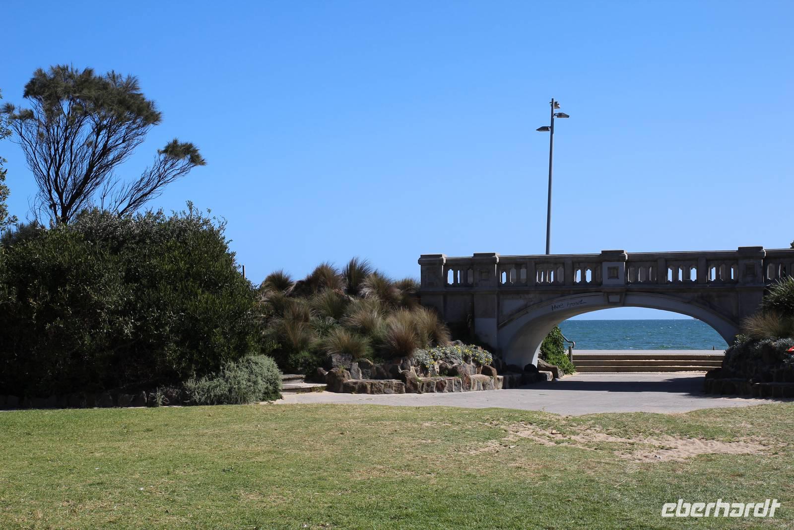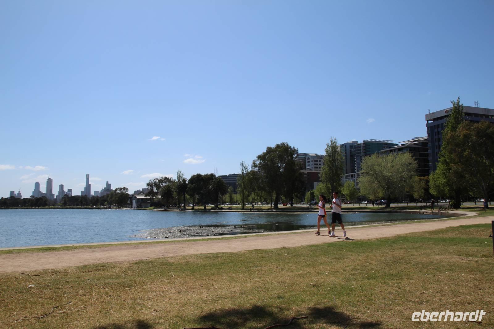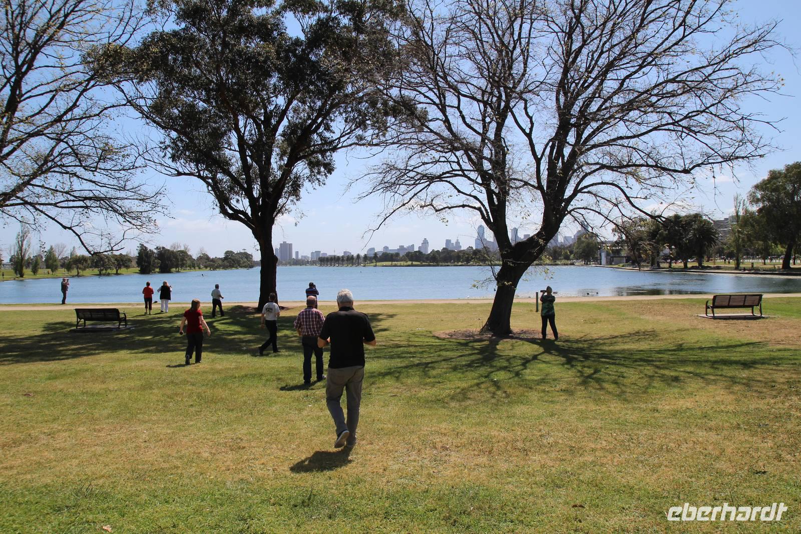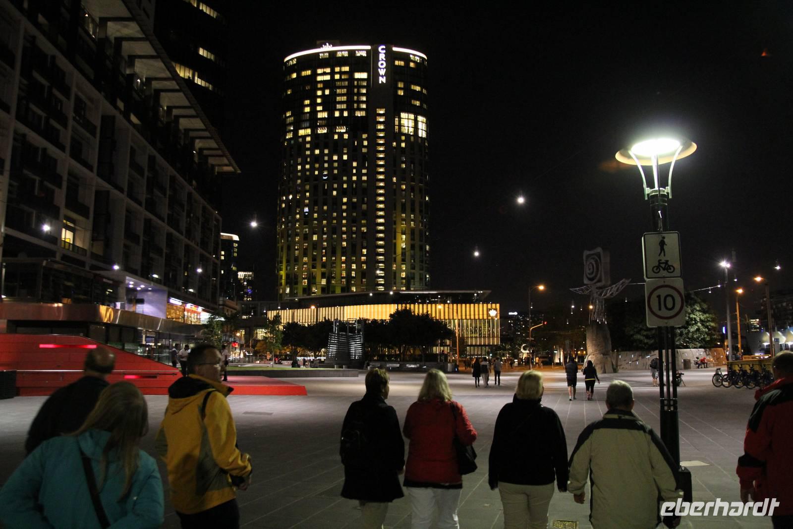 Nachdem wir alle unsere Gepäck hatten war die Mittagszeit schon fast ran, doch es stand auch eine Stadtrundfahrt mit auf dem Plan, die den Tagesablauf doch etwas stressig gestaltete, aber Ausruhen konnten wir uns ja auf dem Flug. Zunächst ging es direkt ins Zentrum vom Melbourne hinein, denn bevor wir hier unser Hotel beziehen können, ist es Abend und dann sind die Geschäfte schon geschlossen. Also stürzten wir uns hinein ins Getümmel und machten die Geschäfts-Arkaden unsicher. Viel Zeit war nicht, aber einen kleinen Einblick konnten wir zumindest gewinnen, bevor wir weiter zum Albertpark fuhren. Auch hier fanden wir Anzeichen von der bekannten Grand-Prix-Strecke von Melbourne. Zum Mittagessen fuhren wir dann in den Stadtteil St. Kilda, welcher direkt am Strand liegt und auch als Naherholungsgebiet für die Einwohner von Melbourne gilt. Im Restaurant Pamish wurden wir dann zum späteren Mittag bei einem 3-Gänge-Menü versorgt.