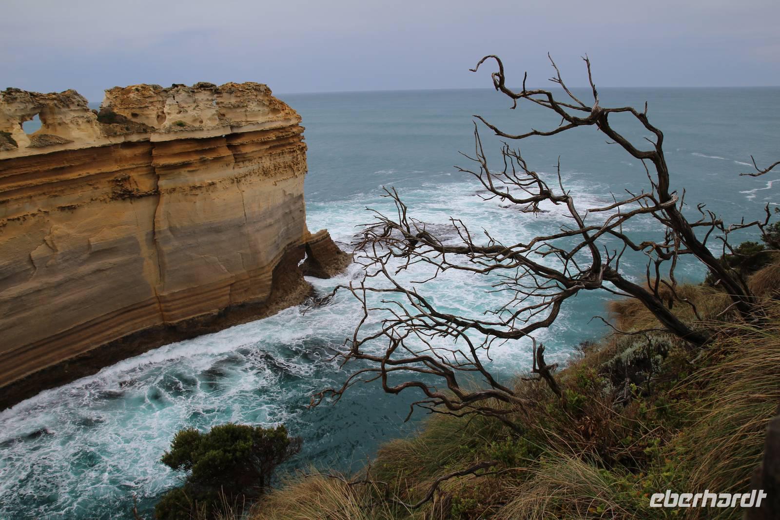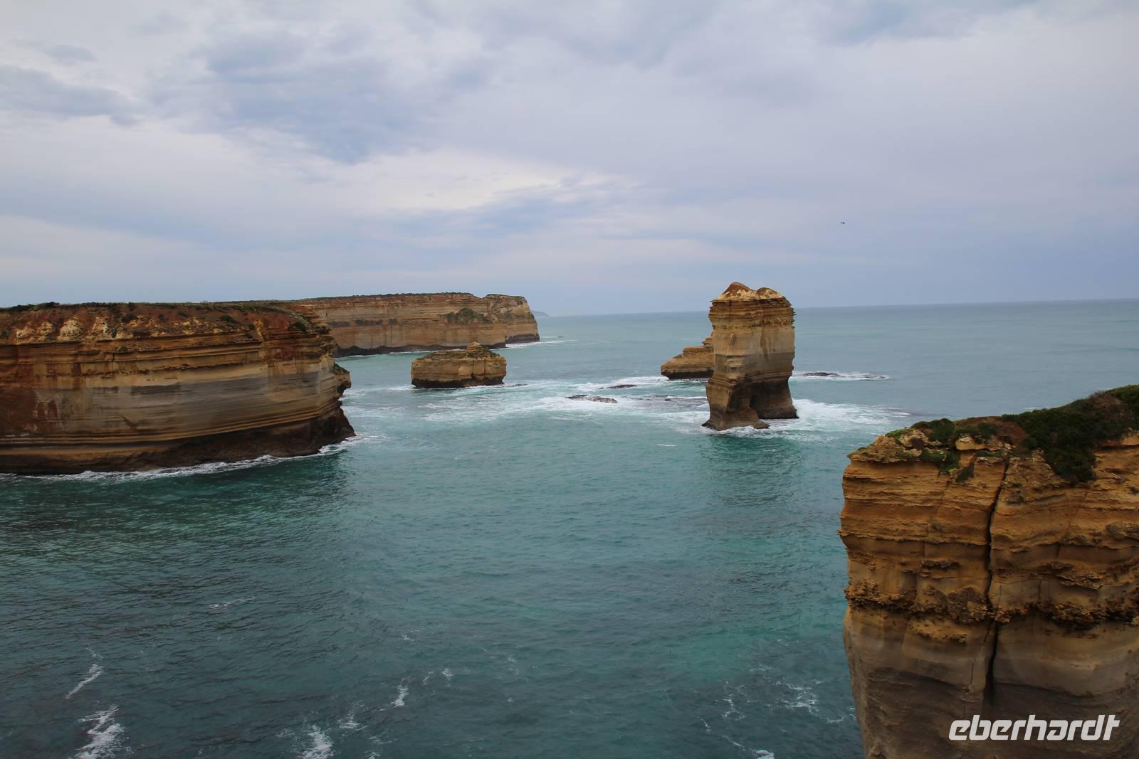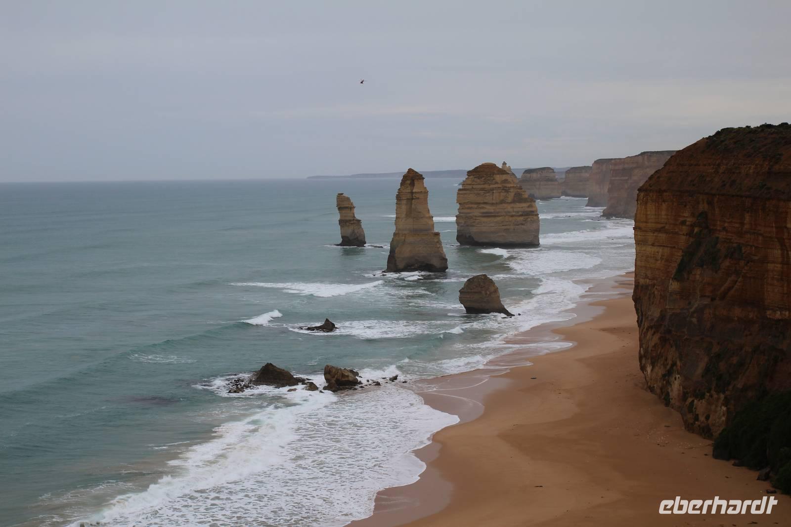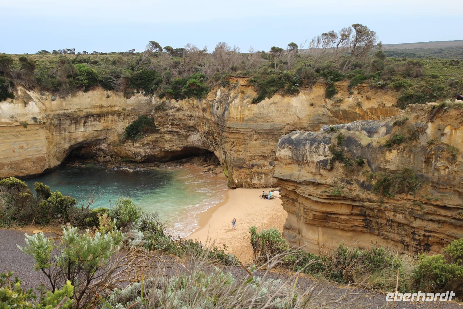 Weiter entlang der Küstenstraße ging es dann zunächst nach Apollo Bay, wo wir im Apollo Bay Hotel gegessen haben. Leider zwischen vielen anderen Gruppen, die auch Ihren Stopp hier einlegten. Nach dem Mittag ging es dann weiter zu den 12 Aposteln, natürlich auch wieder Felsformationen, wo sich jemand eine entsprechende Geschichte überlegt hat. Auch wenn das Wetter nach wie vor nicht so besonders war, unsere Fotoapparate haben die Momente dennoch alle festgehalten. Aber auf den Fotos wird das eine ganz andere Wirkung haben als live vor Ort. Für die fleißigen unter uns ging es dann noch hinab in die Schlucht Loch Ard Gorge, wo wir auch einen kleinen Strand hatten, aber das Wetter war heute ja nicht gerade zum Baden geeignet.