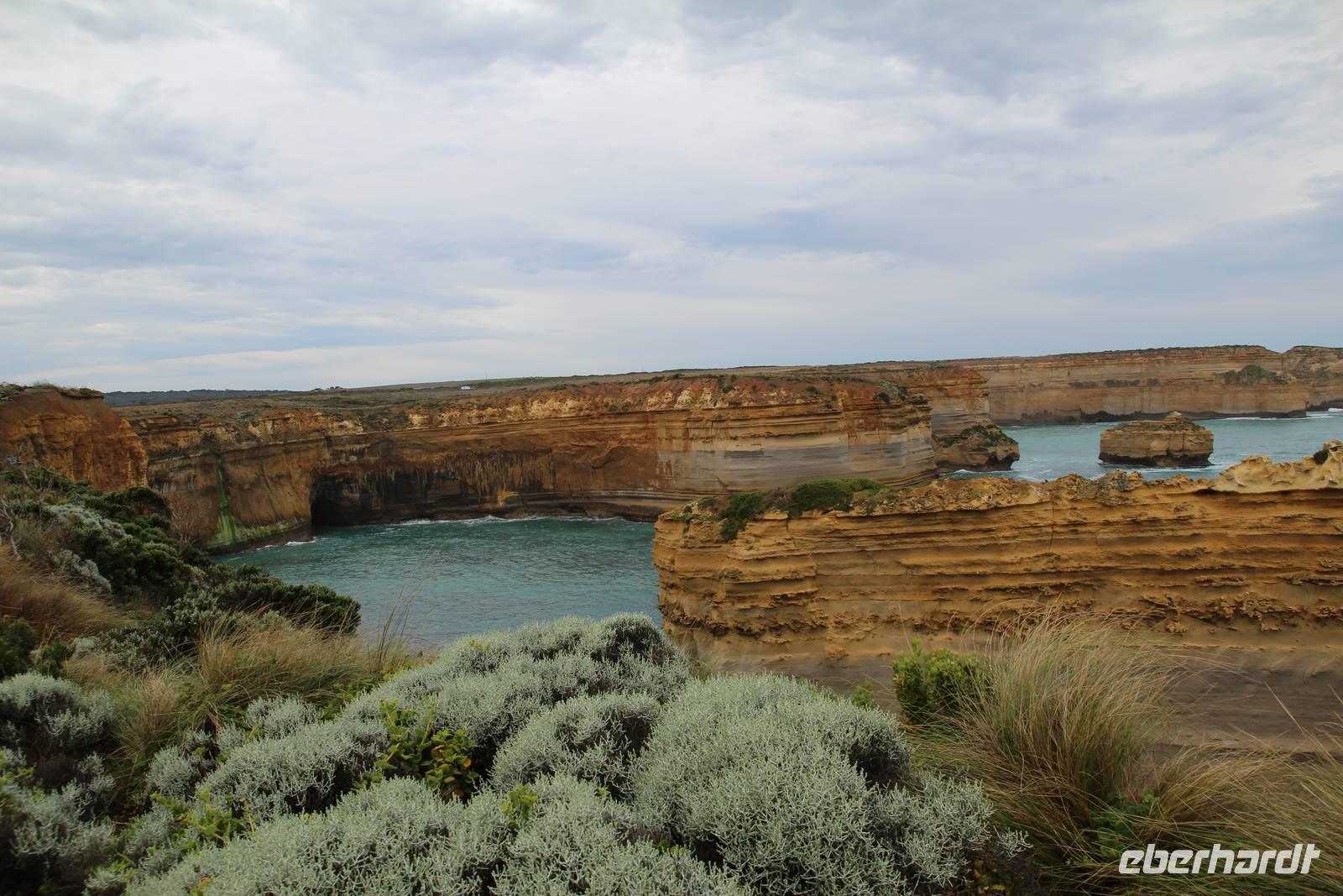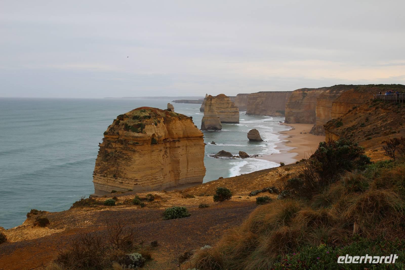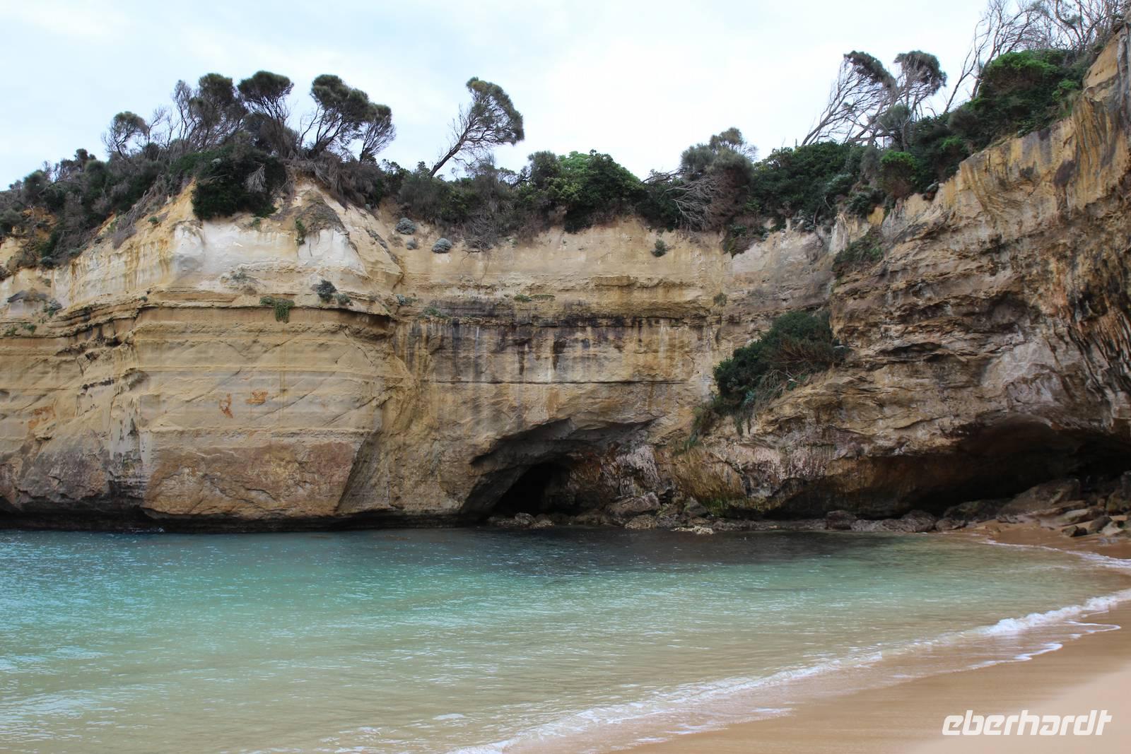Weiter entlang der Küstenstraße ging es dann zunächst nach Apollo Bay, wo wir im Apollo Bay Hotel gegessen haben. Leider zwischen vielen anderen Gruppen, die auch Ihren Stopp hier einlegten. Nach dem Mittag ging es dann weiter zu den 12 Aposteln, natürlich auch wieder Felsformationen, wo sich jemand eine entsprechende Geschichte überlegt hat. Auch wenn das Wetter nach wie vor nicht so besonders war, unsere Fotoapparate haben die Momente dennoch alle festgehalten. Aber auf den Fotos wird das eine ganz andere Wirkung haben als live vor Ort. Für die fleißigen unter uns ging es dann noch hinab in die Schlucht Loch Ard Gorge, wo wir auch einen kleinen Strand hatten, aber das Wetter war heute ja nicht gerade zum Baden geeignet.