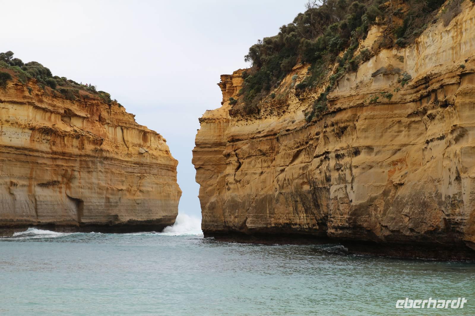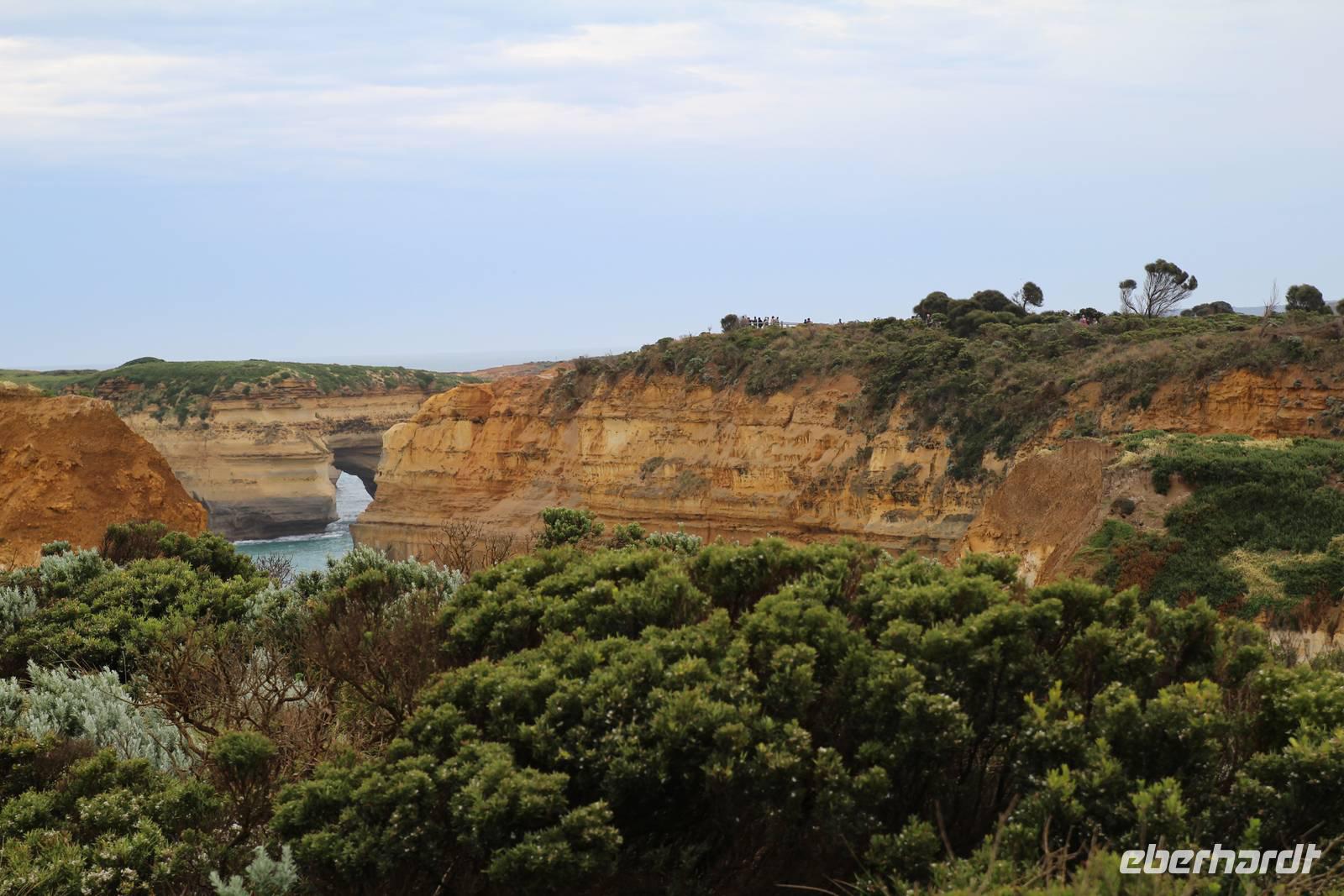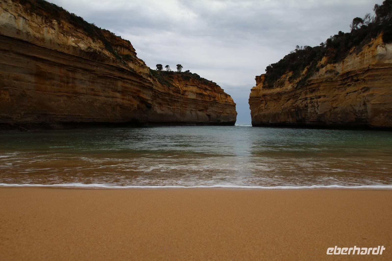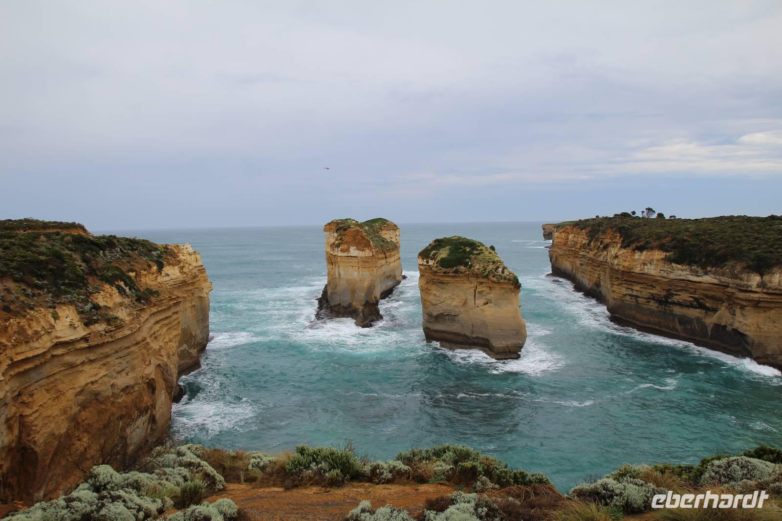 Weiter entlang der Küstenstraße ging es dann zunächst nach Apollo Bay, wo wir im Apollo Bay Hotel gegessen haben. Leider zwischen vielen anderen Gruppen, die auch Ihren Stopp hier einlegten. Nach dem Mittag ging es dann weiter zu den 12 Aposteln, natürlich auch wieder Felsformationen, wo sich jemand eine entsprechende Geschichte überlegt hat. Auch wenn das Wetter nach wie vor nicht so besonders war, unsere Fotoapparate haben die Momente dennoch alle festgehalten. Aber auf den Fotos wird das eine ganz andere Wirkung haben als live vor Ort. Für die fleißigen unter uns ging es dann noch hinab in die Schlucht Loch Ard Gorge, wo wir auch einen kleinen Strand hatten, aber das Wetter war heute ja nicht gerade zum Baden geeignet.
