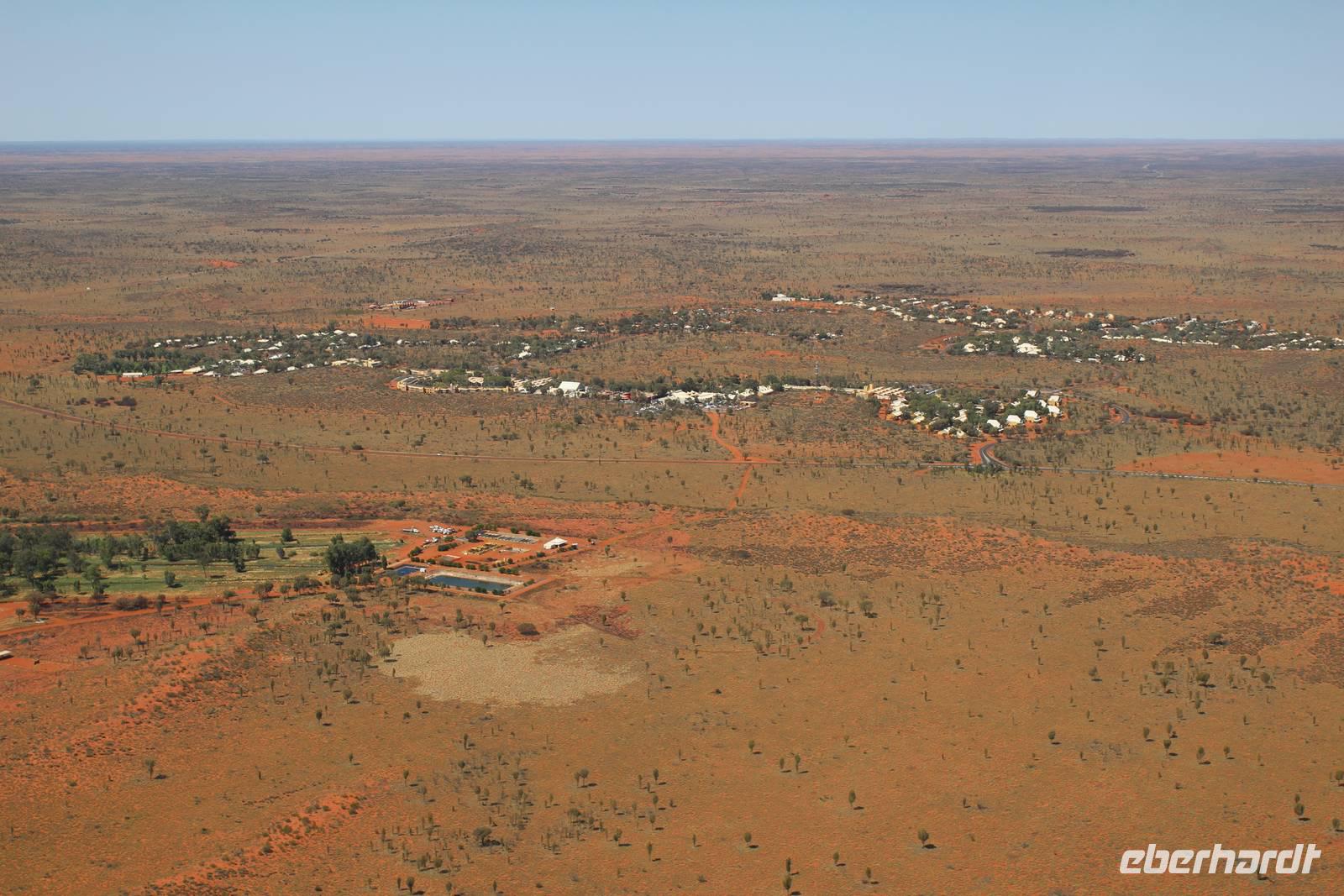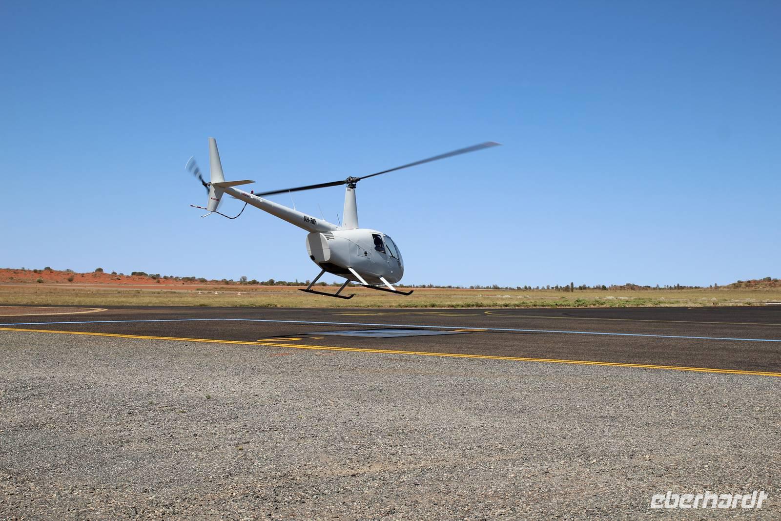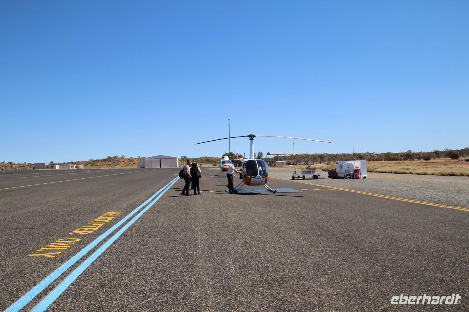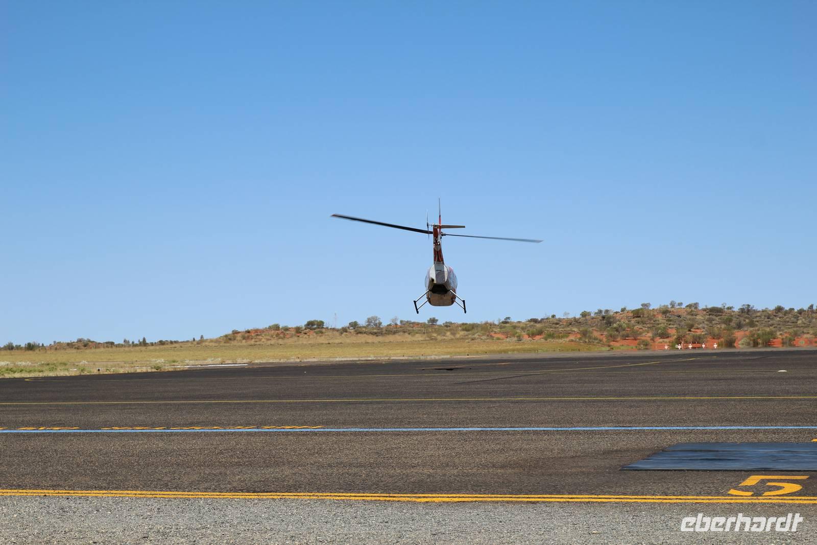 Vom Flughafen ging es zunächst zum Ayers Rock Ressort, wo wir unsere Mittagspause machten und auch mit für Verpflegung für die kommenden Tage sorgten. Viele kauften sich auch gleich ein Fliegennetz für den Kopf, denn die Fliegen waren hier doch etwas nervig, da sie sich ständig im Gesicht niederließen. Einige nahmen aber auch den Kampf mit Ihnen auf und blieben „netzlos". Auch sammelte sich hier dann eine größere Gruppe an Interessenten für einen Heli-Flug zum Ayers Rock. Insgesamt nahmen 12 Personen von uns teil an diesem besonderen Erlebnis und wir hatten auch Glück, dass wir dann gleich starten konnten. Der Rest konnte schon zum Hotel fahren, leider waren aber hier die Zimmer noch nicht fertig und auch mit den Getränken war das ohne Zimmer nicht ganz so einfach. Für die Heli-Gäste ging es immer in jeweils zwei 3er Grüppchen dann los per Helikopter zum Ayers Rock. Im Nachhinein wird das sicherlich keiner bereuen, gemacht zu haben, denn wir hatten dadurch einen ganz anderen Blick auf den heiligen Berg der Aborigines.