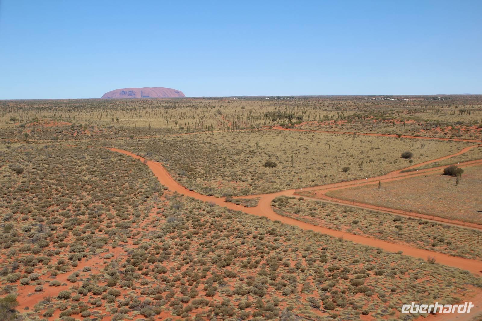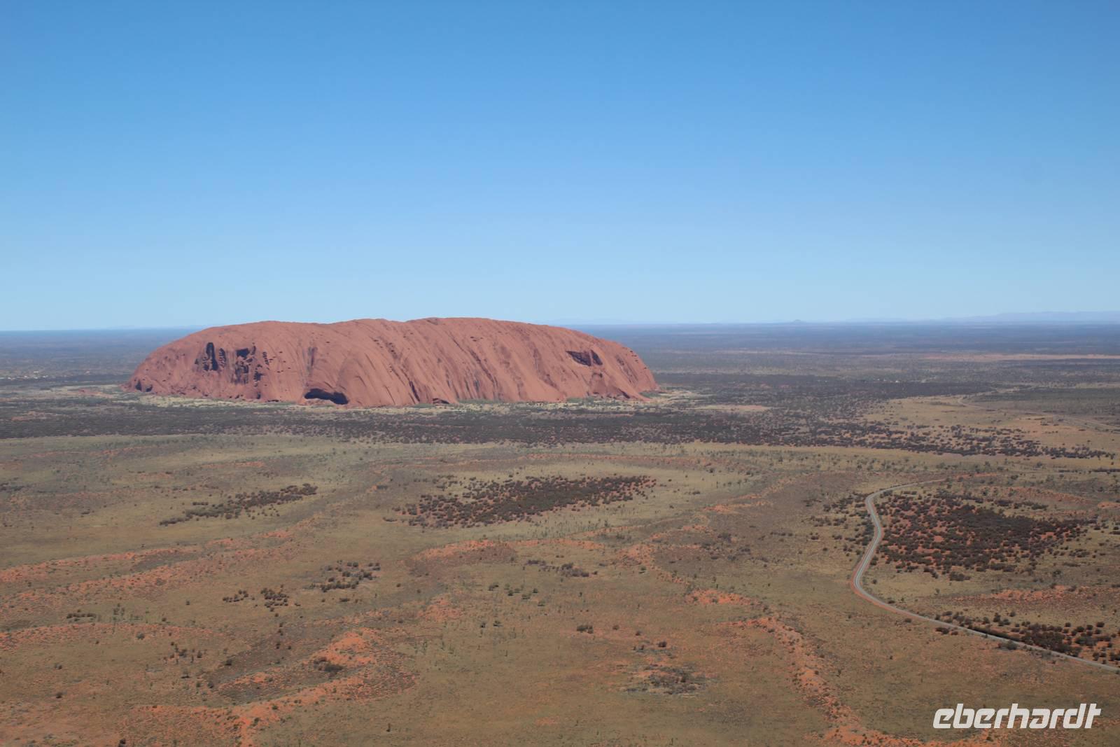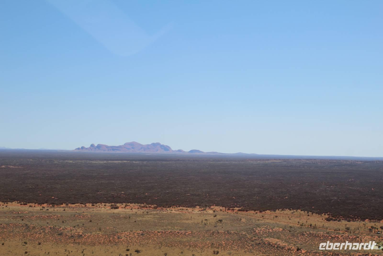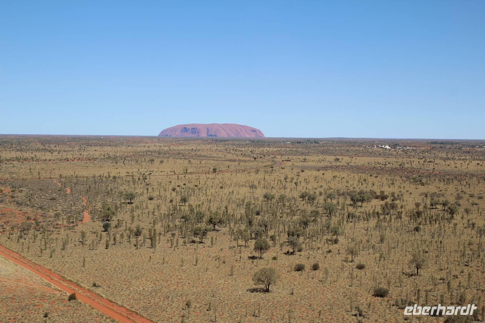 Vom Flughafen ging es zunächst zum Ayers Rock Ressort, wo wir unsere Mittagspause machten und auch mit für Verpflegung für die kommenden Tage sorgten. Viele kauften sich auch gleich ein Fliegennetz für den Kopf, denn die Fliegen waren hier doch etwas nervig, da sie sich ständig im Gesicht niederließen. Einige nahmen aber auch den Kampf mit Ihnen auf und blieben „netzlos". Auch sammelte sich hier dann eine größere Gruppe an Interessenten für einen Heli-Flug zum Ayers Rock. Insgesamt nahmen 12 Personen von uns teil an diesem besonderen Erlebnis und wir hatten auch Glück, dass wir dann gleich starten konnten. Der Rest konnte schon zum Hotel fahren, leider waren aber hier die Zimmer noch nicht fertig und auch mit den Getränken war das ohne Zimmer nicht ganz so einfach. Für die Heli-Gäste ging es immer in jeweils zwei 3er Grüppchen dann los per Helikopter zum Ayers Rock. Im Nachhinein wird das sicherlich keiner bereuen, gemacht zu haben, denn wir hatten dadurch einen ganz anderen Blick auf den heiligen Berg der Aborigines.