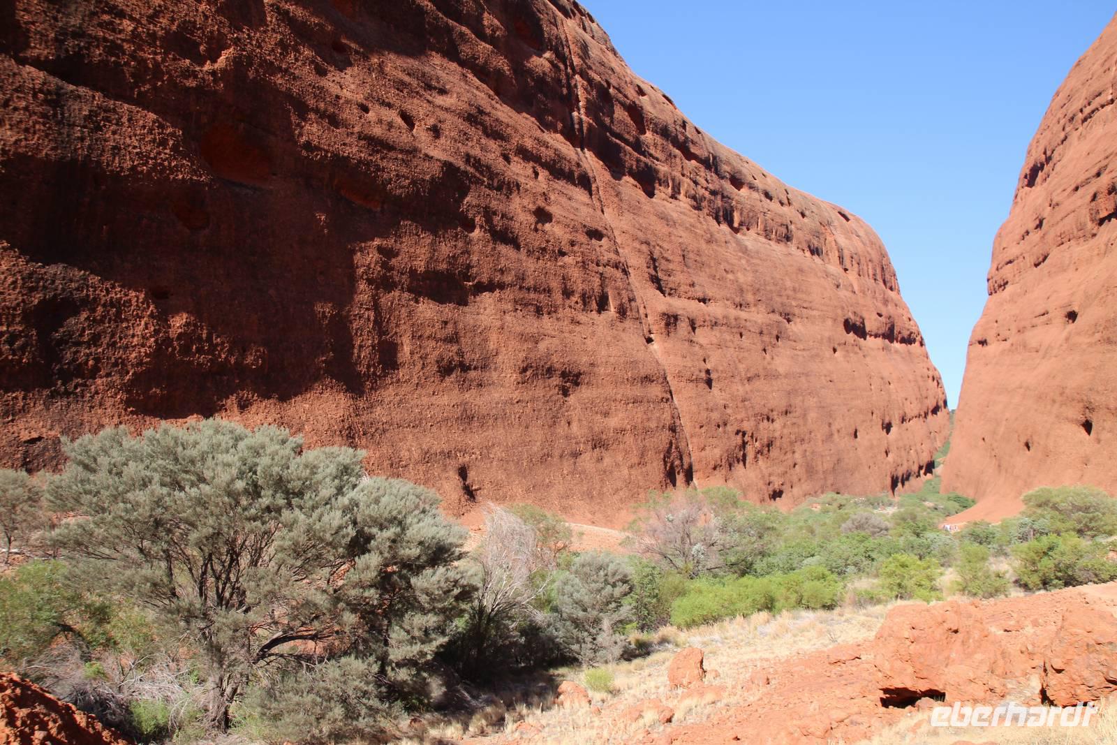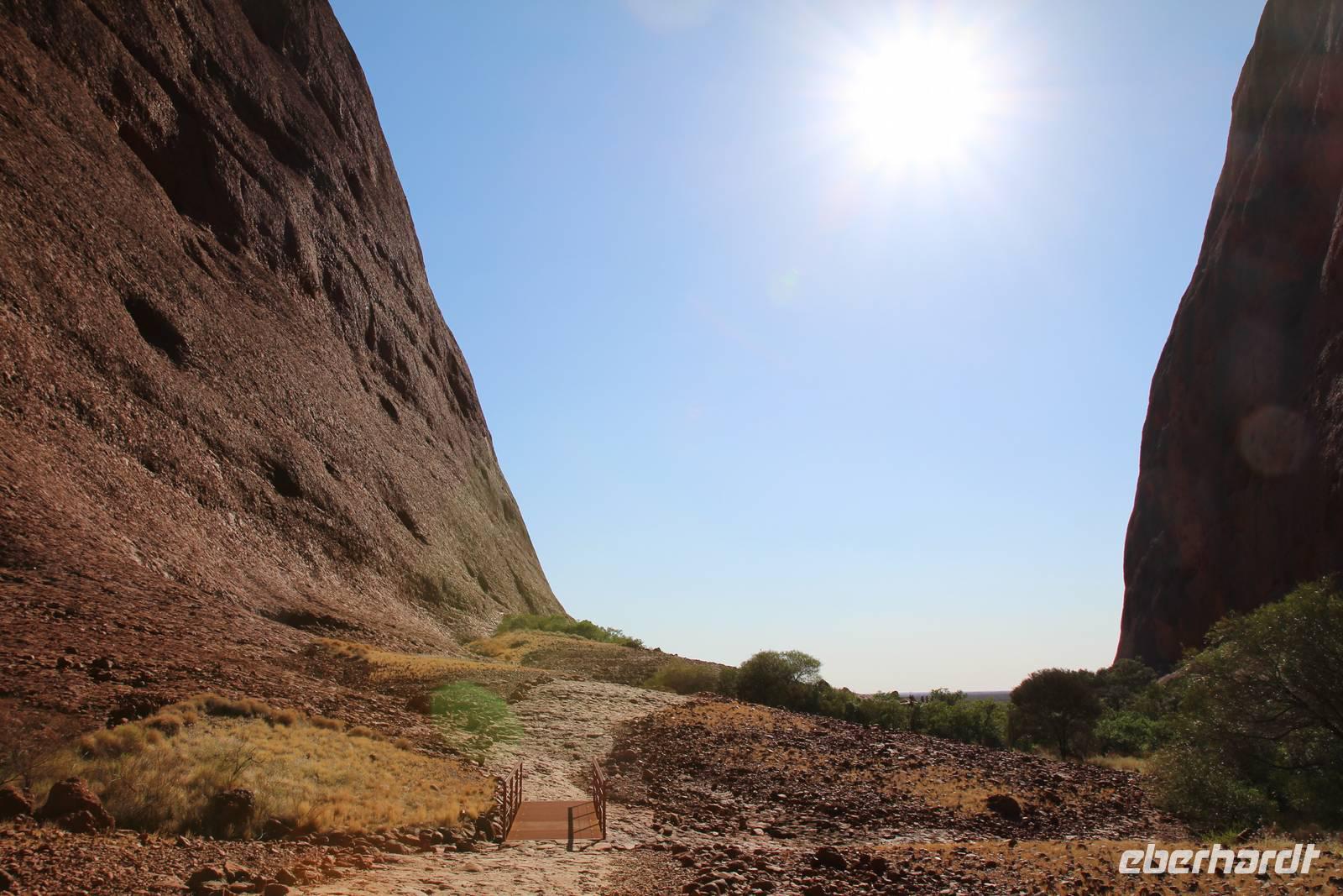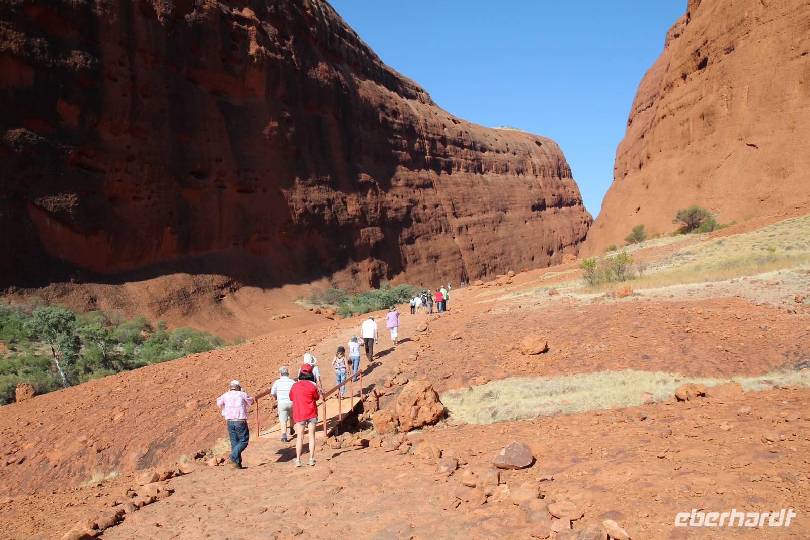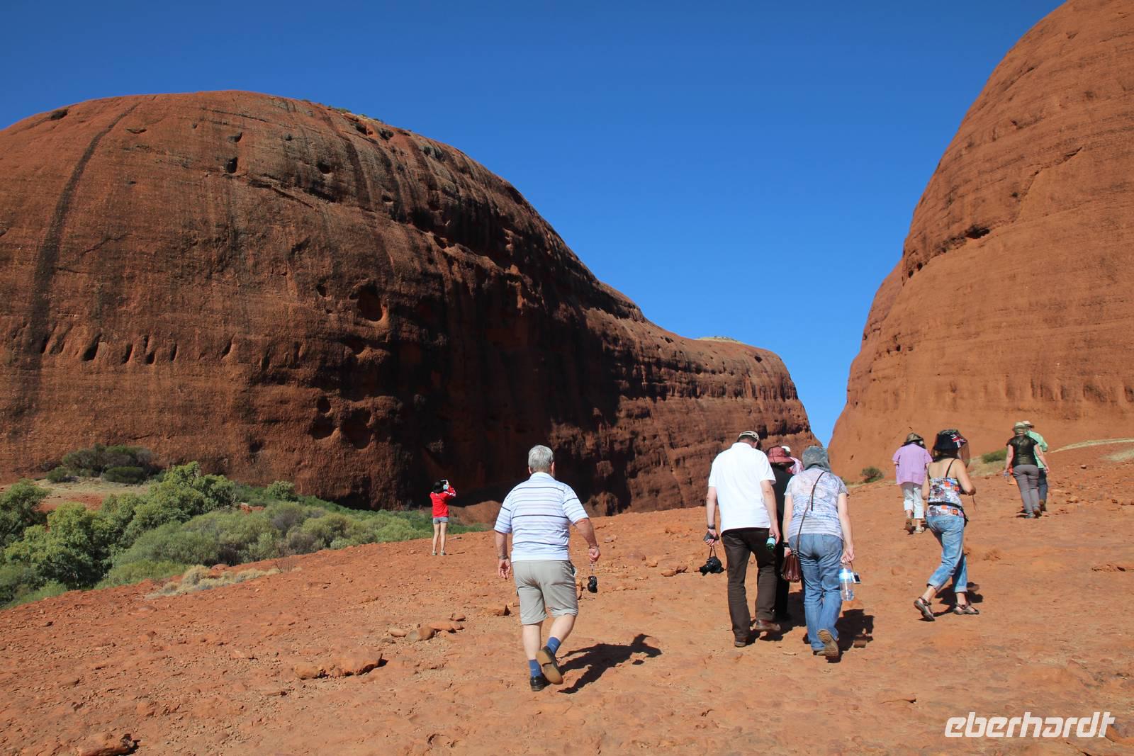 Nach unserem Abenteuer wurden wir vom Helikopter-Unternehmen dann auch zum Hotel gebracht, wo wir aber dann nur den Bus wechselten und es schon weiter ging. Unsere Busfahrerin Mel, die uns gemeinsam mit unserer Reiseleiterin Adrienne hier begleitete, nahmen uns hinein in den Nationalpark „Kata Tjuta Uluru". Den Uluru, wie der Ayers Rock auch genannt wird, ließen wir zunächst links liegen, denn es ging zum Kata Tjuta, eine Gruppe von mehrere Felsbergen, von denen der höchste 564 Meter aus dem Boden herausragt. Wasser war von nun an wichtig, denn die Temperaturen hier lagen durchaus bei über 35°C und das ohne großartige Schattenspender. Auf unserer Wanderung durfte daher auch keiner ohne Wasserflasche mit und das war auch gut so. Zwischen den Felsen liefen wir einen kleinen Pfad und blickten beeindruckt an den roten Wänden hinauf. Verwunderlich, wie diese hier mitten im weiten ebenen Land entstanden sind.