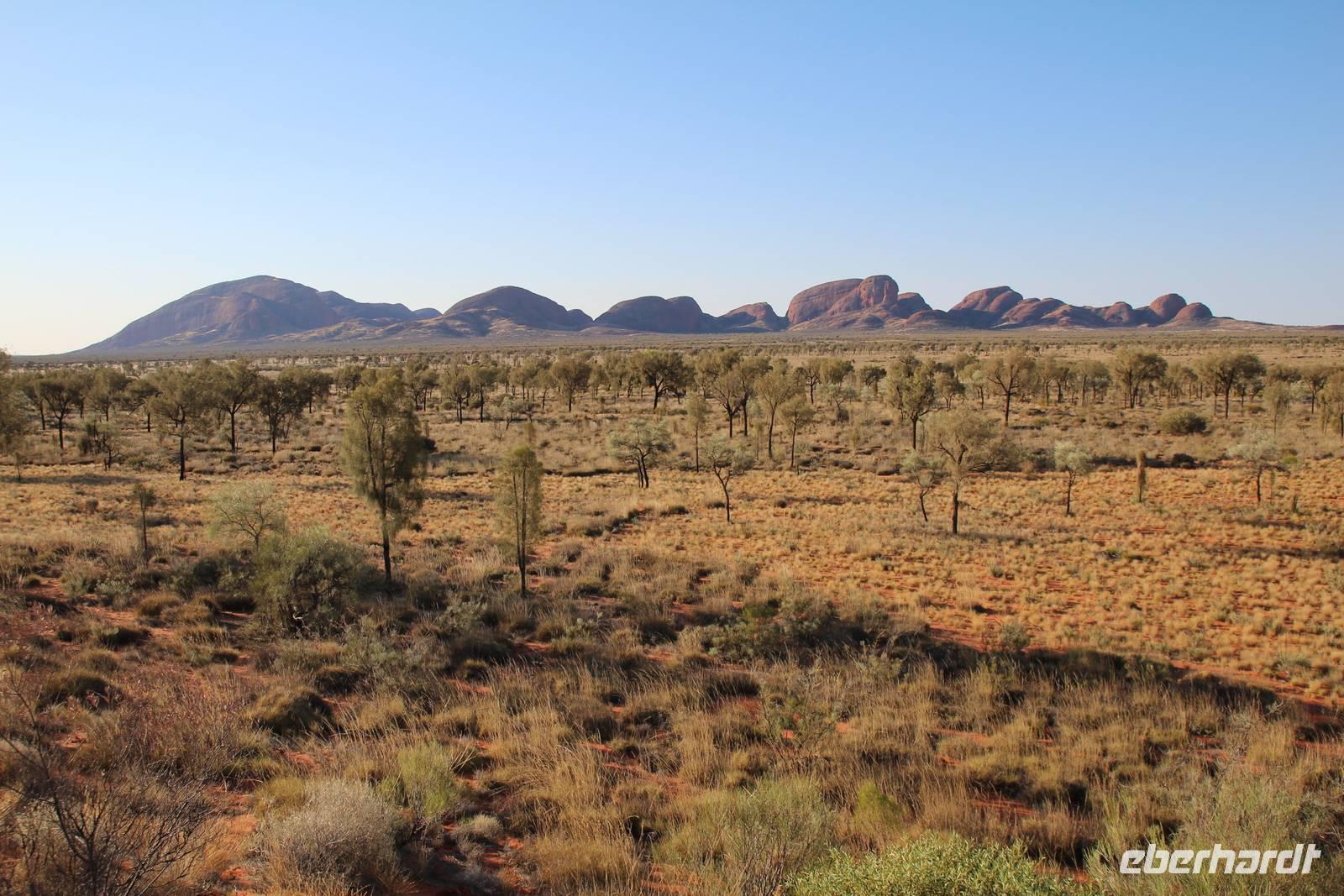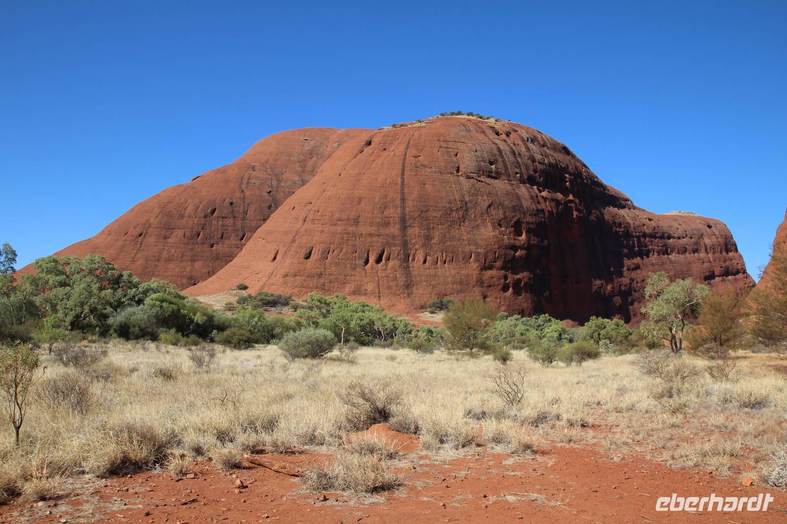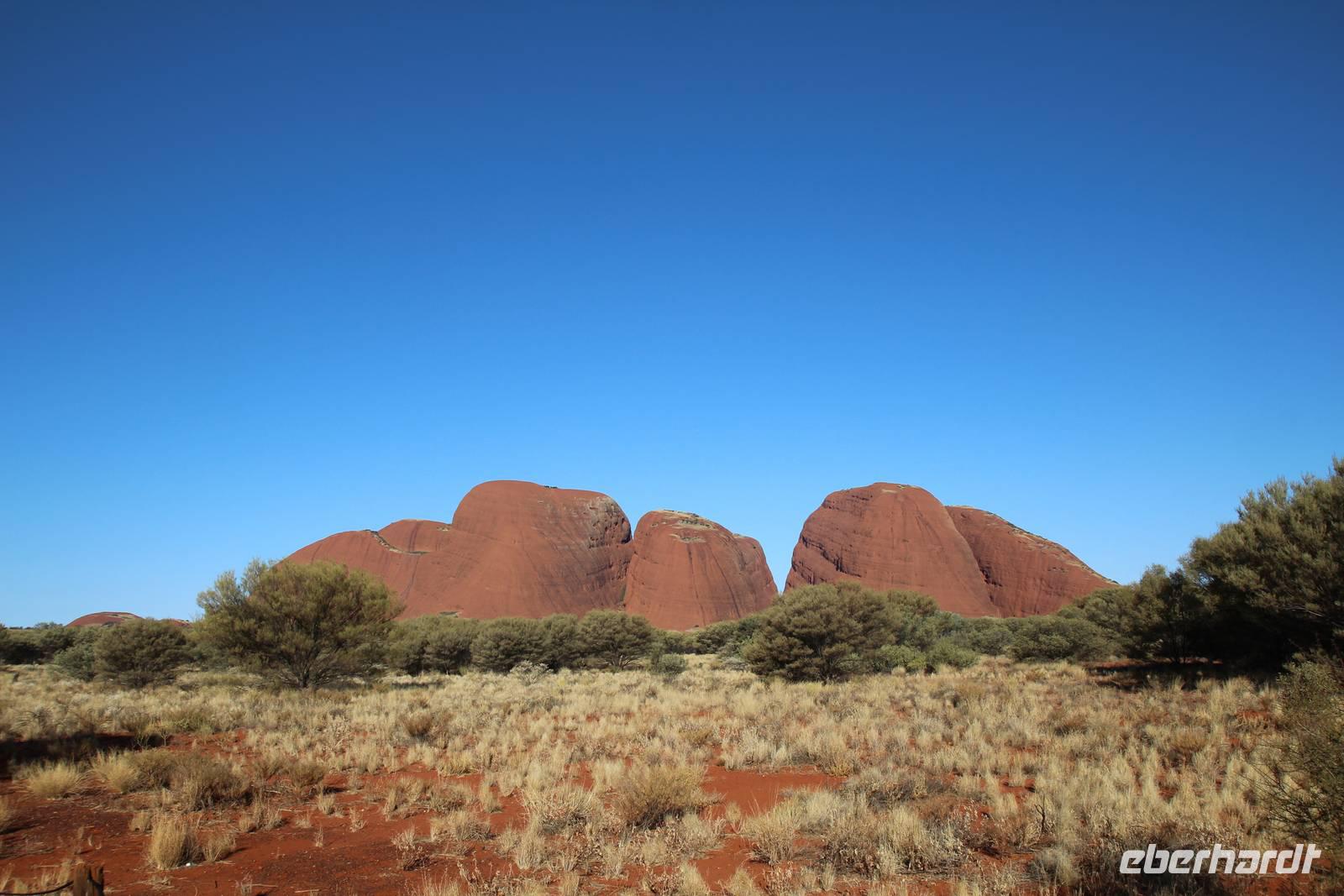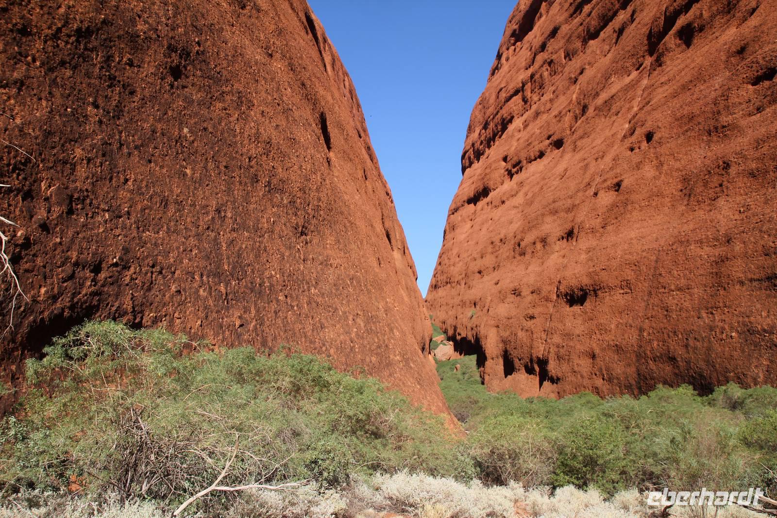 Nach unserem Abenteuer wurden wir vom Helikopter-Unternehmen dann auch zum Hotel gebracht, wo wir aber dann nur den Bus wechselten und es schon weiter ging. Unsere Busfahrerin Mel, die uns gemeinsam mit unserer Reiseleiterin Adrienne hier begleitete, nahmen uns hinein in den Nationalpark „Kata Tjuta Uluru". Den Uluru, wie der Ayers Rock auch genannt wird, ließen wir zunächst links liegen, denn es ging zum Kata Tjuta, eine Gruppe von mehrere Felsbergen, von denen der höchste 564 Meter aus dem Boden herausragt. Wasser war von nun an wichtig, denn die Temperaturen hier lagen durchaus bei über 35°C und das ohne großartige Schattenspender. Auf unserer Wanderung durfte daher auch keiner ohne Wasserflasche mit und das war auch gut so. Zwischen den Felsen liefen wir einen kleinen Pfad und blickten beeindruckt an den roten Wänden hinauf. Verwunderlich, wie diese hier mitten im weiten ebenen Land entstanden sind.