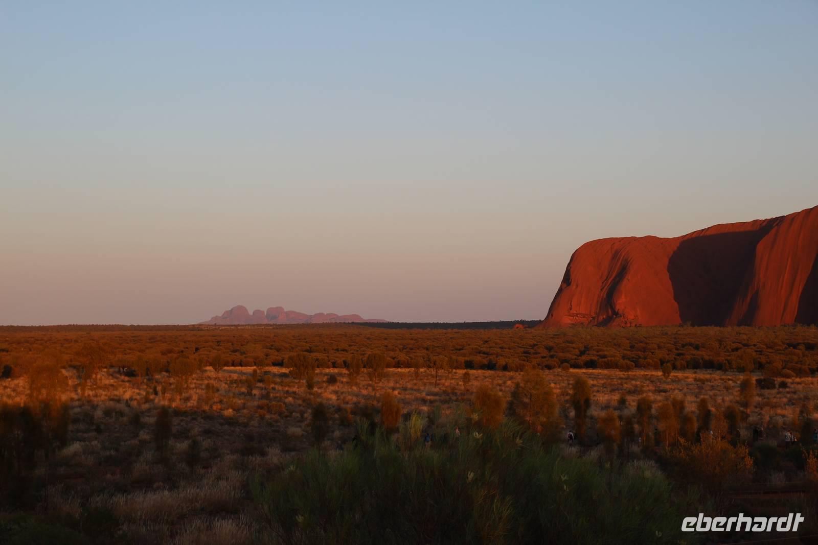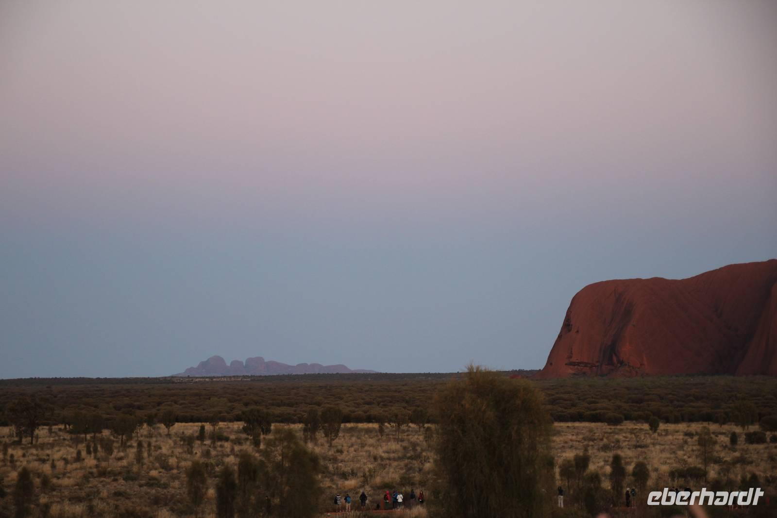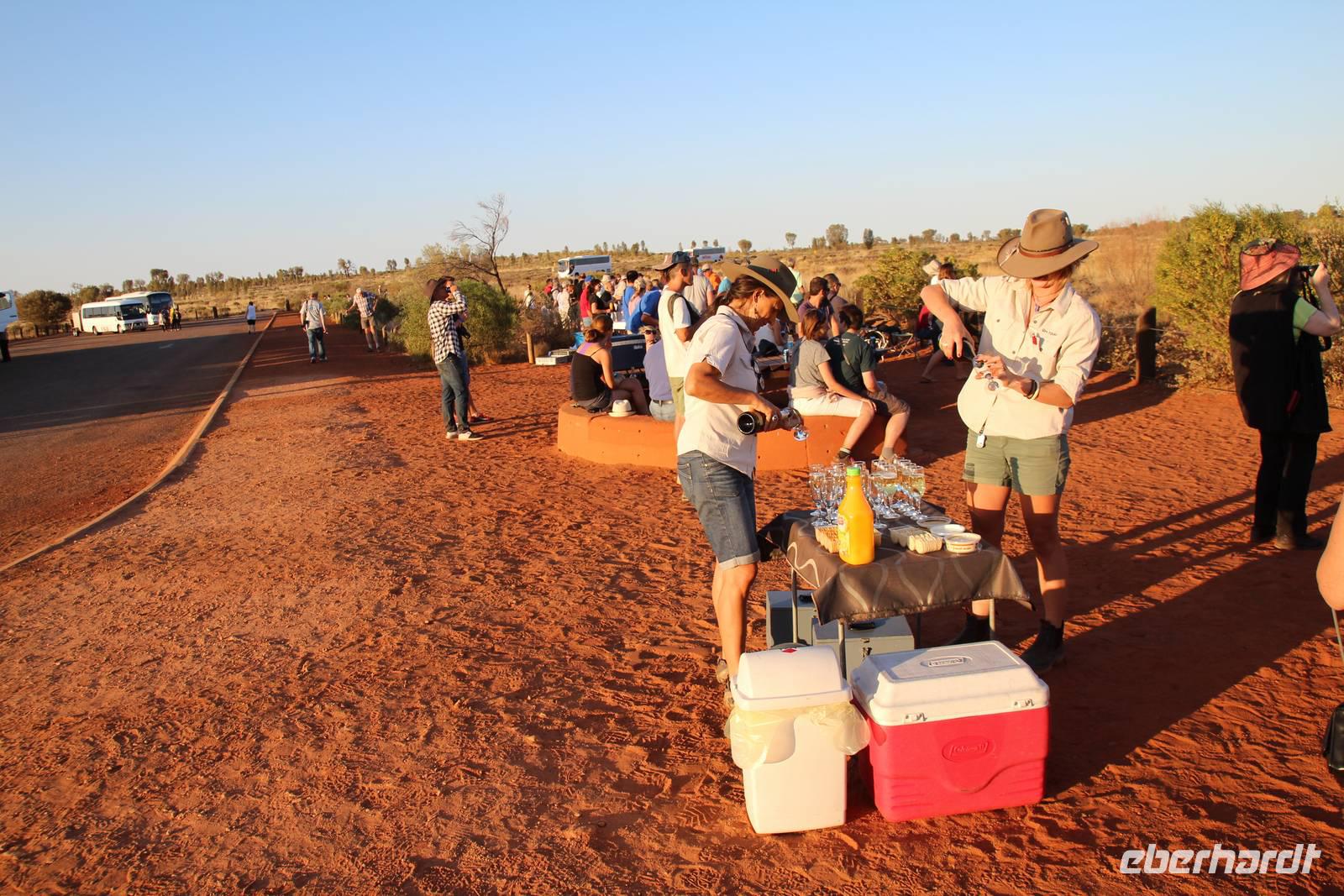 Nach unserer Wanderung hieß es dann nicht großartig zu Trödeln, denn die Sonne würde nicht auf uns warten. Am Ayers Rock angekommen, suchten wir uns dann ein Plätzchen zwischen anderen Gruppen, um dem Sonnenuntergang beizuwohnen. Verwöhnt wurden wir dabei von Adrienne und Mel, die uns mit Sekt, Saft und kleineren Snack überraschten, während wir das Farbenspiel am Ayers Rock verfolgten. Nachdem die Sonne dann verschwunden war, ging es zu unserem Hotel Outback Pioneer Resort, wo es dann natürlich schon dunkel war. Den Abend ließen wir dann bei einem typisch-australischen Barbecue ausklingen. Wir suchten aus einer Auswahl an Fleisch unsere Wunschsorte und mussten Steak und Wurst dann selbst grillen. Definitiv ein besonderes Erlebnis, auch wenn uns der lange Tag anzusehen war.