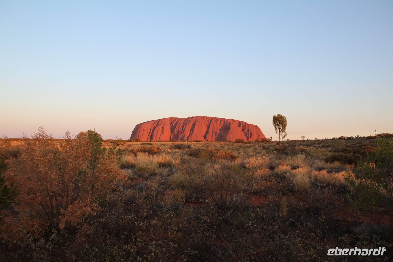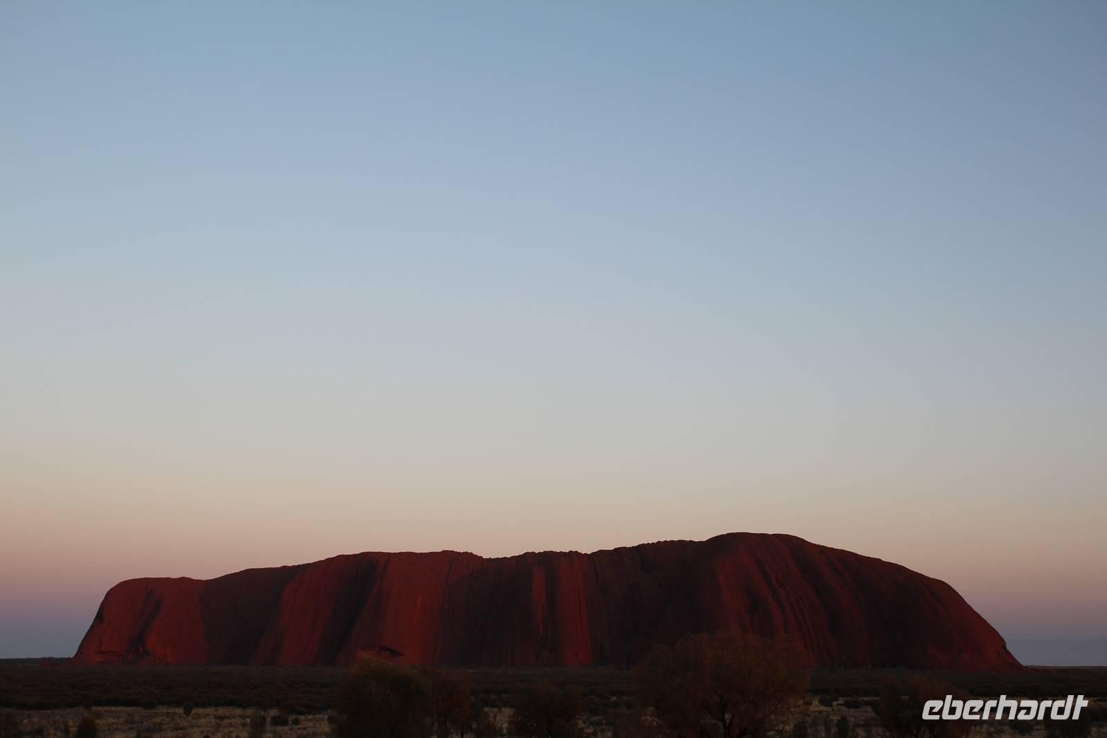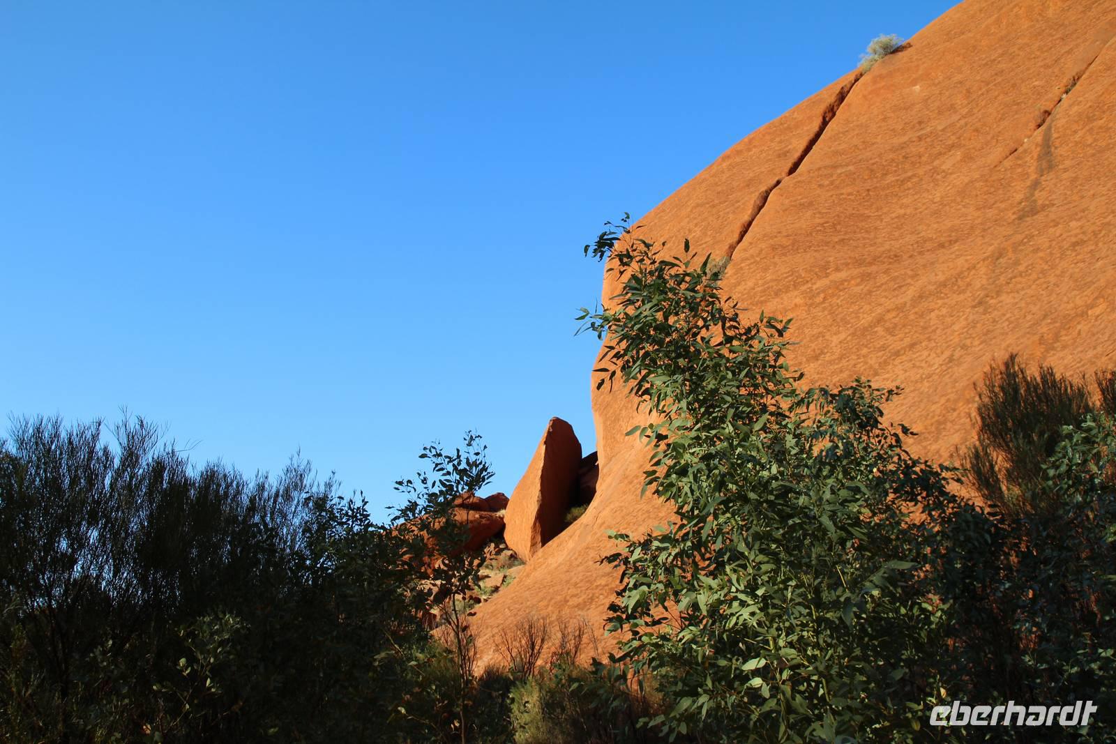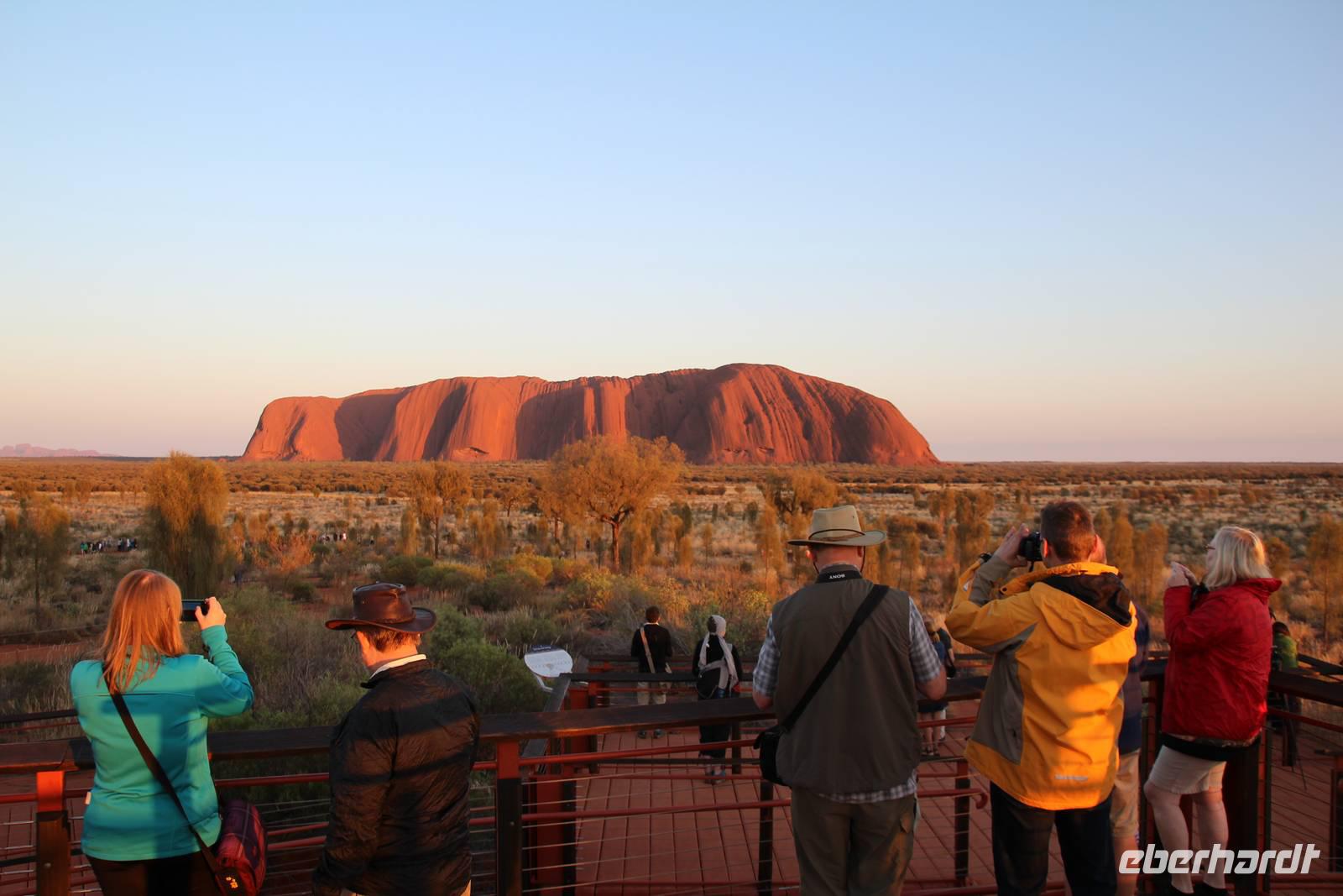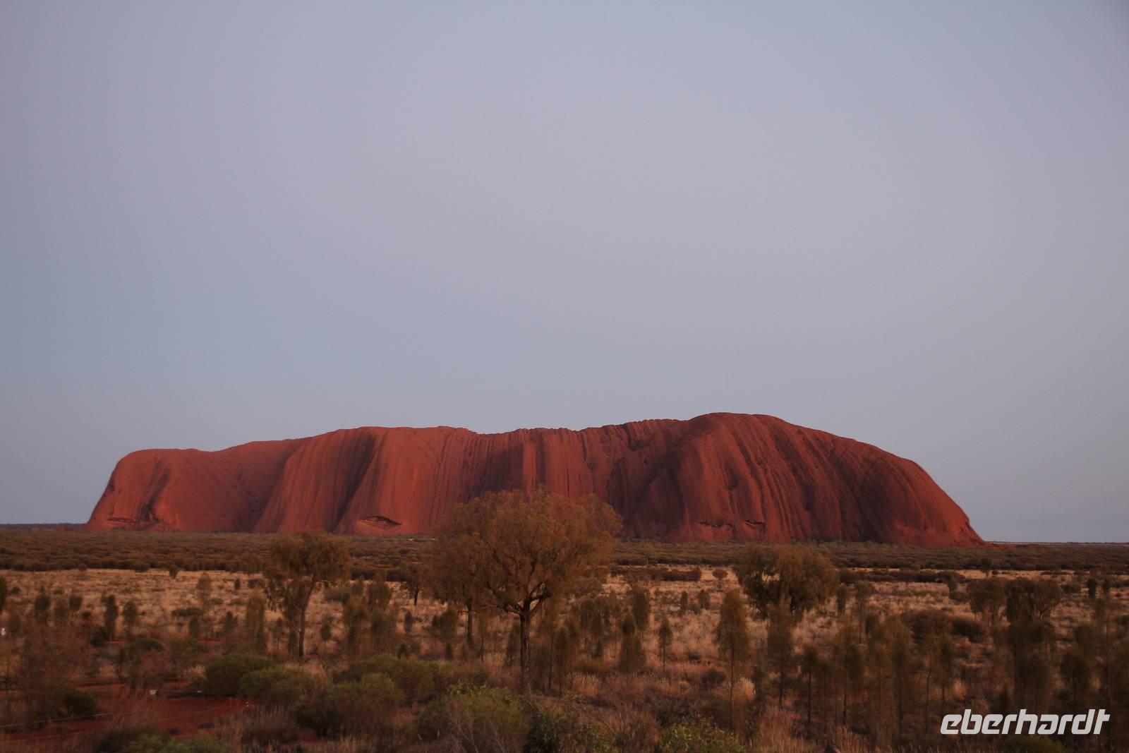 Der Tag startete wieder früh, denn nach einem Sonnenuntergang folgt ein Sonnenaufgang. Wenn wir schon mal hier sind, nehmen wir auch diesen mit. Im Dunkeln wurden wir also wieder eingesammelt und auf die andere Seite des Uluru gebracht. Auch hier erlebten wir während des Sonnenaufgangs wieder ein tolles Farbenspiel. Dabei war es doch noch recht frisch, so dass sich eine Jacke doch recht gut tat. Nach dem Sonnenaufgang machten wir zunächst noch einen kleinen Spaziergang am Ayers Rock, bevor wir uns dann am Kulturzentrum einfanden, um zu frühstücken. Das Frühstück war dann leider nicht so richtig das, was wir uns vorgestellt hatten. Wir mussten es aber erstmal verkraften und nach kurzer Freizeit im Kulturzentrum ging es dann zu einer weiteren letzten Wanderung am Uluru. Diesen kann man theoretisch sogar besteigen, was aber nicht so gern gesehen wird, da es eben ein heiliger Ort für die Aborigines ist.