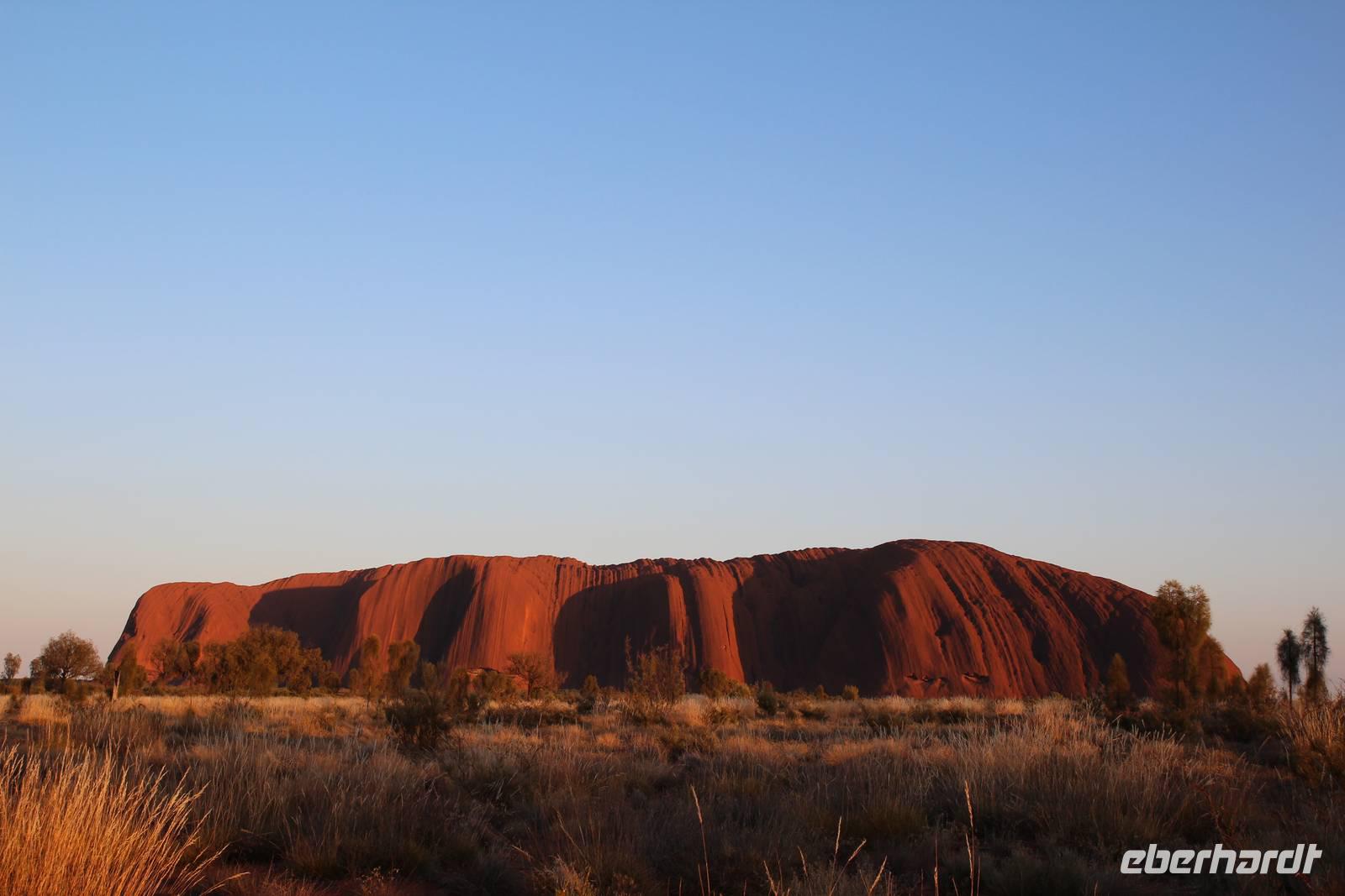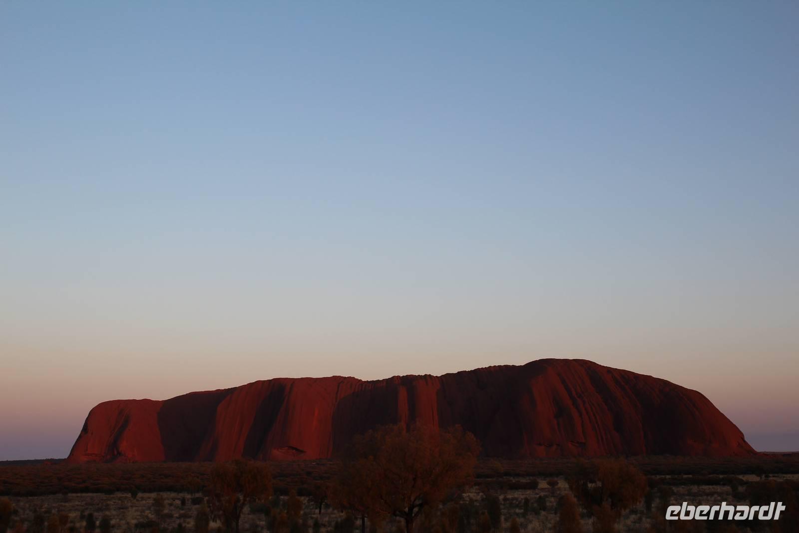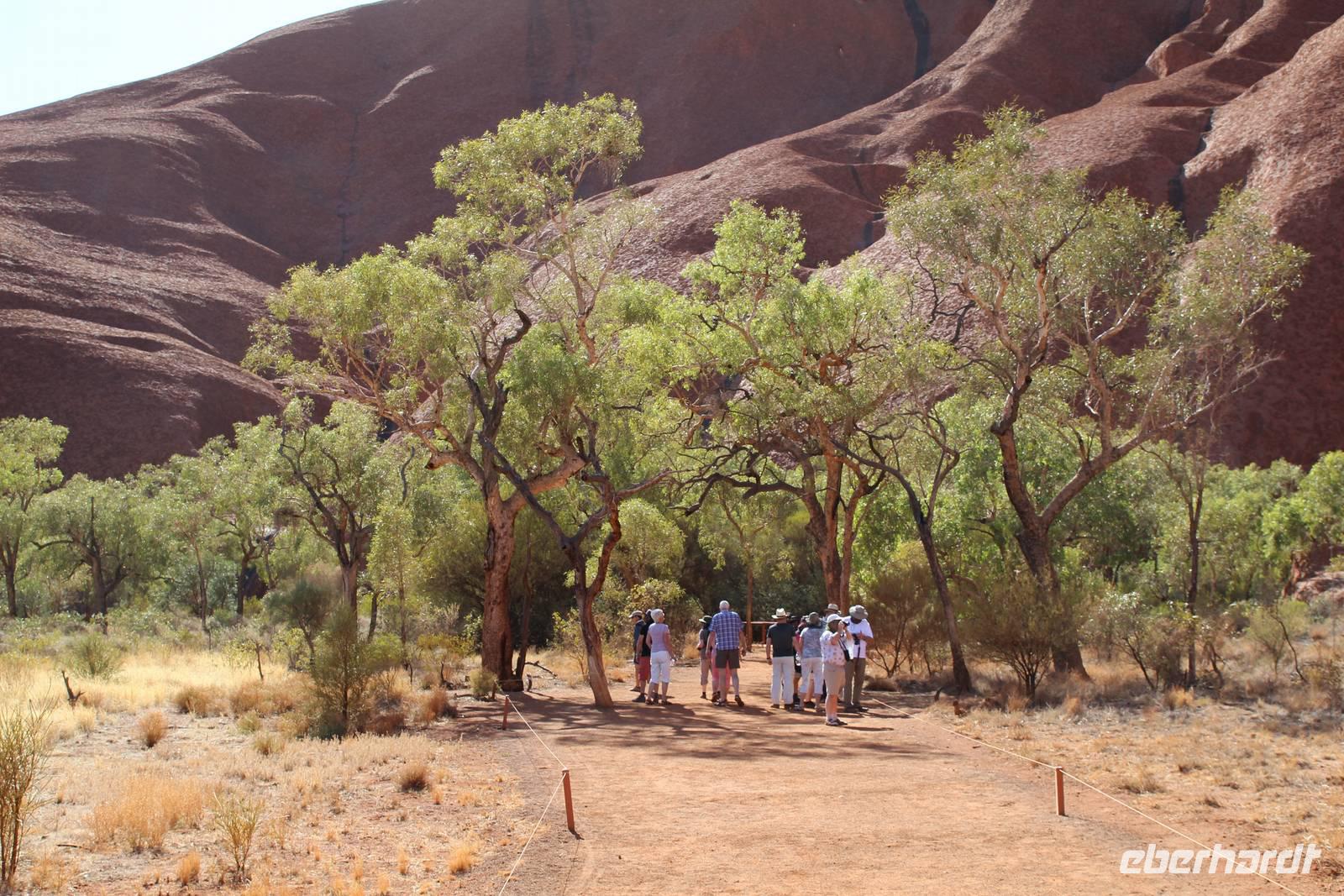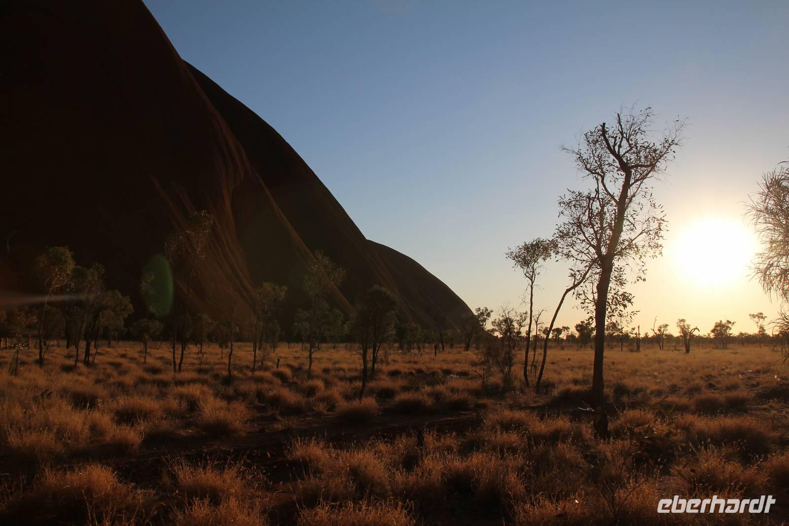 Der Tag startete wieder früh, denn nach einem Sonnenuntergang folgt ein Sonnenaufgang. Wenn wir schon mal hier sind, nehmen wir auch diesen mit. Im Dunkeln wurden wir also wieder eingesammelt und auf die andere Seite des Uluru gebracht. Auch hier erlebten wir während des Sonnenaufgangs wieder ein tolles Farbenspiel. Dabei war es doch noch recht frisch, so dass sich eine Jacke doch recht gut tat. Nach dem Sonnenaufgang machten wir zunächst noch einen kleinen Spaziergang am Ayers Rock, bevor wir uns dann am Kulturzentrum einfanden, um zu frühstücken. Das Frühstück war dann leider nicht so richtig das, was wir uns vorgestellt hatten. Wir mussten es aber erstmal verkraften und nach kurzer Freizeit im Kulturzentrum ging es dann zu einer weiteren letzten Wanderung am Uluru. Diesen kann man theoretisch sogar besteigen, was aber nicht so gern gesehen wird, da es eben ein heiliger Ort für die Aborigines ist.