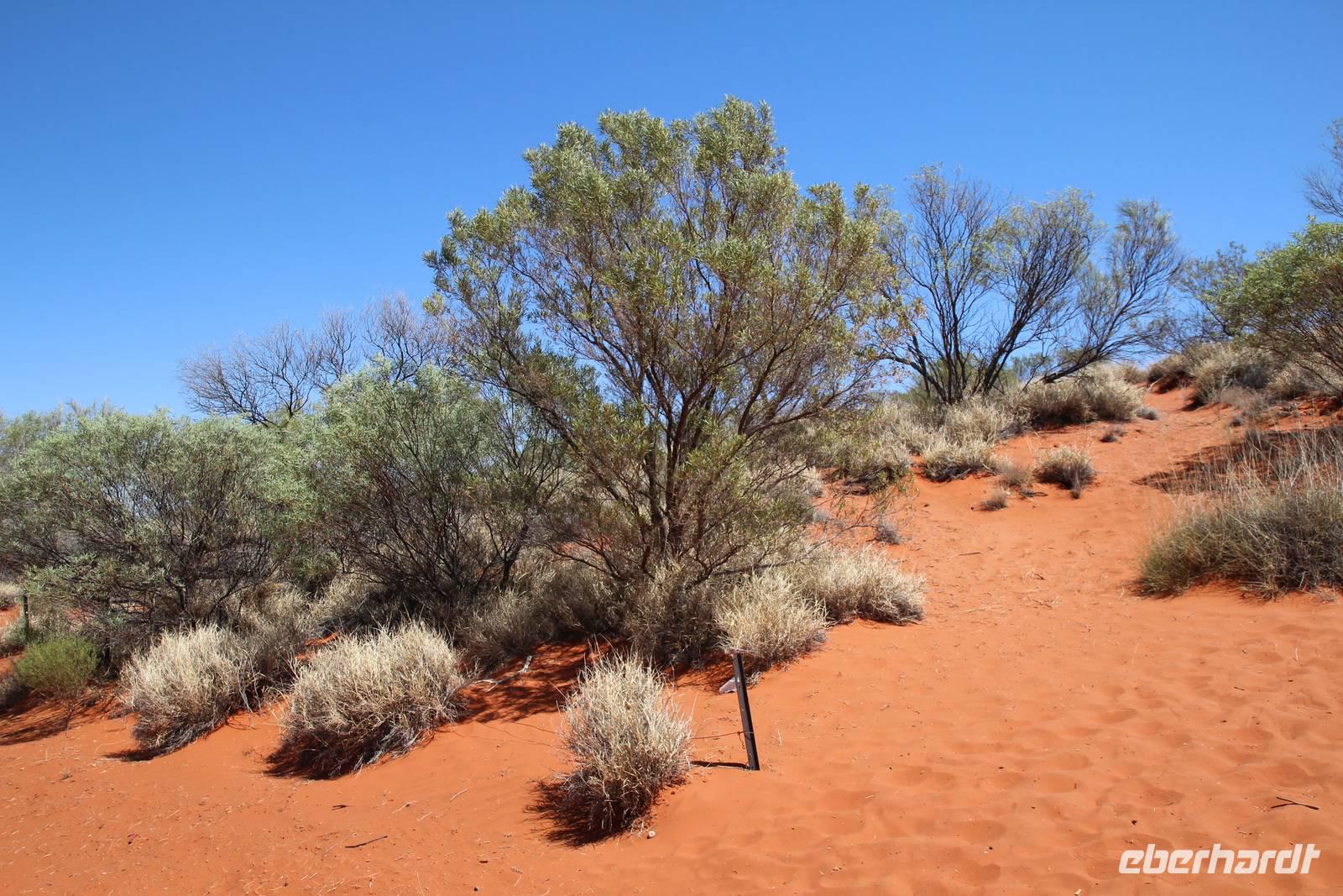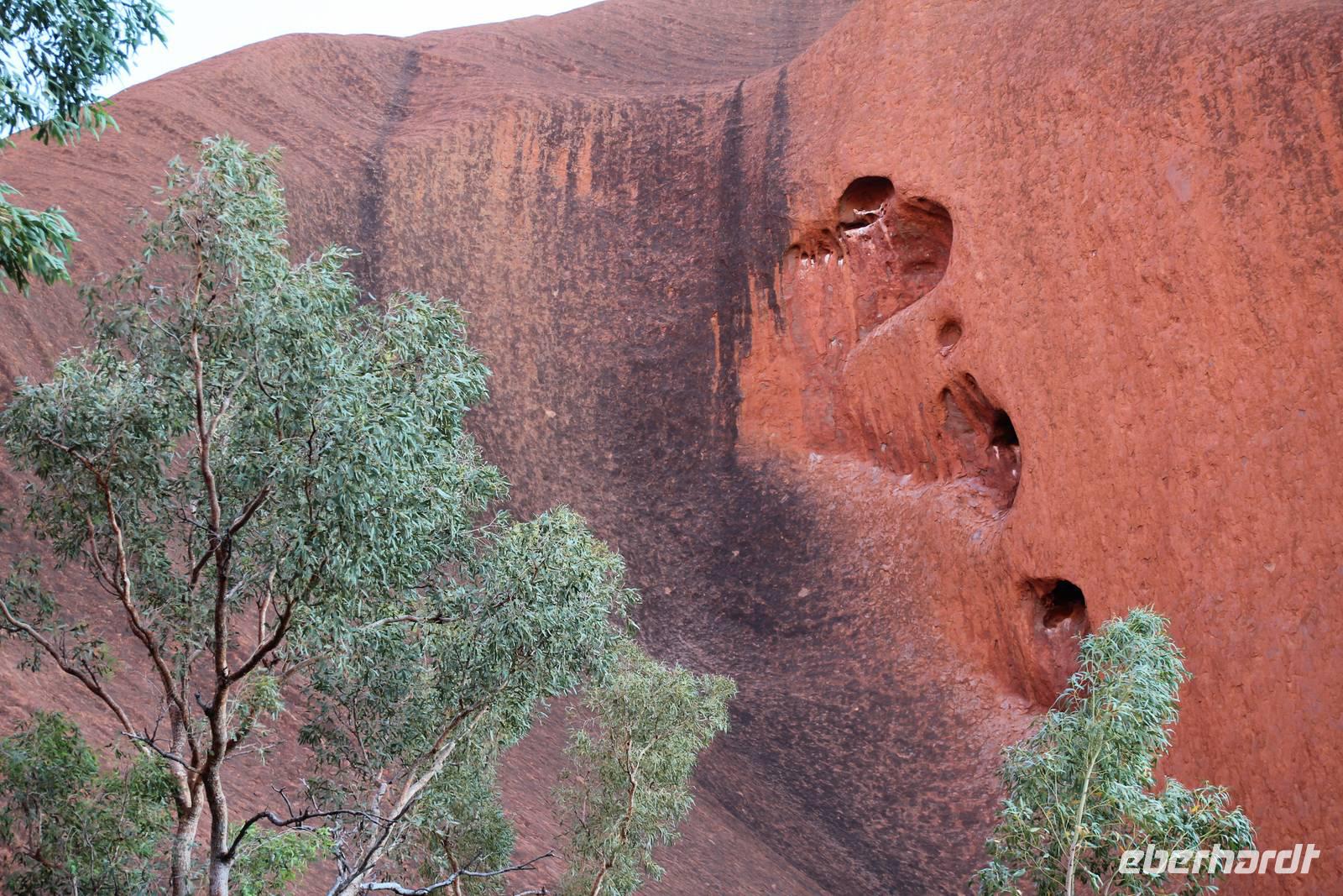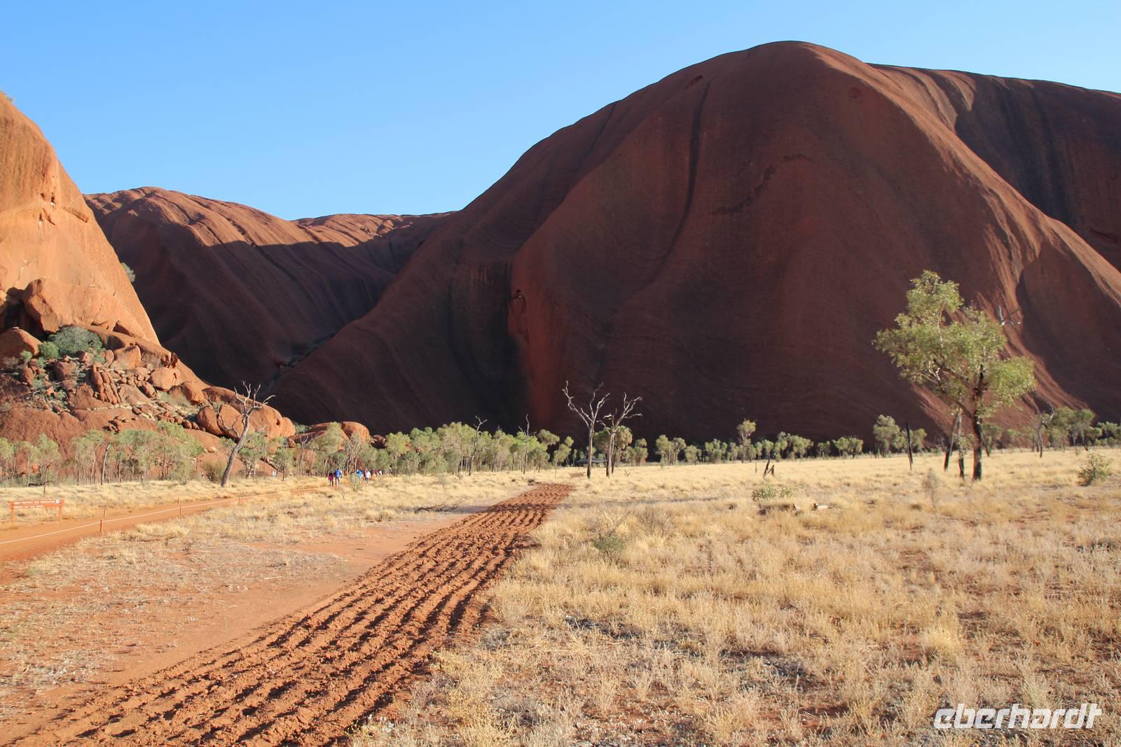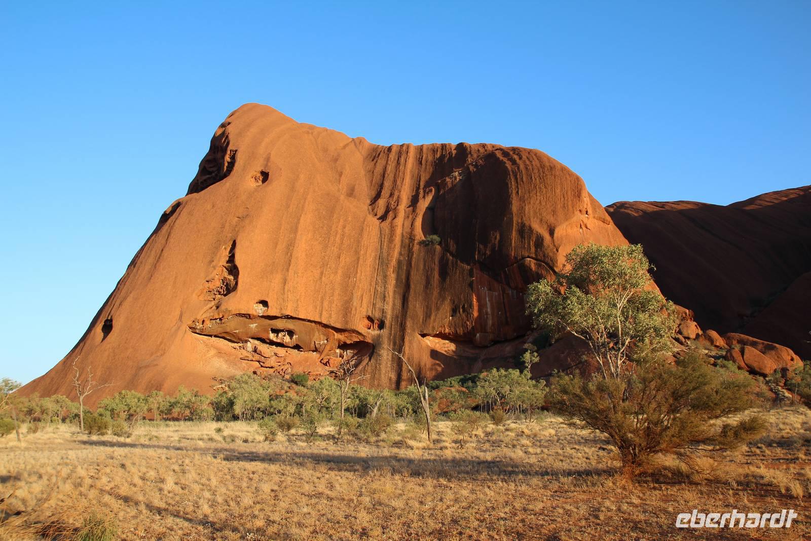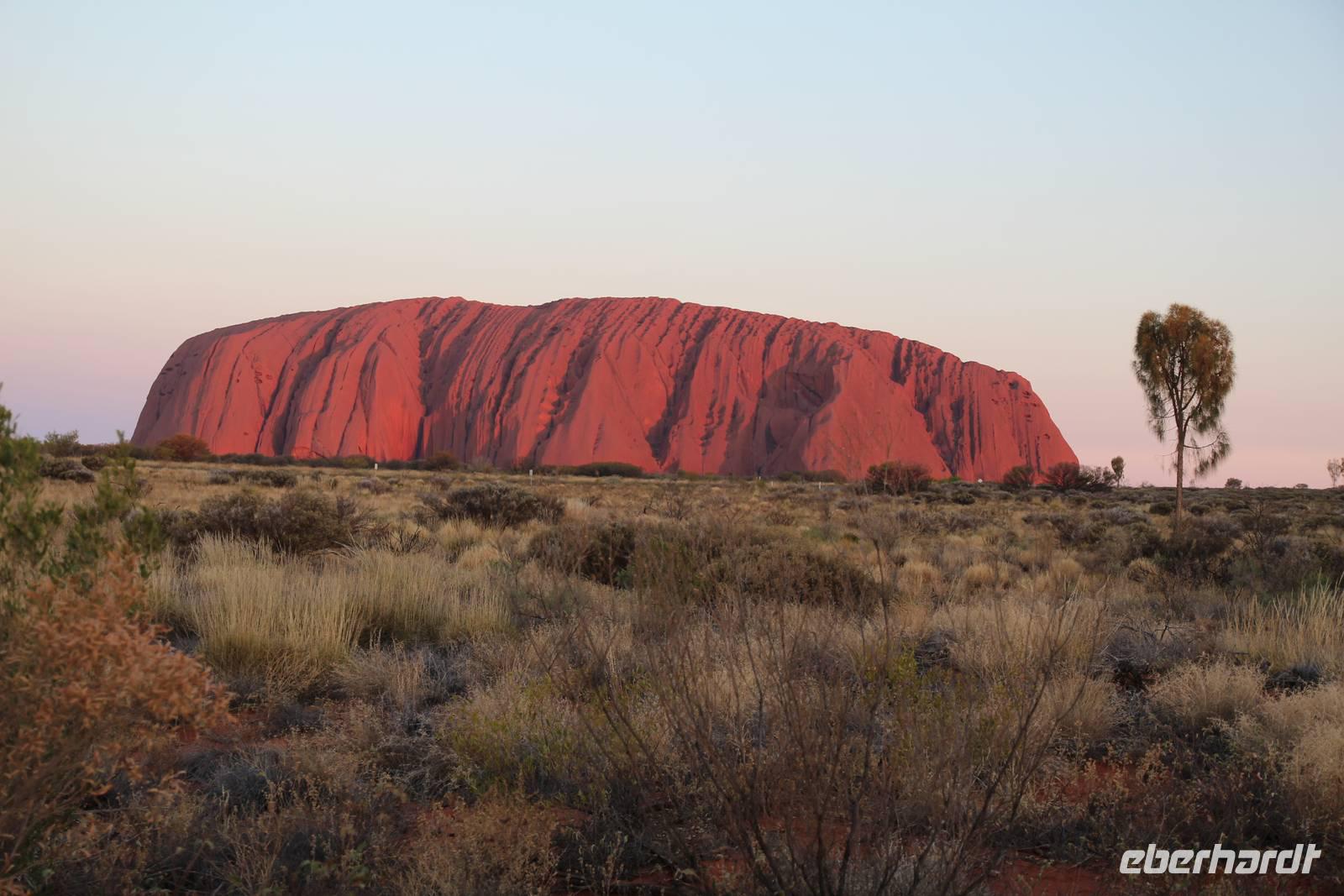 Der Tag startete wieder früh, denn nach einem Sonnenuntergang folgt ein Sonnenaufgang. Wenn wir schon mal hier sind, nehmen wir auch diesen mit. Im Dunkeln wurden wir also wieder eingesammelt und auf die andere Seite des Uluru gebracht. Auch hier erlebten wir während des Sonnenaufgangs wieder ein tolles Farbenspiel. Dabei war es doch noch recht frisch, so dass sich eine Jacke doch recht gut tat. Nach dem Sonnenaufgang machten wir zunächst noch einen kleinen Spaziergang am Ayers Rock, bevor wir uns dann am Kulturzentrum einfanden, um zu frühstücken. Das Frühstück war dann leider nicht so richtig das, was wir uns vorgestellt hatten. Wir mussten es aber erstmal verkraften und nach kurzer Freizeit im Kulturzentrum ging es dann zu einer weiteren letzten Wanderung am Uluru. Diesen kann man theoretisch sogar besteigen, was aber nicht so gern gesehen wird, da es eben ein heiliger Ort für die Aborigines ist.