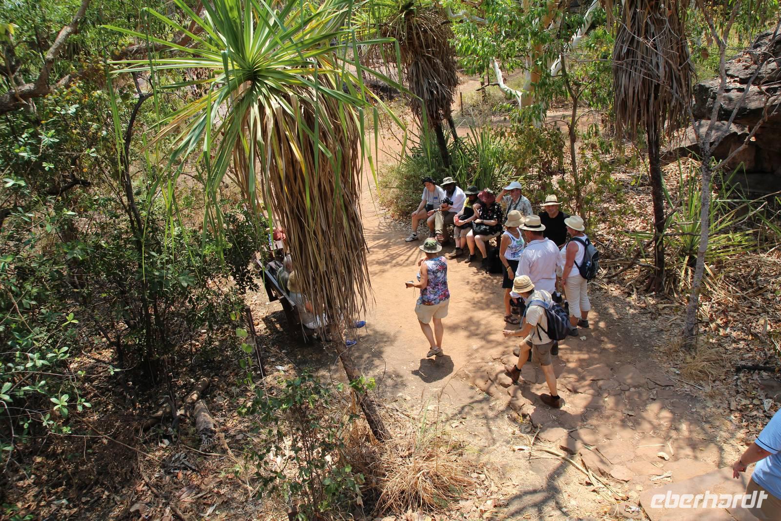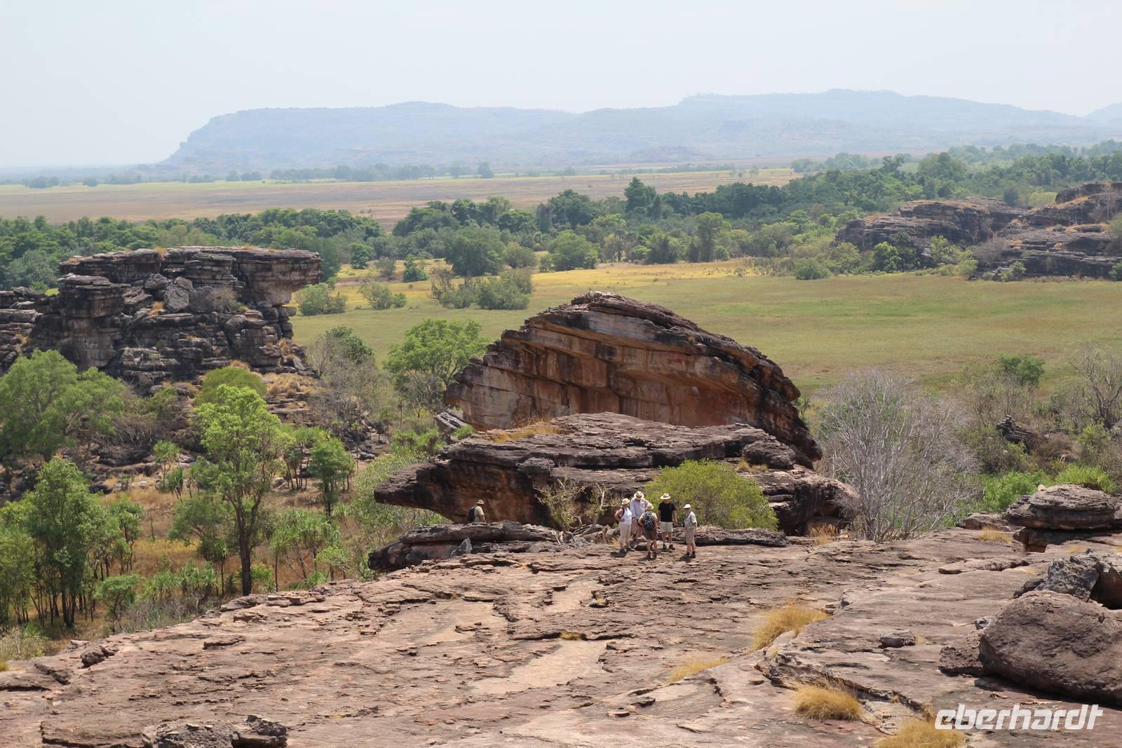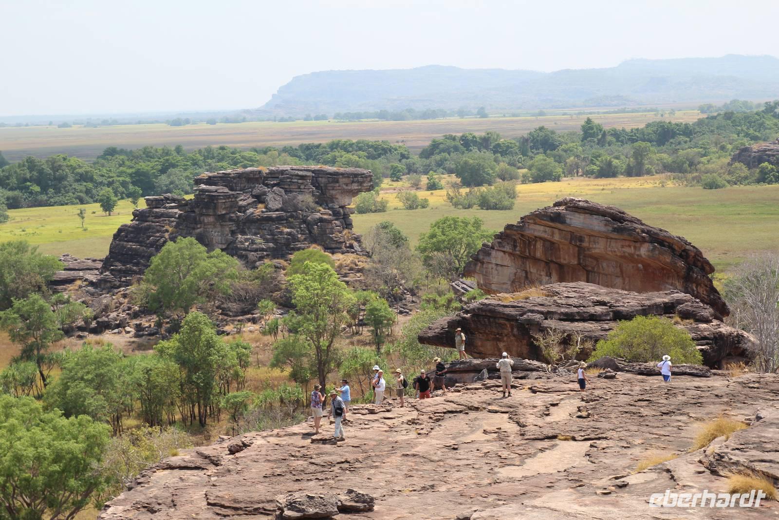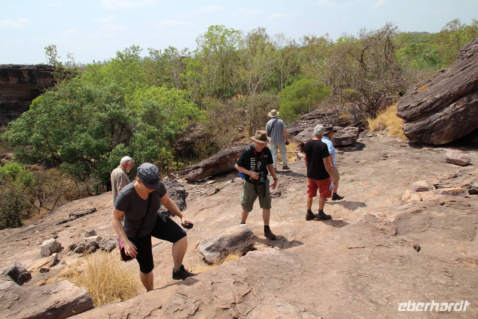 Mit einem Aborigine-Guide ging es dann noch ein Stück weiter zu unserer Wanderung auf den Injalak Hill. Auf einer doch recht anspruchsvollen Wanderung erklärte uns der Guide „sein Wohnzimmer", diverse Geschichten zu den Felsmalereien erzählte er uns und auch über das frühere Leben hier im Berg wurde uns berichtet. Esther übersetze fleißig, doch für einige waren es am Ende doch schon fast zu viele Informationen, die wir uns auch gar nicht alle behalten konnten. Der steinige Weg, mit seinen großen Absätzen tat sein Übriges. Froh waren wir dann, als wir an unserem Rastplatz in einer Felshöhle auf dem Injalak Hill ankamen. Unsere beiden Fahrer hatten uns hier ein Picknick vorbereitet, an dem wir neue Energie tanken konnten. Mit einem kurzen Umweg zu einem Aussichtspunkt ging es dann wieder hinab zu unseren Jeeps. Die Wanderung war geschafft und einige von uns waren froh, wieder unten zu sein. Dennoch bleiben uns am Ende sicherlich die Erinnerungen an die schönen Blicke vom Injalak Hill. An den Jeeps wurden wir dann wieder herzlich empfangen, es wurden uns kalte Tücher zur Erfrischung gereicht und auch Obst und Fruchtgummi. Zurück ging es dann in den Kakadu Nationalpark zu unserer Unterkunft dem Hotel Aurora Kakadu, wo wir in einer schönen Anlage den restlichen Nachmittag am Pool oder der Bar genossen.