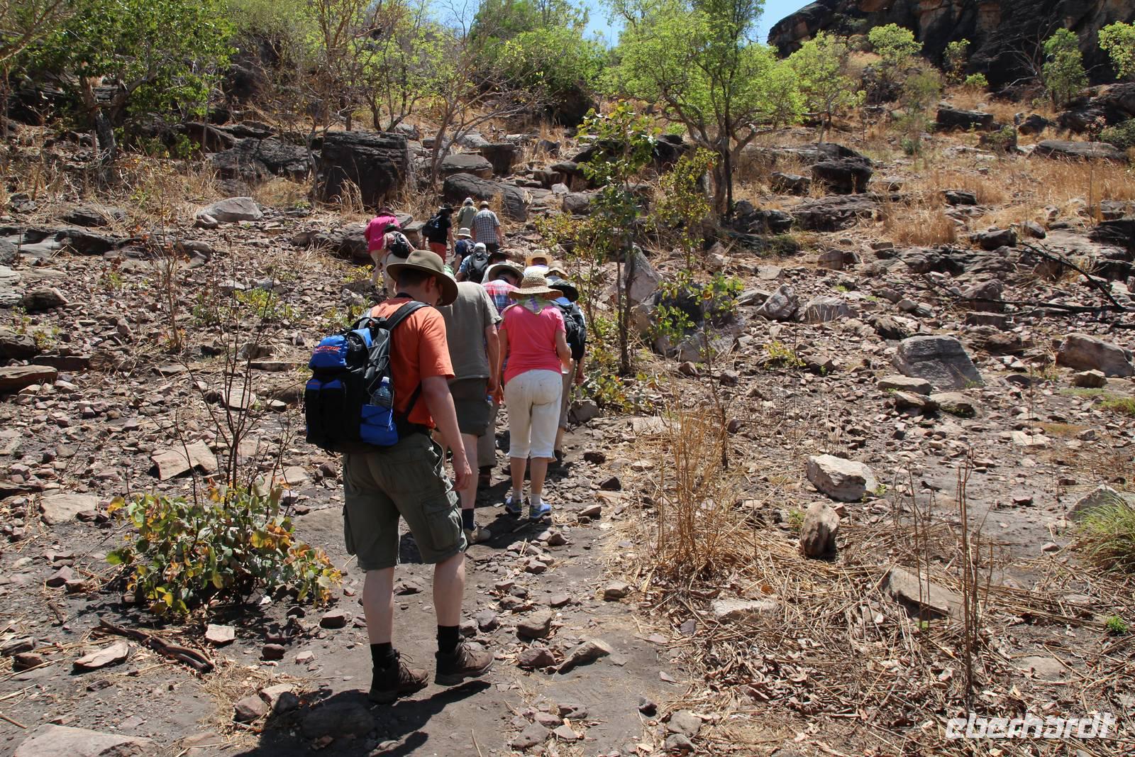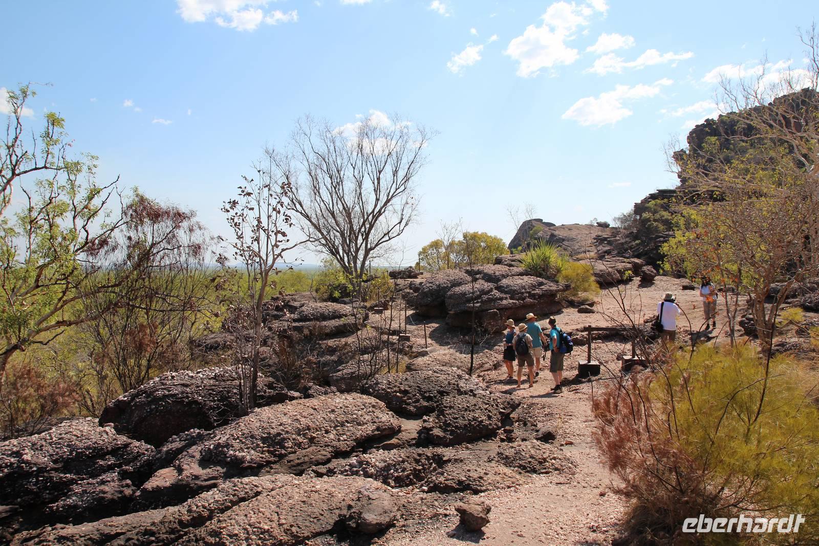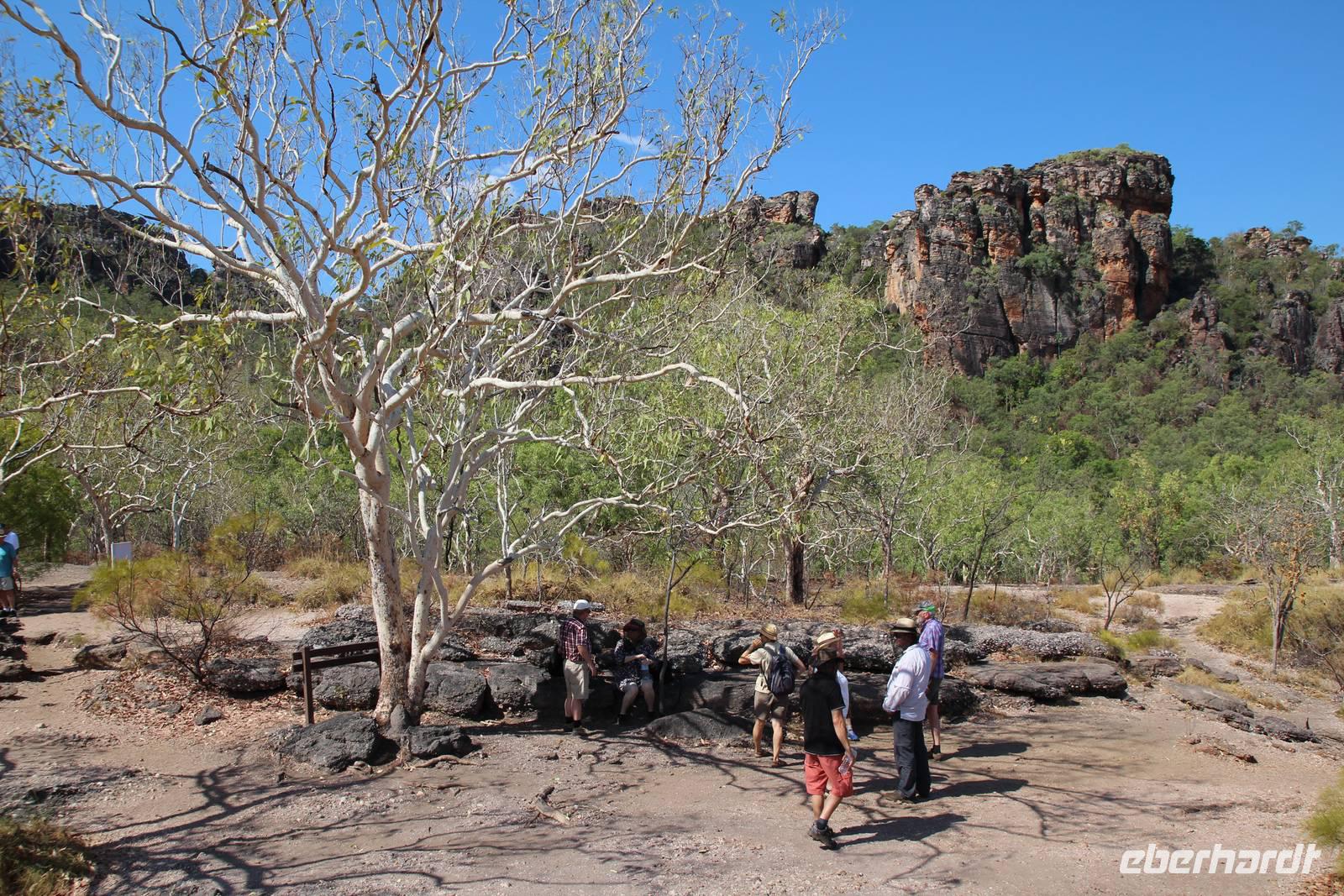 Mit einem Aborigine-Guide ging es dann noch ein Stück weiter zu unserer Wanderung auf den Injalak Hill. Auf einer doch recht anspruchsvollen Wanderung erklärte uns der Guide „sein Wohnzimmer", diverse Geschichten zu den Felsmalereien erzählte er uns und auch über das frühere Leben hier im Berg wurde uns berichtet. Esther übersetze fleißig, doch für einige waren es am Ende doch schon fast zu viele Informationen, die wir uns auch gar nicht alle behalten konnten. Der steinige Weg, mit seinen großen Absätzen tat sein Übriges. Froh waren wir dann, als wir an unserem Rastplatz in einer Felshöhle auf dem Injalak Hill ankamen. Unsere beiden Fahrer hatten uns hier ein Picknick vorbereitet, an dem wir neue Energie tanken konnten. Mit einem kurzen Umweg zu einem Aussichtspunkt ging es dann wieder hinab zu unseren Jeeps. Die Wanderung war geschafft und einige von uns waren froh, wieder unten zu sein. Dennoch bleiben uns am Ende sicherlich die Erinnerungen an die schönen Blicke vom Injalak Hill. An den Jeeps wurden wir dann wieder herzlich empfangen, es wurden uns kalte Tücher zur Erfrischung gereicht und auch Obst und Fruchtgummi. Zurück ging es dann in den Kakadu Nationalpark zu unserer Unterkunft dem Hotel Aurora Kakadu, wo wir in einer schönen Anlage den restlichen Nachmittag am Pool oder der Bar genossen.