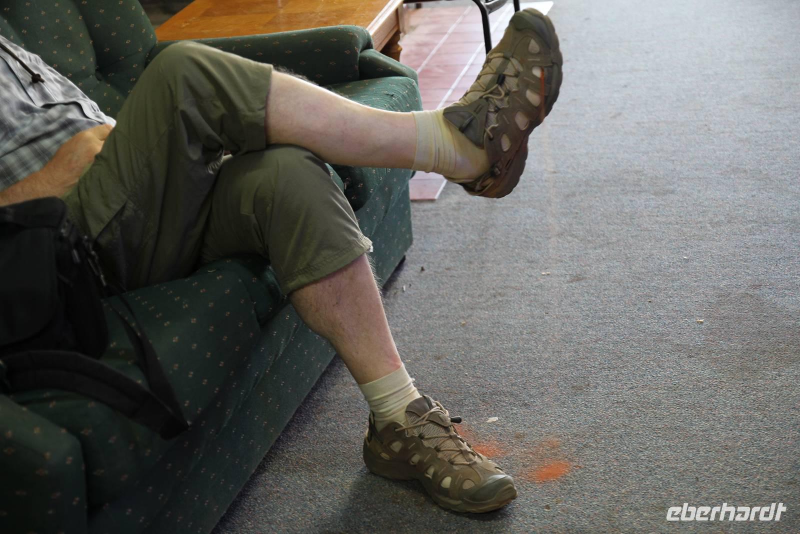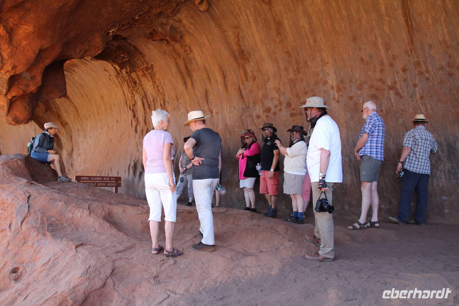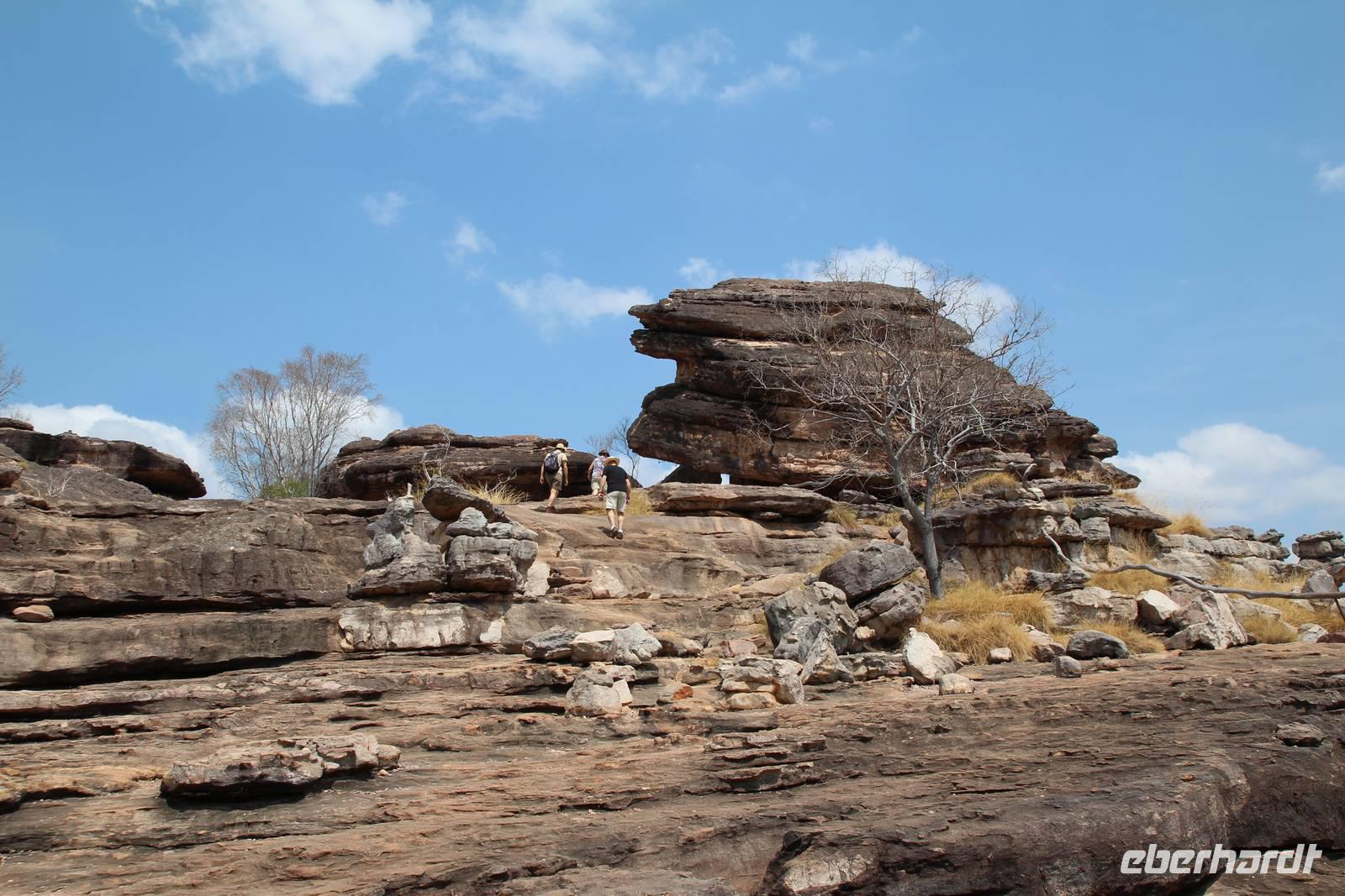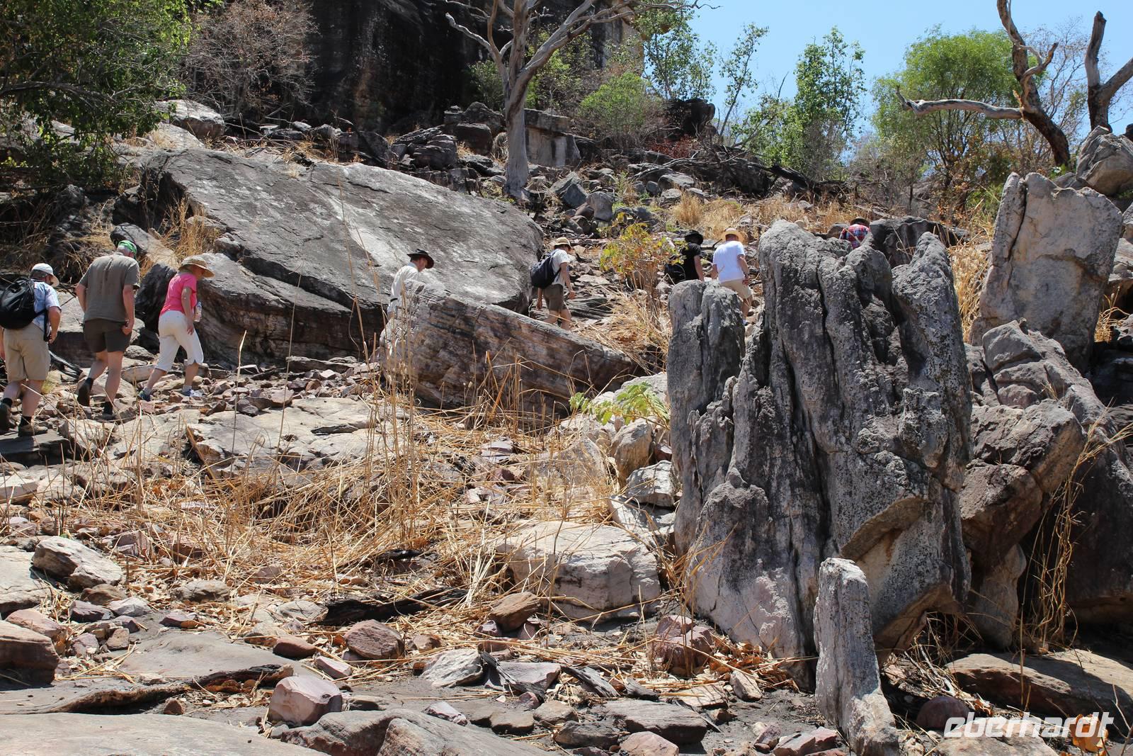 Mit einem Aborigine-Guide ging es dann noch ein Stück weiter zu unserer Wanderung auf den Injalak Hill. Auf einer doch recht anspruchsvollen Wanderung erklärte uns der Guide „sein Wohnzimmer", diverse Geschichten zu den Felsmalereien erzählte er uns und auch über das frühere Leben hier im Berg wurde uns berichtet. Esther übersetze fleißig, doch für einige waren es am Ende doch schon fast zu viele Informationen, die wir uns auch gar nicht alle behalten konnten. Der steinige Weg, mit seinen großen Absätzen tat sein Übriges. Froh waren wir dann, als wir an unserem Rastplatz in einer Felshöhle auf dem Injalak Hill ankamen. Unsere beiden Fahrer hatten uns hier ein Picknick vorbereitet, an dem wir neue Energie tanken konnten. Mit einem kurzen Umweg zu einem Aussichtspunkt ging es dann wieder hinab zu unseren Jeeps. Die Wanderung war geschafft und einige von uns waren froh, wieder unten zu sein. Dennoch bleiben uns am Ende sicherlich die Erinnerungen an die schönen Blicke vom Injalak Hill. An den Jeeps wurden wir dann wieder herzlich empfangen, es wurden uns kalte Tücher zur Erfrischung gereicht und auch Obst und Fruchtgummi. Zurück ging es dann in den Kakadu Nationalpark zu unserer Unterkunft dem Hotel Aurora Kakadu, wo wir in einer schönen Anlage den restlichen Nachmittag am Pool oder der Bar genossen.