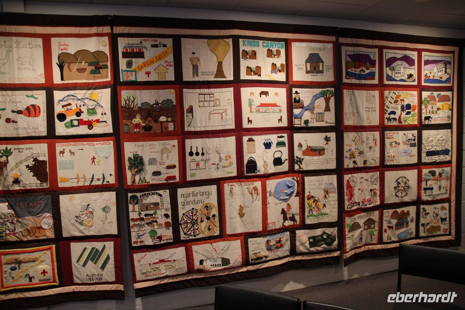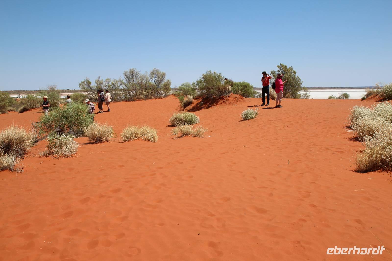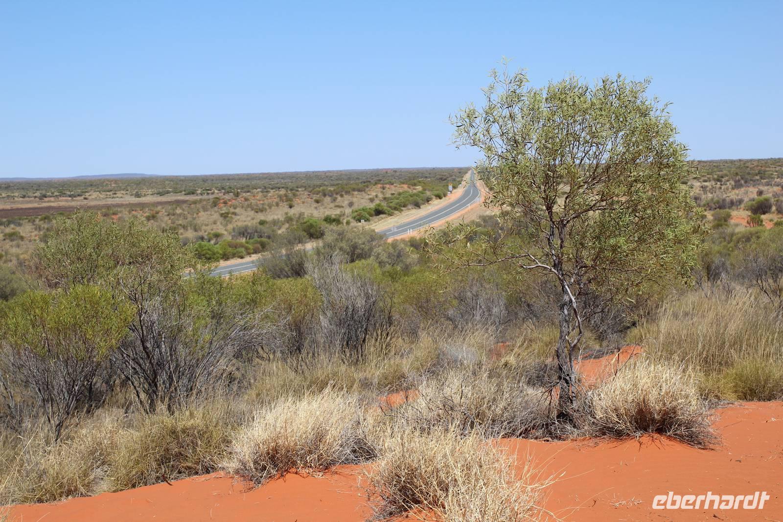 Dann ging es auch schon auf unsere lange Fahrt in Richtung Alice Springs, über 400 Kilometer lagen vor uns und das auf einer nahezu endlosen, schnurgeraden Straße, dem Stuart Highway. Anfangs wunderten wir uns noch über den Fahrstil unserer Busfahrerin, denn immer wieder korrigierte Sie heftig die Fahrspur. War sie übermüdet? Nein, ganz und gar nicht. Es herrschte einfach entsprechender Wind, der unseren Bus doch deutlich angriff und zum Gegensteuern zwang. Auf dem Weg machten wir einen ersten Zwischenstopp an einem großen Salzsee, bevor wir dann am Mittag das Roadhouse Mt. Ebenzer erreichten. Hier bot sich uns eine Auswahl aus frischem Obst, verschiedenen kalten und warmen Sandwiches oder auch einem Burger. Wahnsinn, wenn man bedenkt, dass das Roadhouse mitten im Nichts ist, denn eine Ortschaft hatten wir auf der ersten halben Strecke nicht weiter gesehen. Es muss schon ein komisches Leben sein, hier zu wohnen und zu arbeiten. Auch Aborigines arbeiteten hier und stellten hier Kunstwerke zum Verkauf aus.