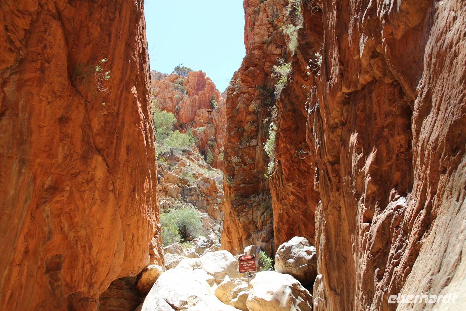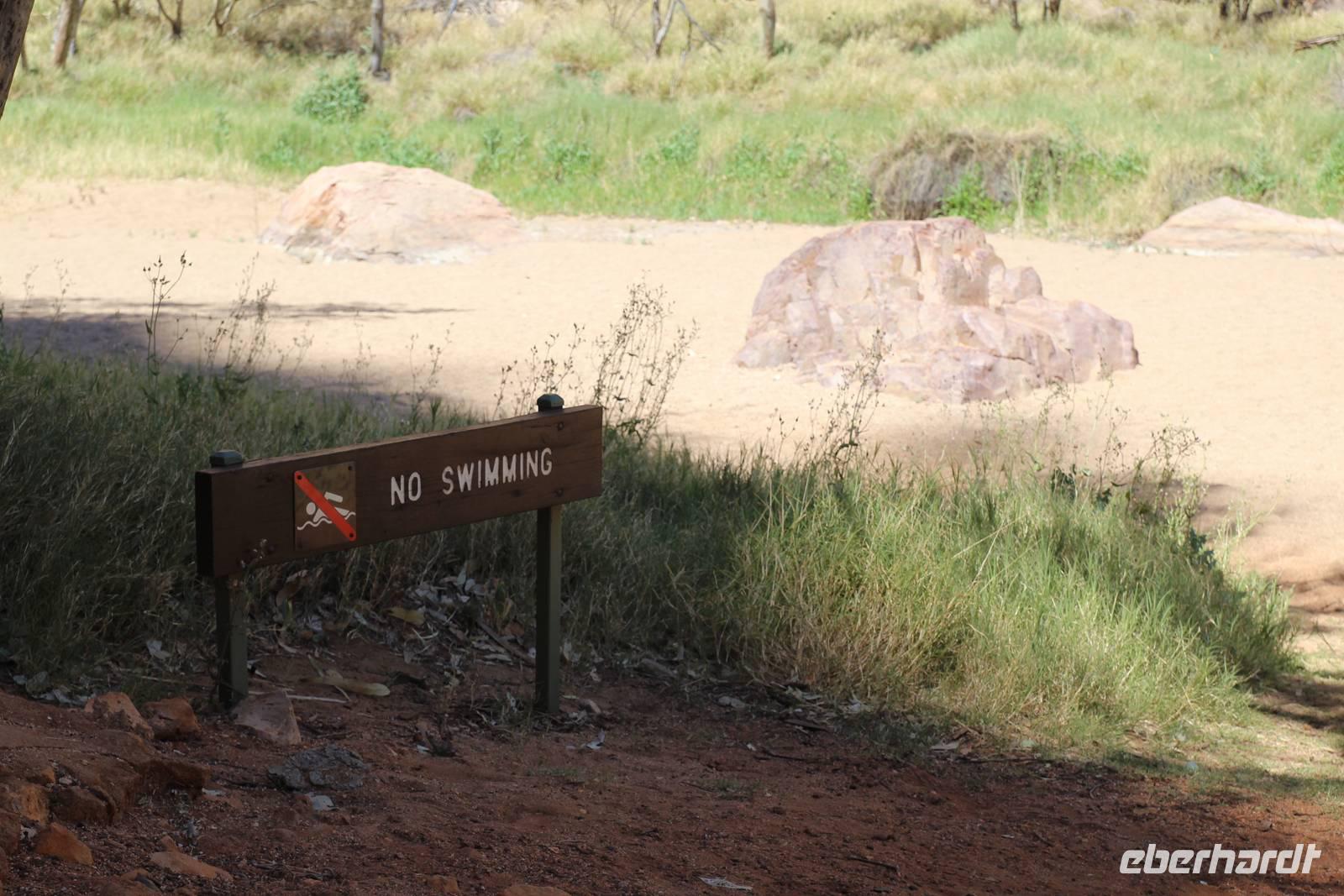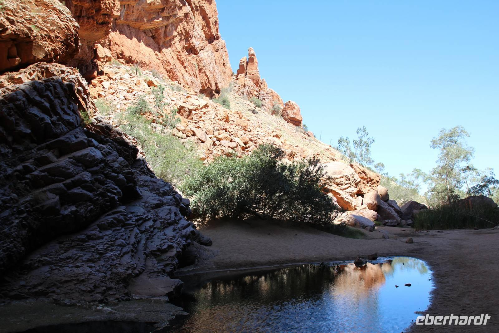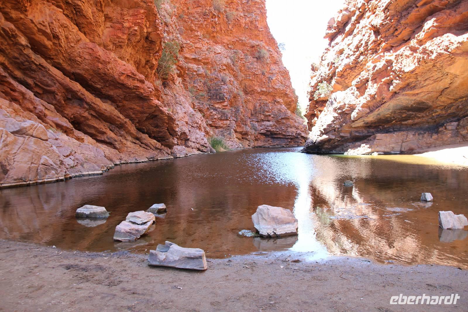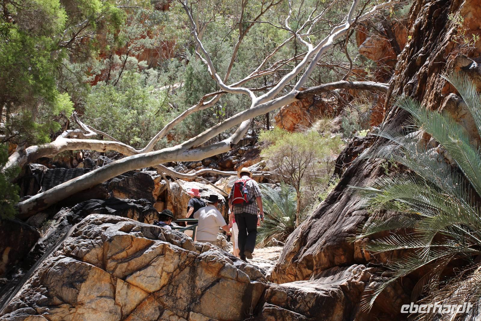 Nach dem Desert-Park ging es dann zur Gebirgskette MacDonell Ranges, welche vor allem dadurch bekannt ist, dass sie an mehreren Stellen durch tiefe Felseinschnitte durchbrochen ist. Zwei dieser Einschnitte sollten wir heute besuchen, zunächst Standley Chasm. Natürlich ging dies wieder nur zu Fuß, aber die Wege waren annehmbar. Am Standley Chasm gab es dann auch einen Mittagsimbiss, bevor es weiter zur Simpsons Gap ging, auch hier starteten wir wieder zu einer kleinen Wanderung. Nicht nur die steilen Felswände waren beeindruckend, sondern auch, dass man hier Wasser fand, indem man nur ein kleines Loch gegraben hat. Am Ende des Weges war sogar ein kleiner See, der den weiteren Weg versperrte.