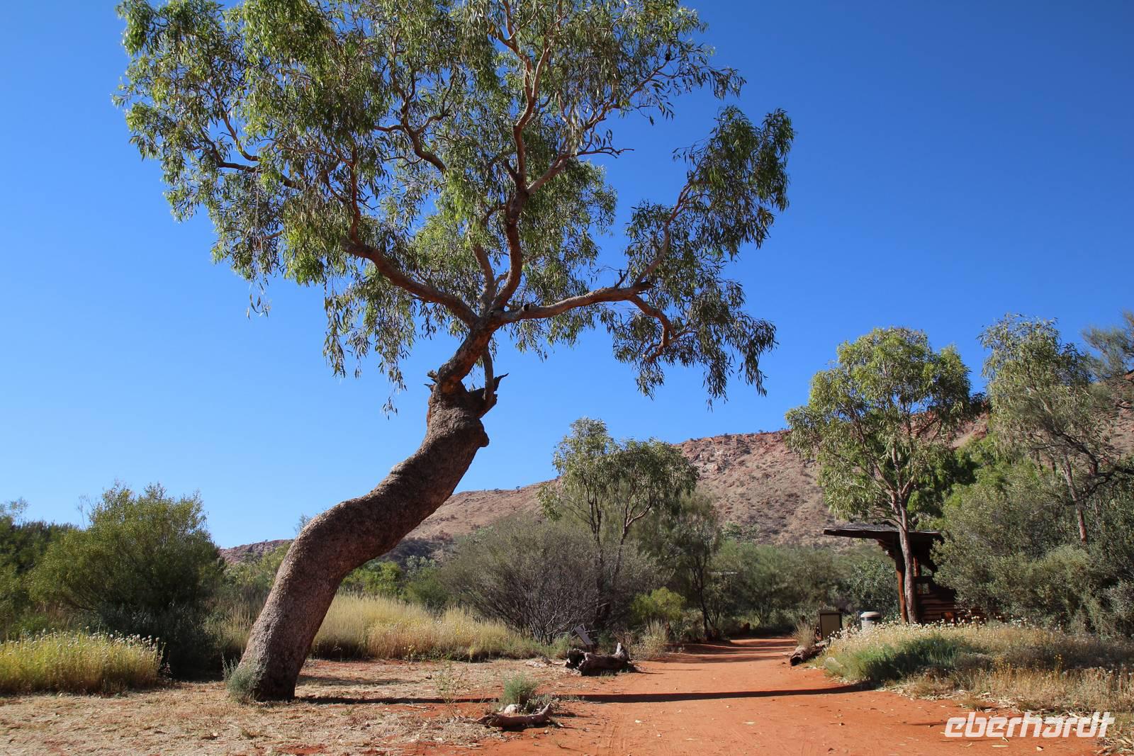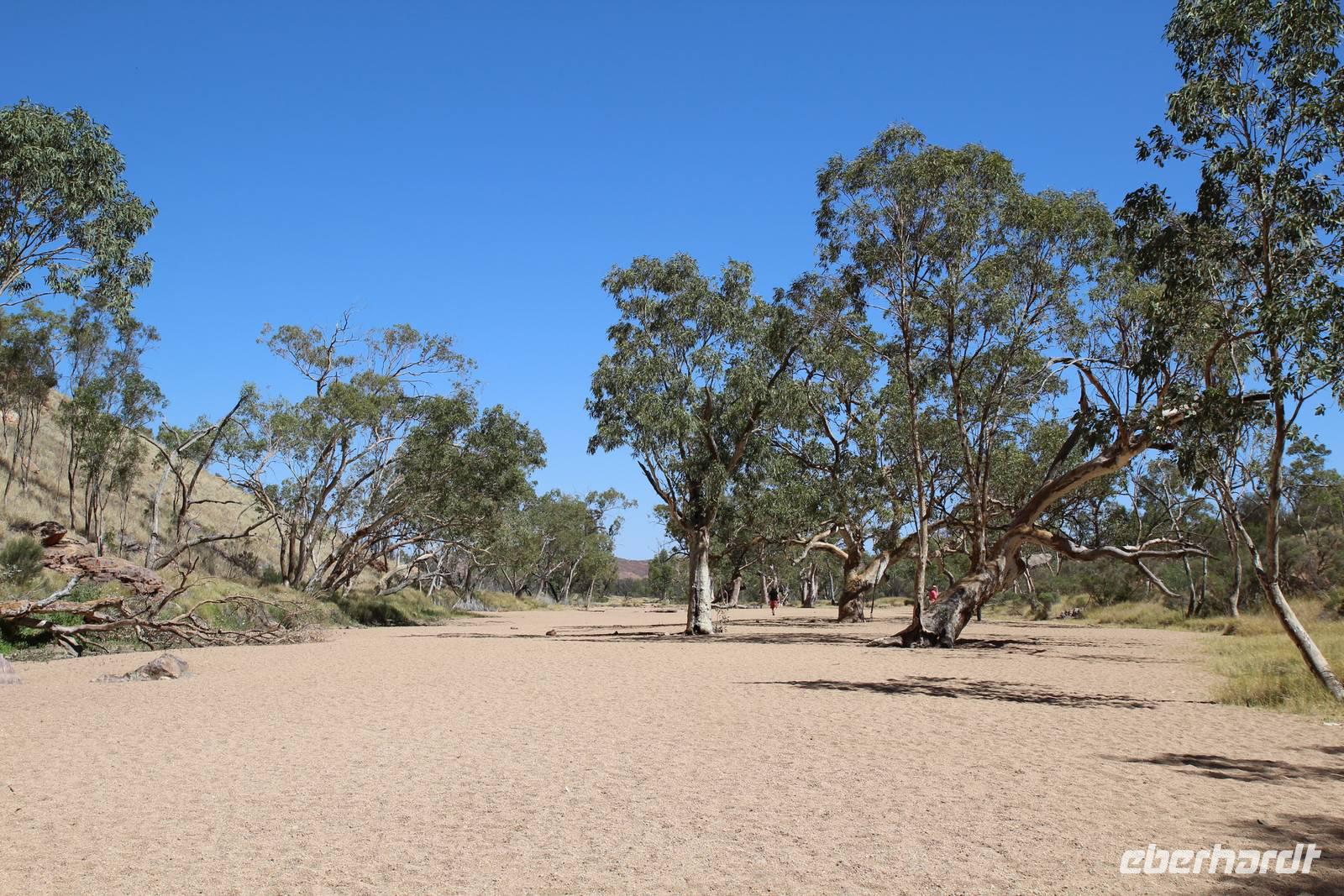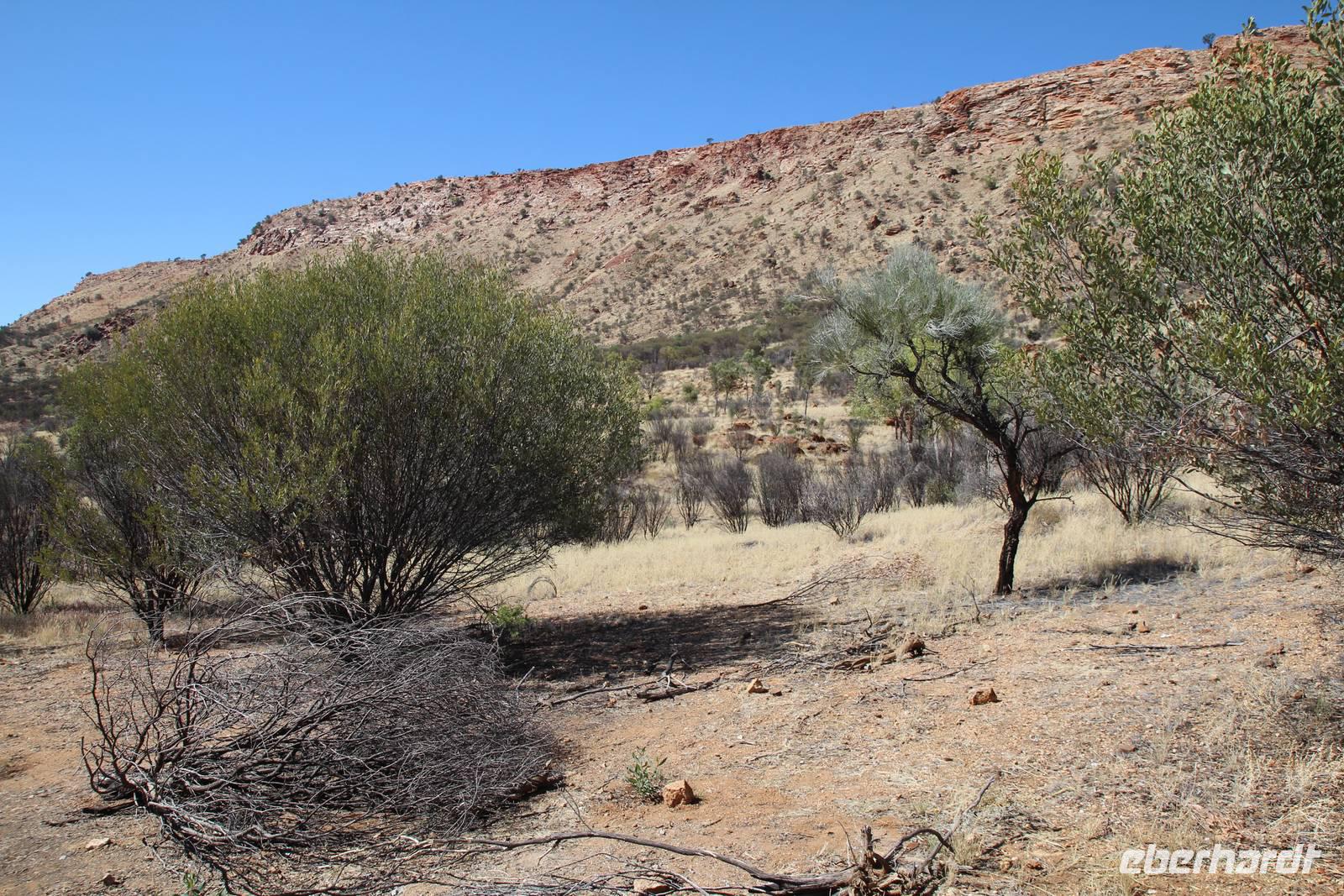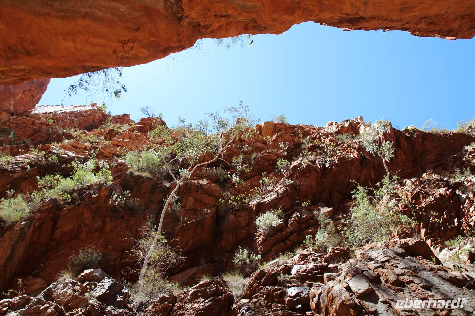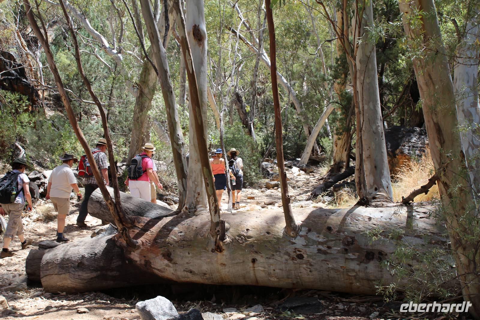 Nach dem Desert-Park ging es dann zur Gebirgskette MacDonell Ranges, welche vor allem dadurch bekannt ist, dass sie an mehreren Stellen durch tiefe Felseinschnitte durchbrochen ist. Zwei dieser Einschnitte sollten wir heute besuchen, zunächst Standley Chasm. Natürlich ging dies wieder nur zu Fuß, aber die Wege waren annehmbar. Am Standley Chasm gab es dann auch einen Mittagsimbiss, bevor es weiter zur Simpsons Gap ging, auch hier starteten wir wieder zu einer kleinen Wanderung. Nicht nur die steilen Felswände waren beeindruckend, sondern auch, dass man hier Wasser fand, indem man nur ein kleines Loch gegraben hat. Am Ende des Weges war sogar ein kleiner See, der den weiteren Weg versperrte.