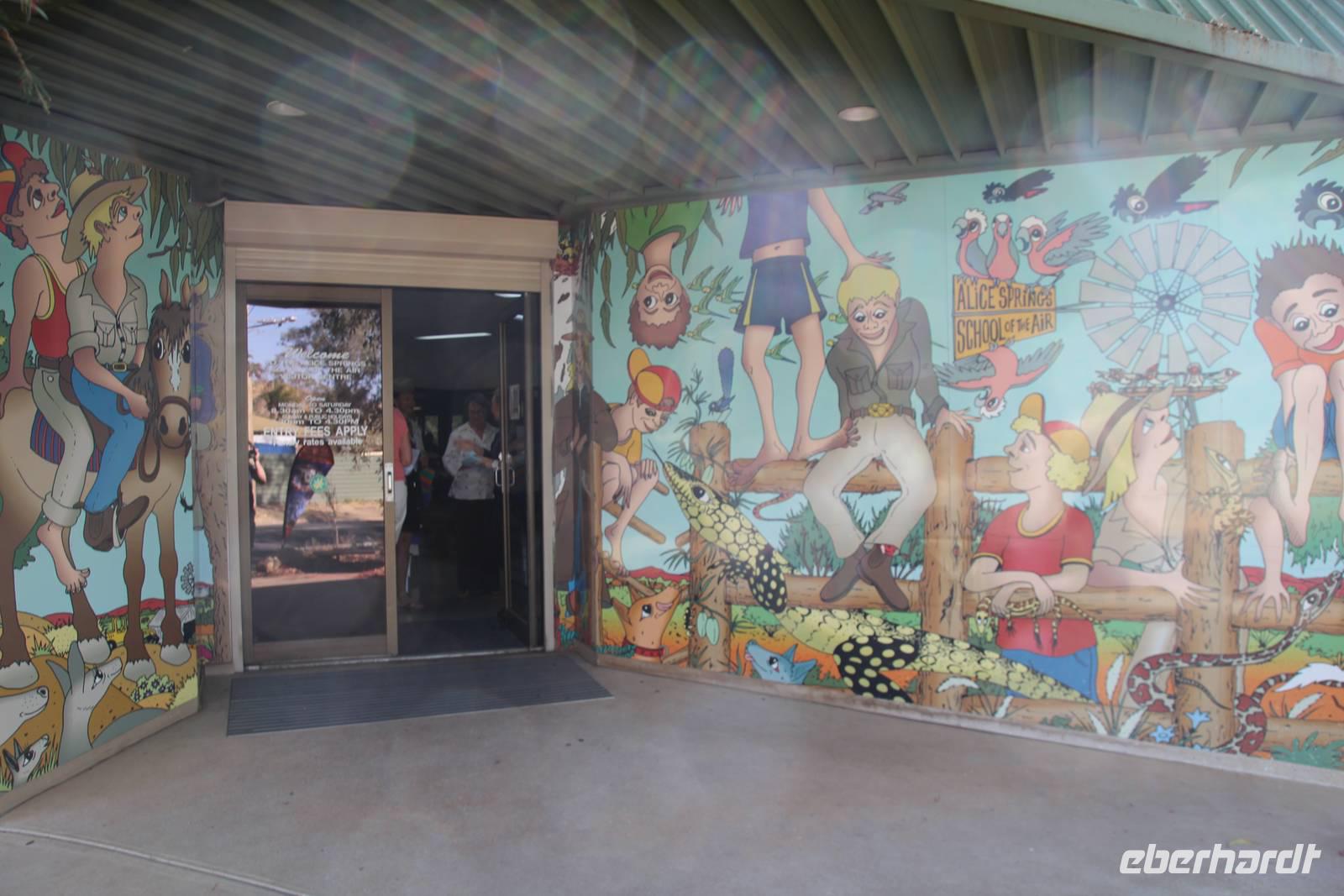 So langsam hieß es mal wieder Abschied nehmen, doch auf dem Weg zum Flughafen legten wir noch zwei Stopps ein bei zwei Organisationen, ohne die ein Leben im Outback wohl deutlich schwerer wäre. Zunächst ging es zur School of Air von Alice Springs, wo wir erfuhren wie der Unterricht heute und früher verlief. Kaum vorstellbar, dass früher die Schulkinder einzig per Funkgerät unterrichtet wurden und die Materialien per Flugzeug zu den und von den Kindern verschickt worden. Da sieht das ganze heute dank der Internettechnologie doch schon deutlich modernerer und persönlicher aus. Leider blieb uns ein Live-Einblick in den Unterricht verwehrt, da heute keiner stattfand, aber auf einem Video konnten wir dennoch einen kleinen Eindruck davon bekommen.