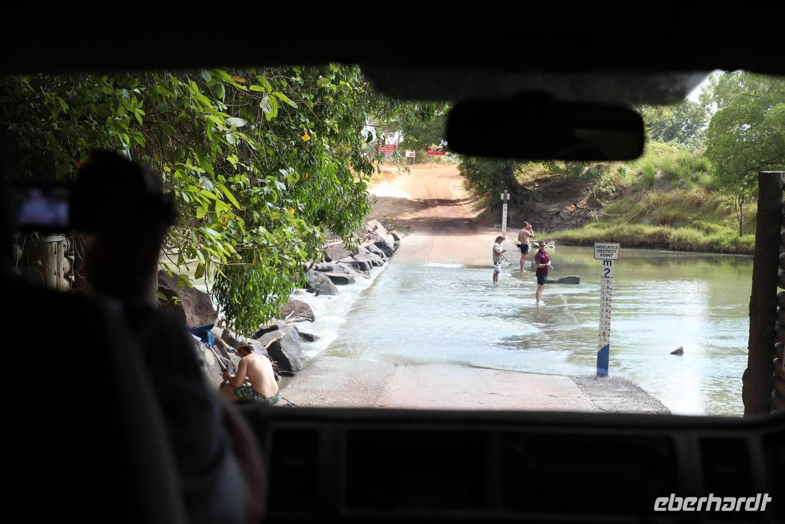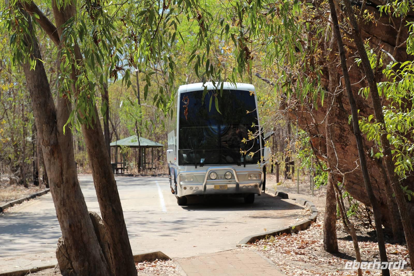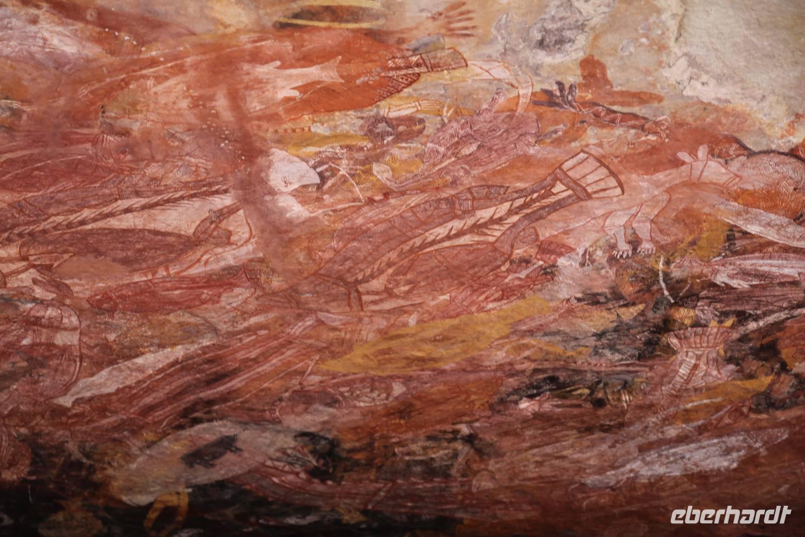 Der Tag begann wieder zeitig, denn wir hatten für die kommenden Tage den Kakadu-Nationalpark als Ziel, wo wir aber natürlich auch noch etwas vom Tag haben wollten. Zunächst hieß es dafür aber am Vortag ein kleineres Reisegepäck zu packen, denn die Abholung für unsere erste Tour erfolgte mit 2 Jeeps, deren Ladevolumen wahrscheinlich nicht alle Koffer von uns unterbekommen hätte. Vom Hotel wurde uns für den Weg noch ein kleines Frühstückspaket mitgegeben und schon konnte das Abenteuer beginnen. Den ersten Stopp machten wir am Bark Hut Roadhouse, wo wir uns mit einem erwachenden Kaffee versorgten. Die weitere Fahrt führte dann durch den Kakadu Nationalpark weiter bis zum East Alligator River. Hier sahen wir mutige Angler, die mit den Füßen im Wasser angelten. Nicht ganz ungefährlich, denn wie der Name schon sagt, leben in dem Fluss Krokodile, die sich uns aber heute nicht zeigten. Bei der Überquerung mussten wir ein Stück durchs Wasser fahren und dann waren wir schon im Arnhemland. Wir besuchten zunächst Das Künstlerzentrum Injalak Art, wo wir einigen Aborigines bei Ihrem Kunsthandwerk zusehen konnten und natürlich auch im anliegenden Shop deren Arbeiten kaufen konnten.