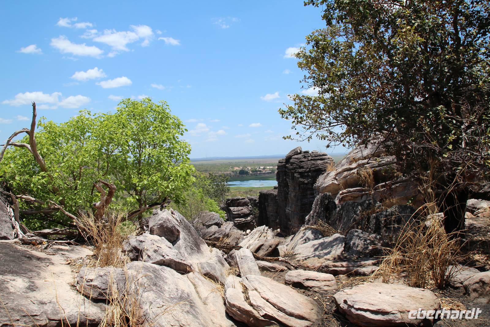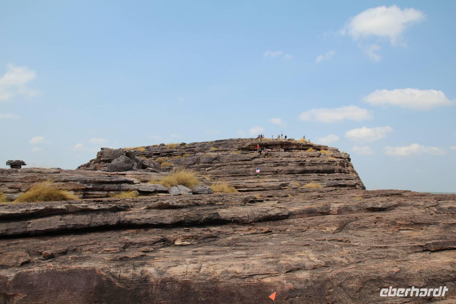 Auch heute standen nochmal einige Erlebnisse im Kakadu-Nationalpark vor uns, bevor wir am Nachmittag wieder in die Zivilisation zurückkehren sollten. Von unserem Hotel starteten wir am Vormittag zum Ubirr-Felsen, wo erneut eine Wanderung anstand. Dabei gab es natürlich wieder einige alte Felszeichnungen zu entdecken, sogar ein kleines Känguru querte unseren Weg. Aber bis dies alle mitbekommen hatten, war es schon geflüchtet und hat sich versteckt. Auf den Wanderung stand uns dann frei, den Ubirr-Felsen auch bis ganz nach oben zu erklimmen. Die meisten folgten diesem Vorschlag natürlich, auch wenn das etwas Anstrengung bedeutete. Der herrliche Ausblick entschädigte dafür aber auf jeden Fall. So entstanden nochmal viele schöne Fotos und mehrere Panoramaaufnahmen von der Umgebung.