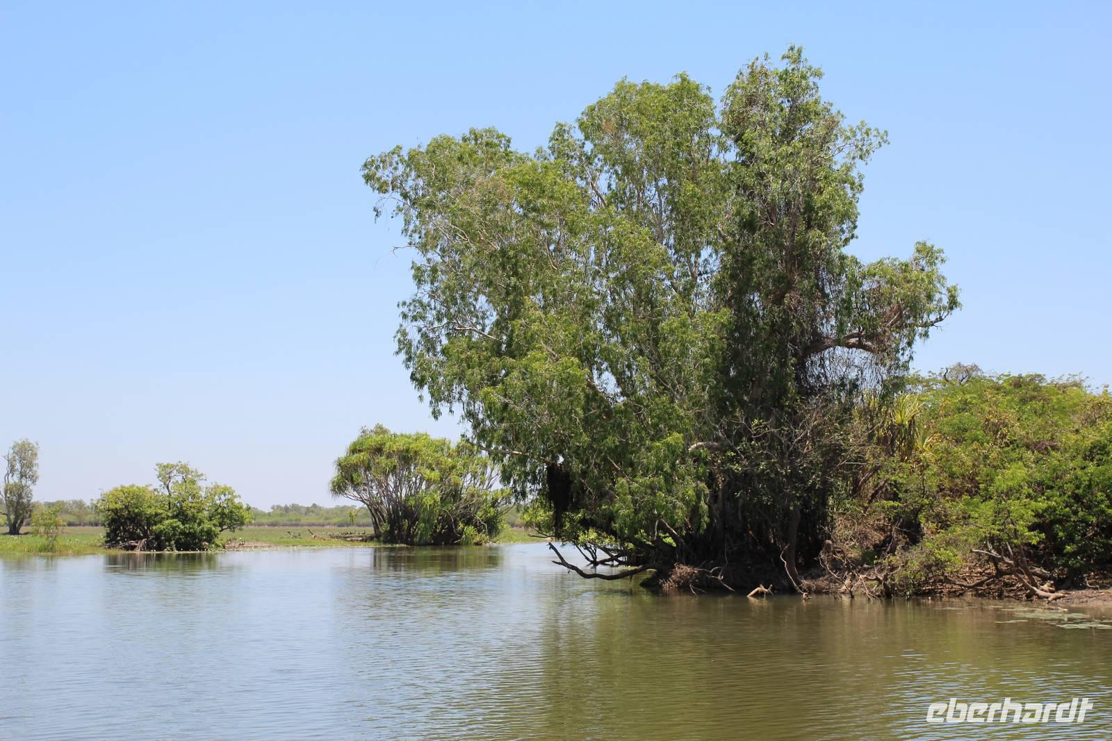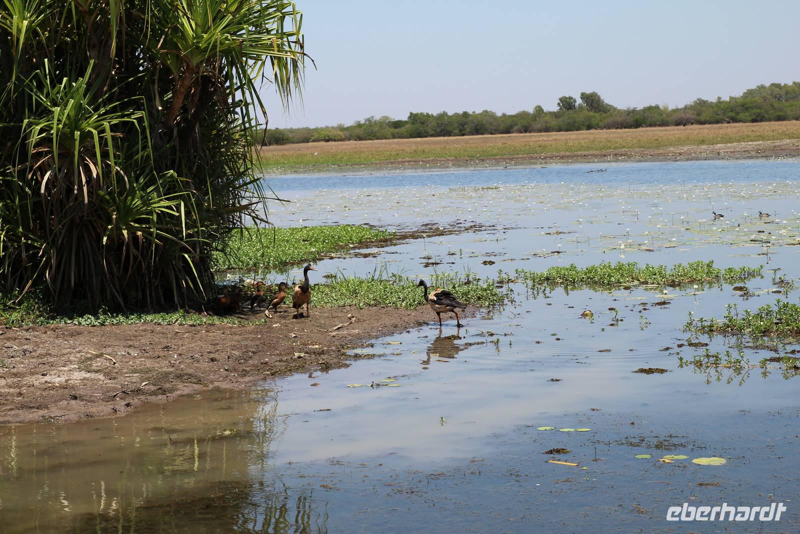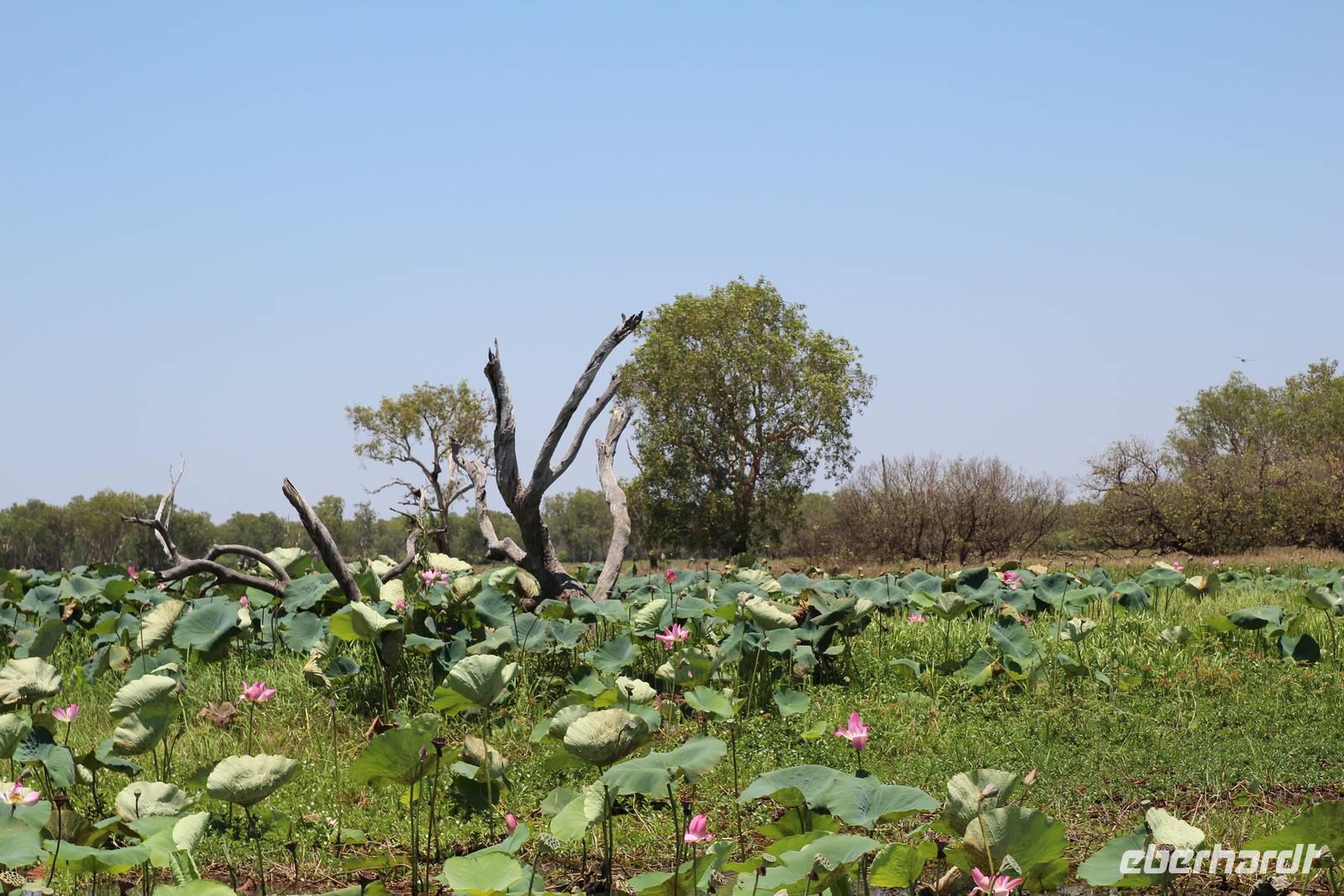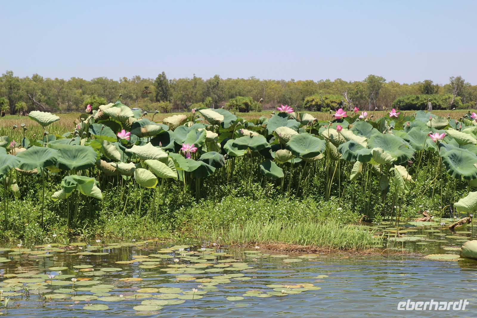 Heute konnten wir mal wieder etwas länger schlafen, denn wir wurden erst 10 Uhr vom Hotel abgeholt. Wir waren ab heute auch wieder in einem großen Bus unterwegs, der sehr luxuriös war, eine Frontkamera ließ uns alle von den Plätzen sehen, was vor unserem Bus los war. Unsere Fahrt ging zunächst ins Kulturzentrum Warradjin, wo wieder allerlei Wissenswertes über das Leben der Aborigines vermittelt wurde. Weiter ging die Fahrt zum Gewässer Yellow Water, einem so genannten Billabong. Hier wechselten wir vom Bus auf ein Boot, mit welchem wir dann auf dem Yellow Water eine Ausfahrt machten, auf der es allerlei zu entdecken gab. So sahen wir einige Krokodile, die unsere Fahrt still beobachteten, aber auch Greifvögel, wie den Weißkopfadler, sowie Gänse, Enten und auch Wasserbüffel konnten wir erblicken. Und auch die Pflanzenwelt beglückte uns unter anderem mit Wasserlilien und auch Lotusblumen. Da außer unserer kleinen Gruppe keiner auf dem Boot war, hatten wir auch genügend Freiraum um überall zu fotografieren.