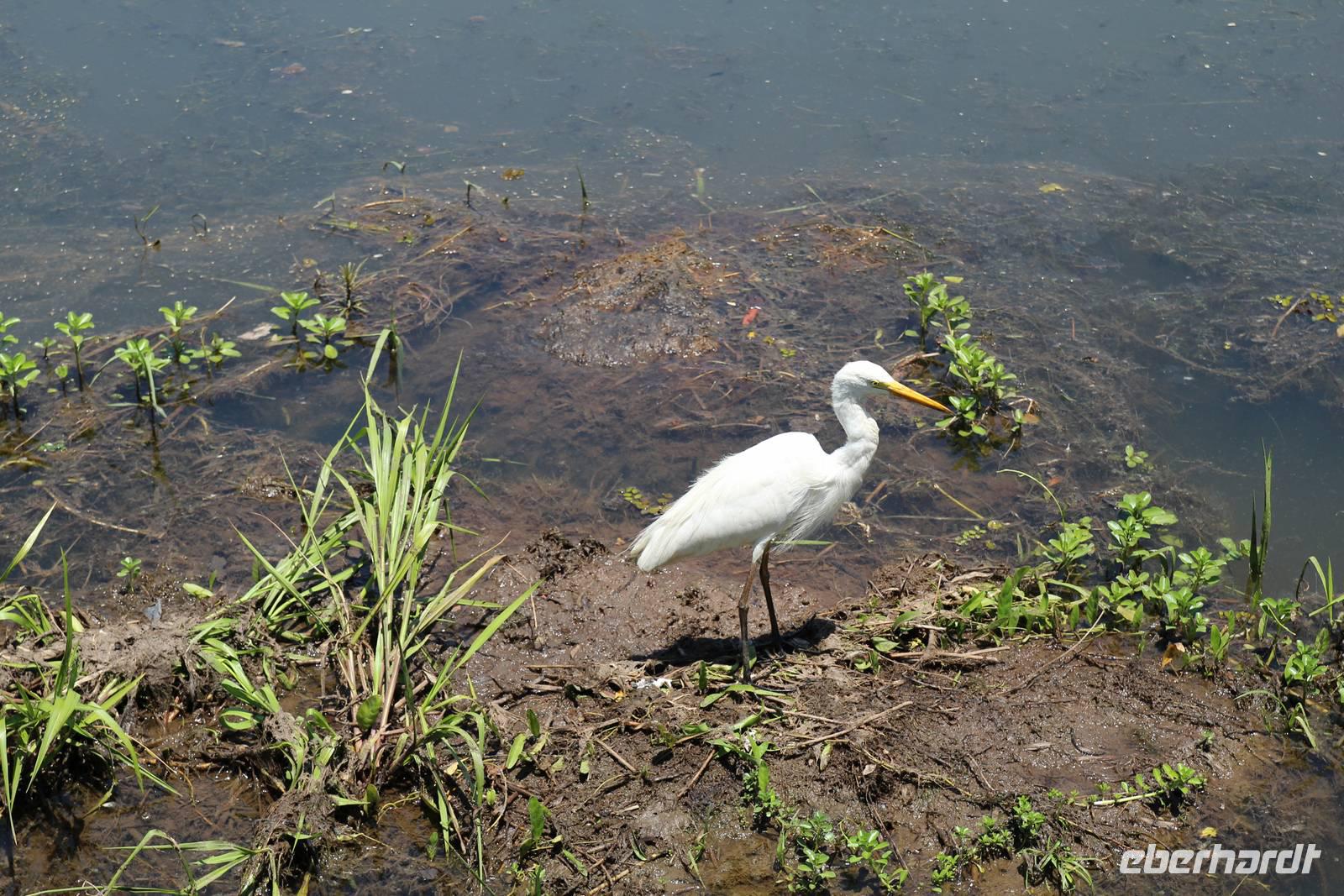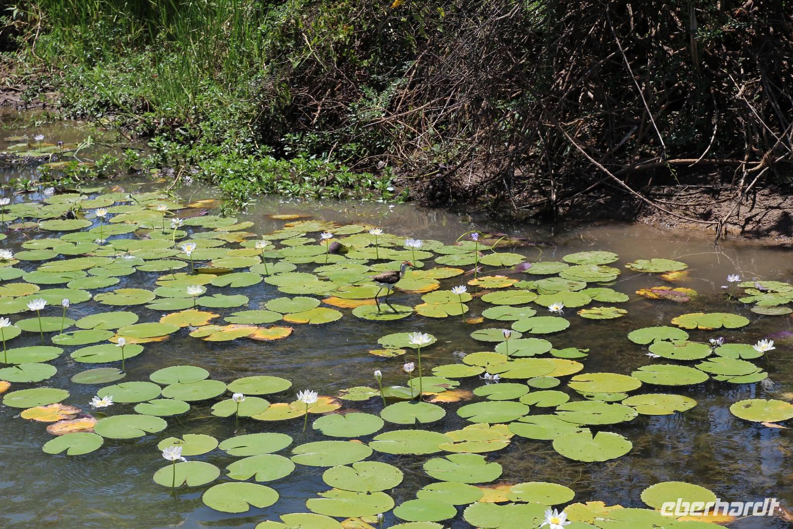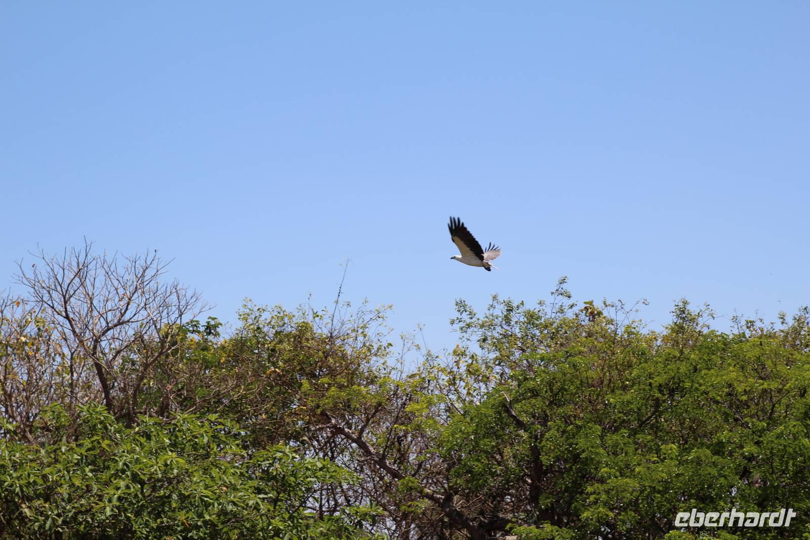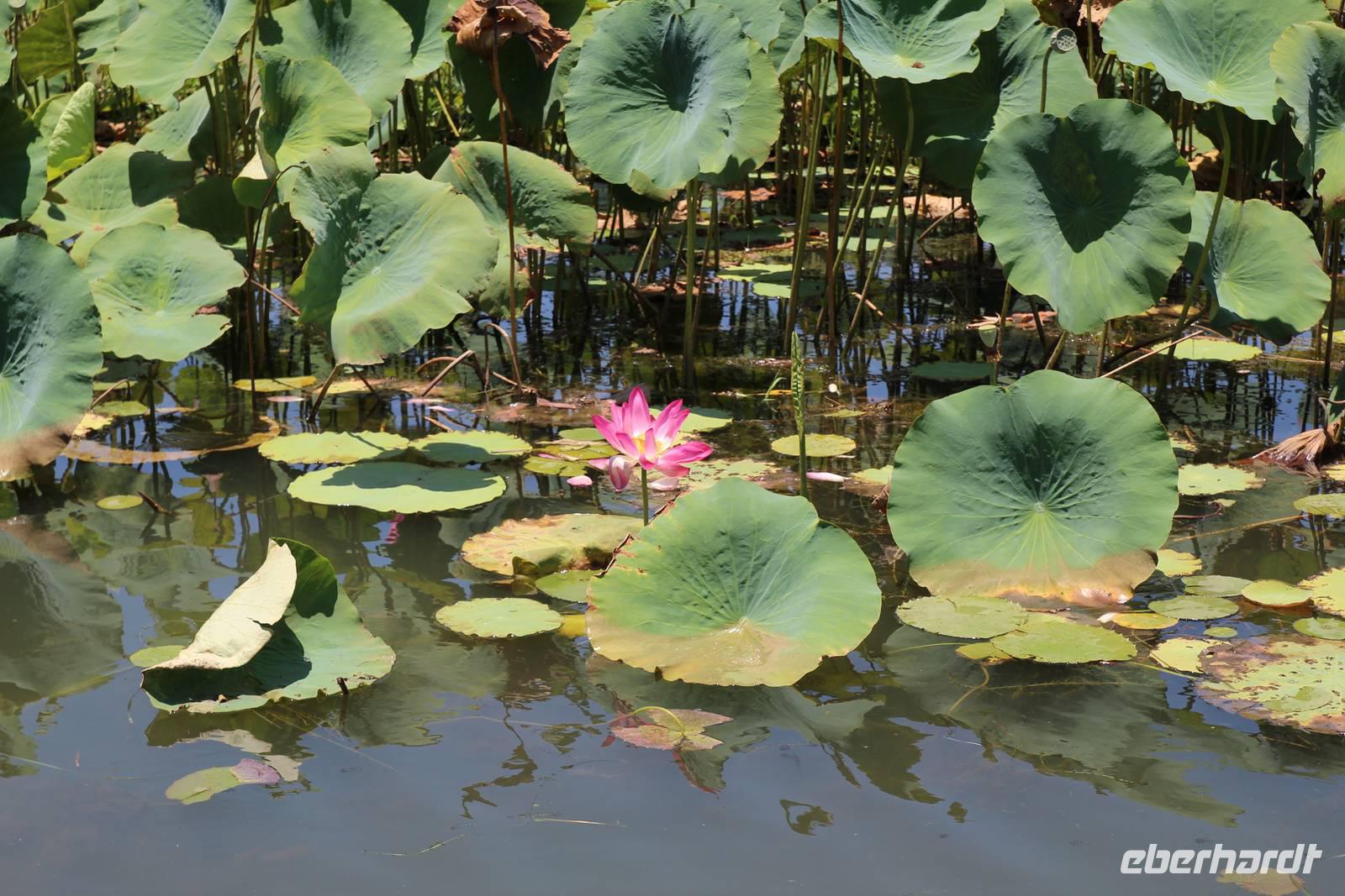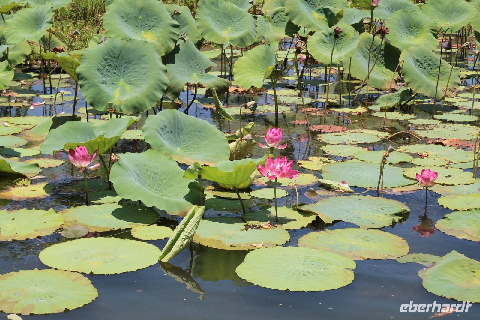 Heute konnten wir mal wieder etwas länger schlafen, denn wir wurden erst 10 Uhr vom Hotel abgeholt. Wir waren ab heute auch wieder in einem großen Bus unterwegs, der sehr luxuriös war, eine Frontkamera ließ uns alle von den Plätzen sehen, was vor unserem Bus los war. Unsere Fahrt ging zunächst ins Kulturzentrum Warradjin, wo wieder allerlei Wissenswertes über das Leben der Aborigines vermittelt wurde. Weiter ging die Fahrt zum Gewässer Yellow Water, einem so genannten Billabong. Hier wechselten wir vom Bus auf ein Boot, mit welchem wir dann auf dem Yellow Water eine Ausfahrt machten, auf der es allerlei zu entdecken gab. So sahen wir einige Krokodile, die unsere Fahrt still beobachteten, aber auch Greifvögel, wie den Weißkopfadler, sowie Gänse, Enten und auch Wasserbüffel konnten wir erblicken. Und auch die Pflanzenwelt beglückte uns unter anderem mit Wasserlilien und auch Lotusblumen. Da außer unserer kleinen Gruppe keiner auf dem Boot war, hatten wir auch genügend Freiraum um überall zu fotografieren.