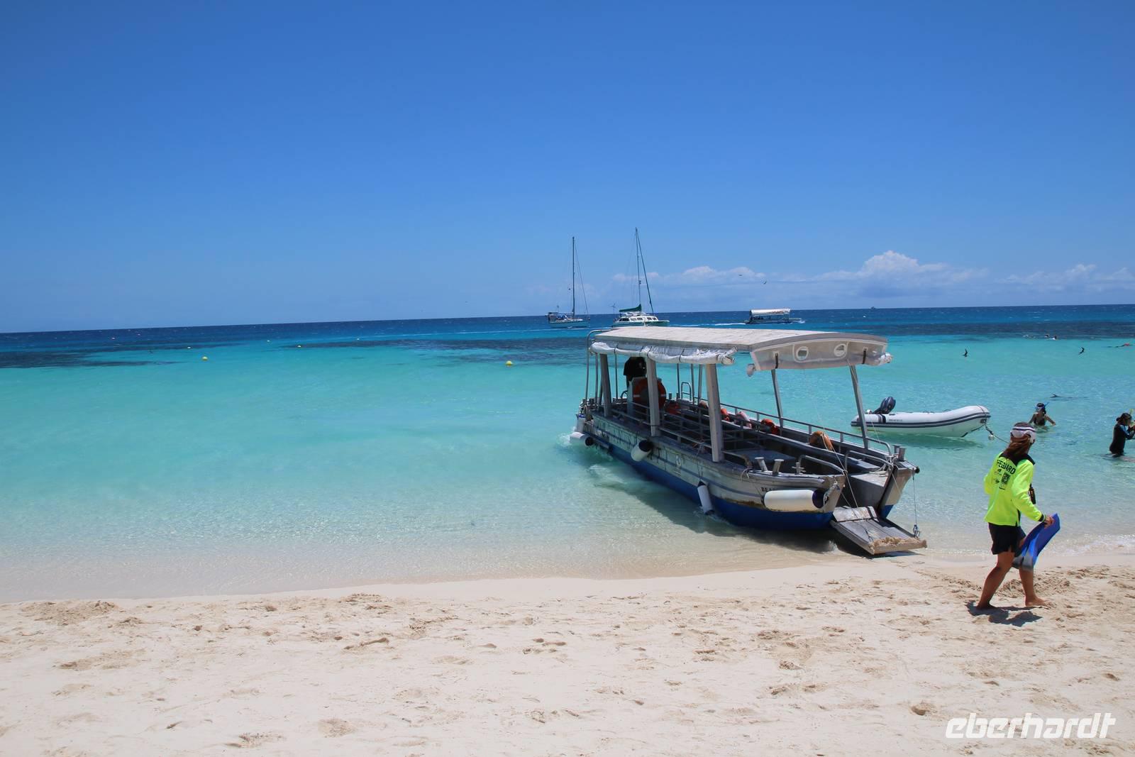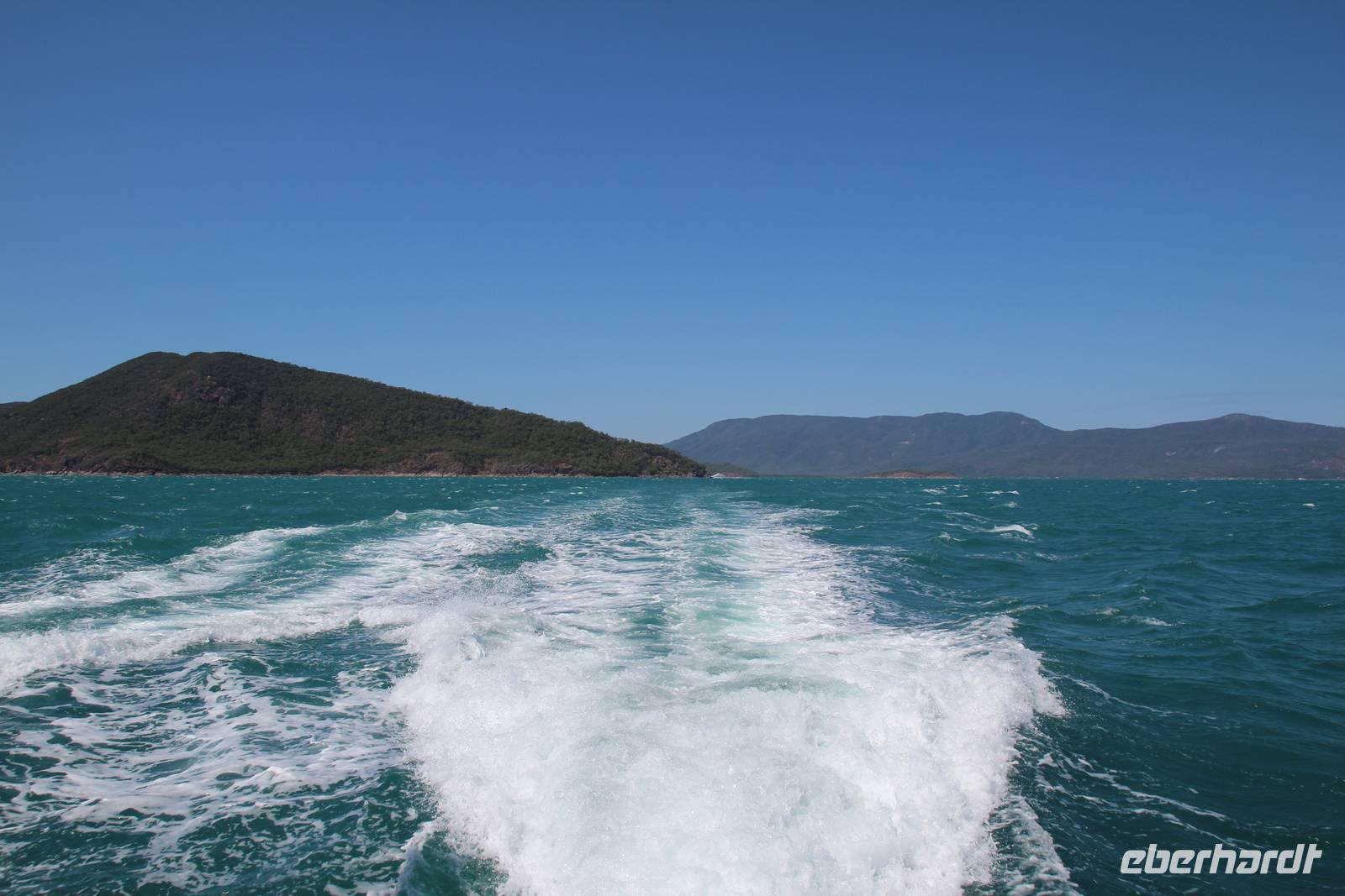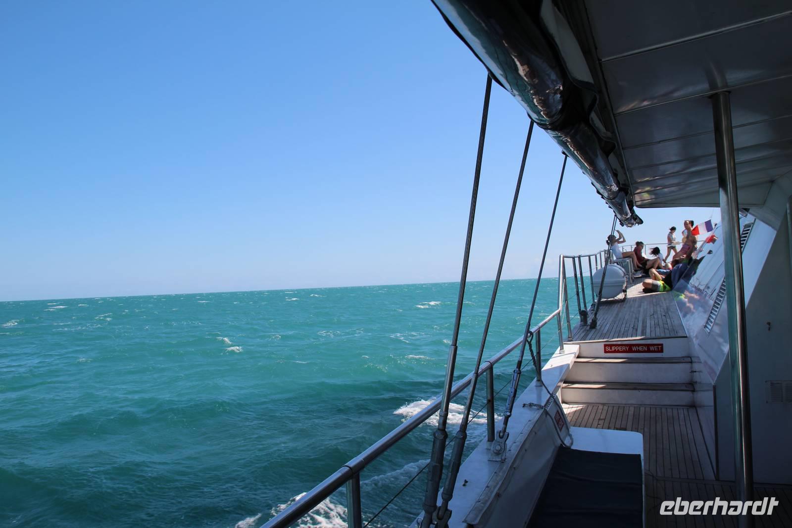 Die Erwartungen an den heutigen Tag waren doch recht hoch, denn es ging zum Great Barrier Reef, welches nicht nur ein UNESCO Weltnaturerbe ist, sondern auch als eins der sieben Weltwunder der Natur gilt. Vom Hotel wurden wir mit einem Bus an den Hafen gebracht, wo wir dann auf dem Katamaran der Ocean Spirit Cruises aufstiegen und in Richtung der Insel Michaelmas Cay ablegten. Knapp 3 Stunden dauerte die Fahrt bis dahin, die Besatzung an Bord versorgte und in diese Zeit aber auch mit kleineren Leckereien und teilte auch schon auf der Fahrt die Utensilien für den Schnorchelgang aus. An der Insel angekommen, setzten wir direkt mit einem kleineren Transferschiff zur Insel rüber, denn natürlich gibt es in einem Naturschutzgebiet keine Anlegestelle. Die Michaelmas Cay war ein Vogelschutzgebiet und für uns war auf den Insel ein kleiner Strand abgesteckt, an dem wir unsere Sachen ablegen konnten. Zum Ausspannen hat der Strand aber nicht wirklich eingeladen, denn die Gerüche der Vögel lagen deutlich in der Nase. Also packten wir unseren Schnorchel und die Taucherbrillen und gingen auf unsere Schnorcheltour zu den Korallen. Auch wenn unsere Erlebnisse natürlich kaum mit Erwartungen aus dem Fernsehen mithalten können, waren wir dennoch zum größten Teil beeindruckt von der Unterwasserwelt. Für alles andere müsste man dann wohl an anderen Stellen richtig Tauchen gehen. Nach unserer Schnorcheltour ging es dann wieder an Bord des Katamarans, wo wir auch ein kleines Mittagsbuffet serviert bekamen. Vor der Rückfahrt Richtung Cairns stiegen wir dann noch in ein Halb-U-Boot ein. Auf der Fahrt konnten wir dann nochmal einen weiteren Blick auf das Leben unter Wasser erhaschen, bevor wir dann mit der Ocean Spirit wieder in Richtung Cairns aufbrachen. Die Rückfahrt war dabei deutlich schaukliger als die Hinfahrt, aber wir haben das im Gegensatz zu einigen anderen alle gut verkraftet. Einige fanden auf der Fahrt sogar ein wenig Schlaf.