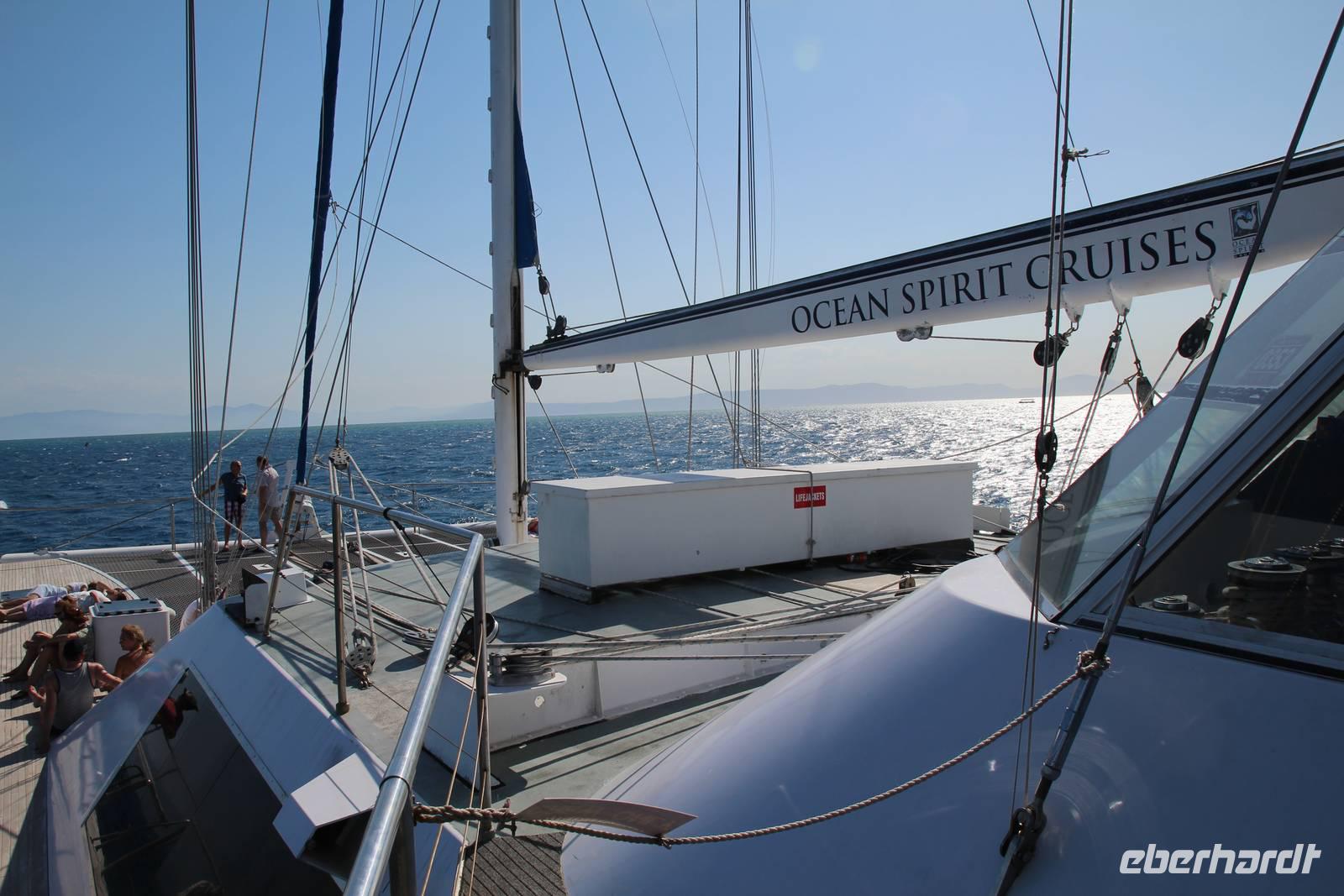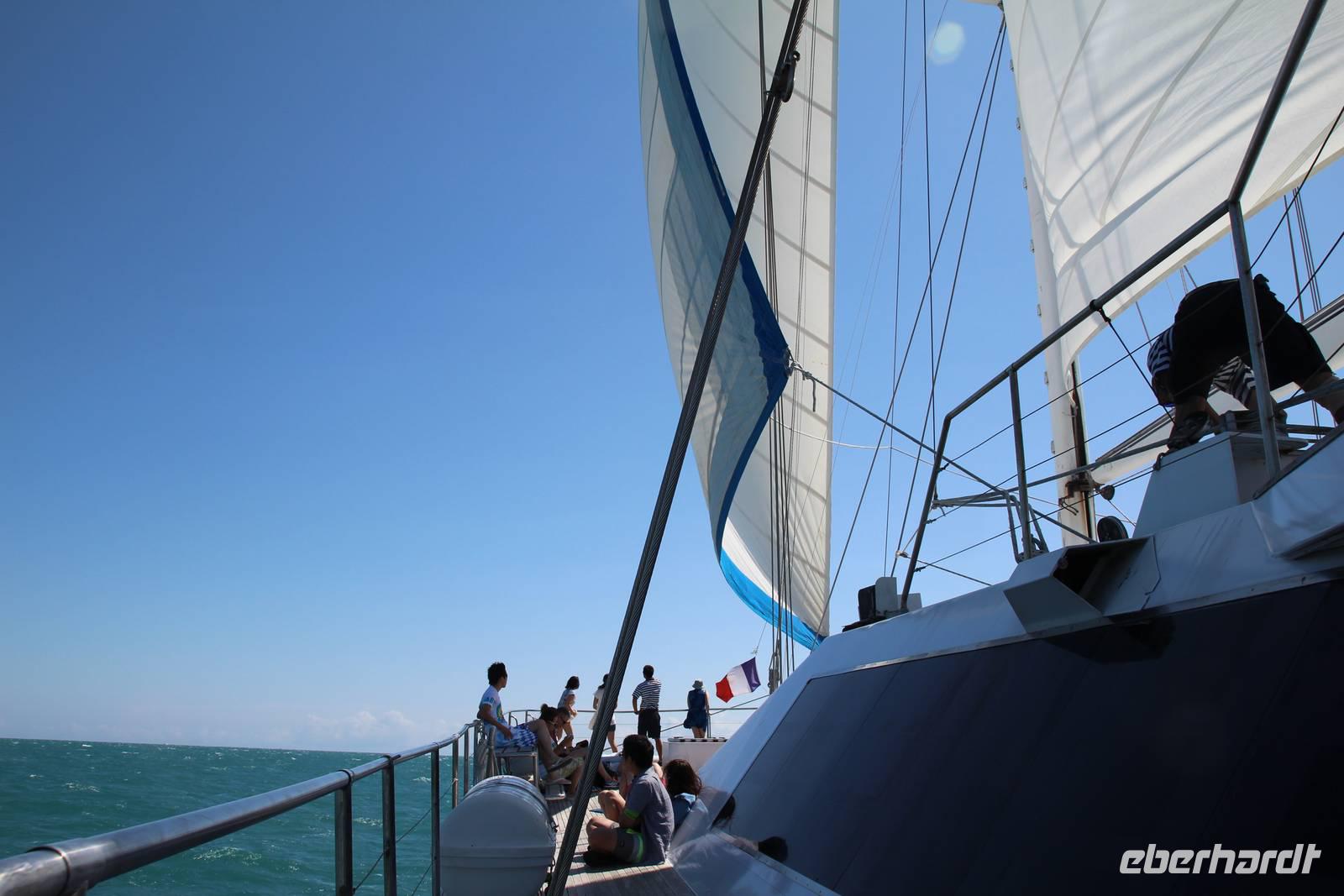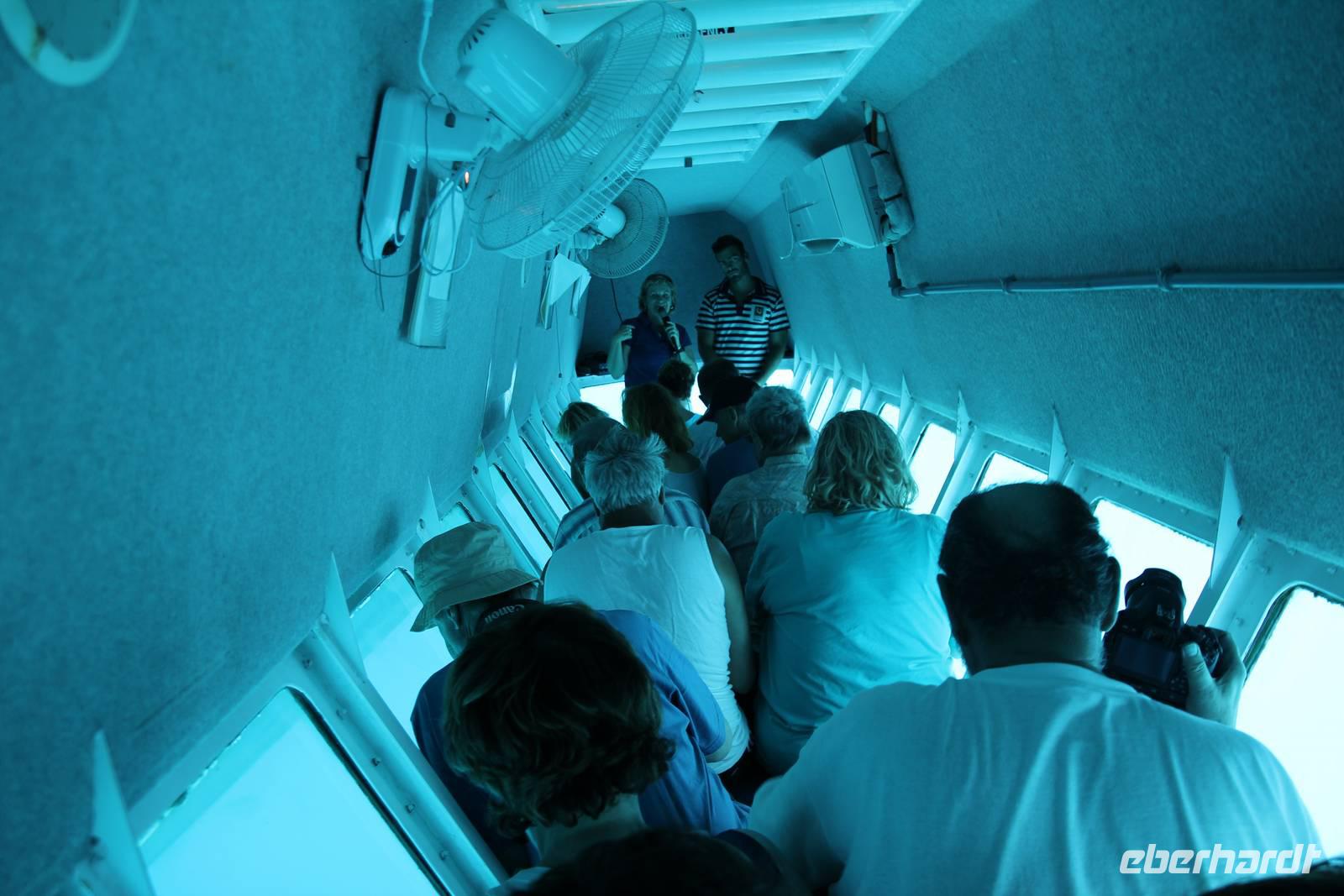 Die Erwartungen an den heutigen Tag waren doch recht hoch, denn es ging zum Great Barrier Reef, welches nicht nur ein UNESCO Weltnaturerbe ist, sondern auch als eins der sieben Weltwunder der Natur gilt. Vom Hotel wurden wir mit einem Bus an den Hafen gebracht, wo wir dann auf dem Katamaran der Ocean Spirit Cruises aufstiegen und in Richtung der Insel Michaelmas Cay ablegten. Knapp 3 Stunden dauerte die Fahrt bis dahin, die Besatzung an Bord versorgte und in diese Zeit aber auch mit kleineren Leckereien und teilte auch schon auf der Fahrt die Utensilien für den Schnorchelgang aus. An der Insel angekommen, setzten wir direkt mit einem kleineren Transferschiff zur Insel rüber, denn natürlich gibt es in einem Naturschutzgebiet keine Anlegestelle. Die Michaelmas Cay war ein Vogelschutzgebiet und für uns war auf den Insel ein kleiner Strand abgesteckt, an dem wir unsere Sachen ablegen konnten. Zum Ausspannen hat der Strand aber nicht wirklich eingeladen, denn die Gerüche der Vögel lagen deutlich in der Nase. Also packten wir unseren Schnorchel und die Taucherbrillen und gingen auf unsere Schnorcheltour zu den Korallen. Auch wenn unsere Erlebnisse natürlich kaum mit Erwartungen aus dem Fernsehen mithalten können, waren wir dennoch zum größten Teil beeindruckt von der Unterwasserwelt. Für alles andere müsste man dann wohl an anderen Stellen richtig Tauchen gehen. Nach unserer Schnorcheltour ging es dann wieder an Bord des Katamarans, wo wir auch ein kleines Mittagsbuffet serviert bekamen. Vor der Rückfahrt Richtung Cairns stiegen wir dann noch in ein Halb-U-Boot ein. Auf der Fahrt konnten wir dann nochmal einen weiteren Blick auf das Leben unter Wasser erhaschen, bevor wir dann mit der Ocean Spirit wieder in Richtung Cairns aufbrachen. Die Rückfahrt war dabei deutlich schaukliger als die Hinfahrt, aber wir haben das im Gegensatz zu einigen anderen alle gut verkraftet. Einige fanden auf der Fahrt sogar ein wenig Schlaf.