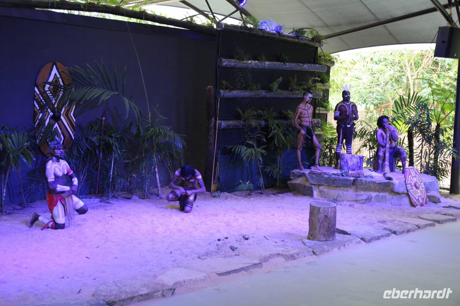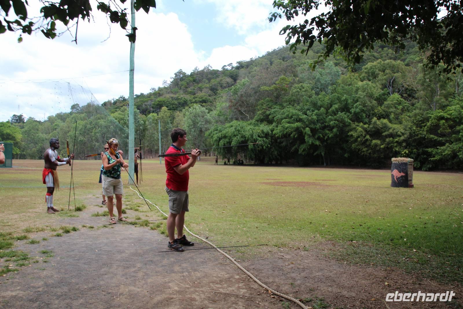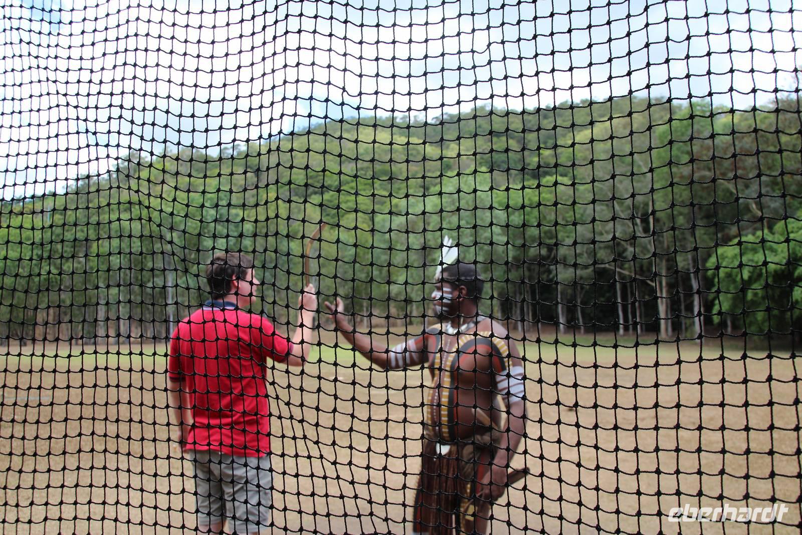 Unser letzter Programmtag war leider schon angebrochen, es galt nun also heute die letzten Eindrücke von Australien aufzunehmen und noch das ein oder andere Souvenir mitzunehmen. Unser Tag startete im Tjapukai Kulturpark, wo wir nochmal einiges über die Aborigines erfahren konnten. Wir bekamen hier eine Vorführung der Waffen und Musikinstrumente der Aborigines, so auch eine kleine Aufführung mit einem Didgeridoo. Im Anschluss daran wurden uns zunächst die verschiedenen Früchte des Outbacks erklärt, bevor wir dann an einer Tanzvorführung teilhaben konnten. Zu guter Letzt konnten wir uns dann noch beim Bumerang- und Speer-Werfen beweisen. Zum Glück waren wir aber von unseren Ergebnissen nicht abhängig, denn wahrscheinlich würden wir verhungern.