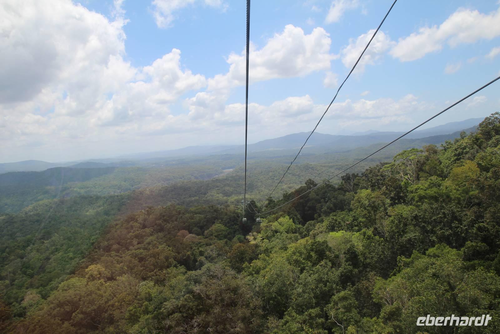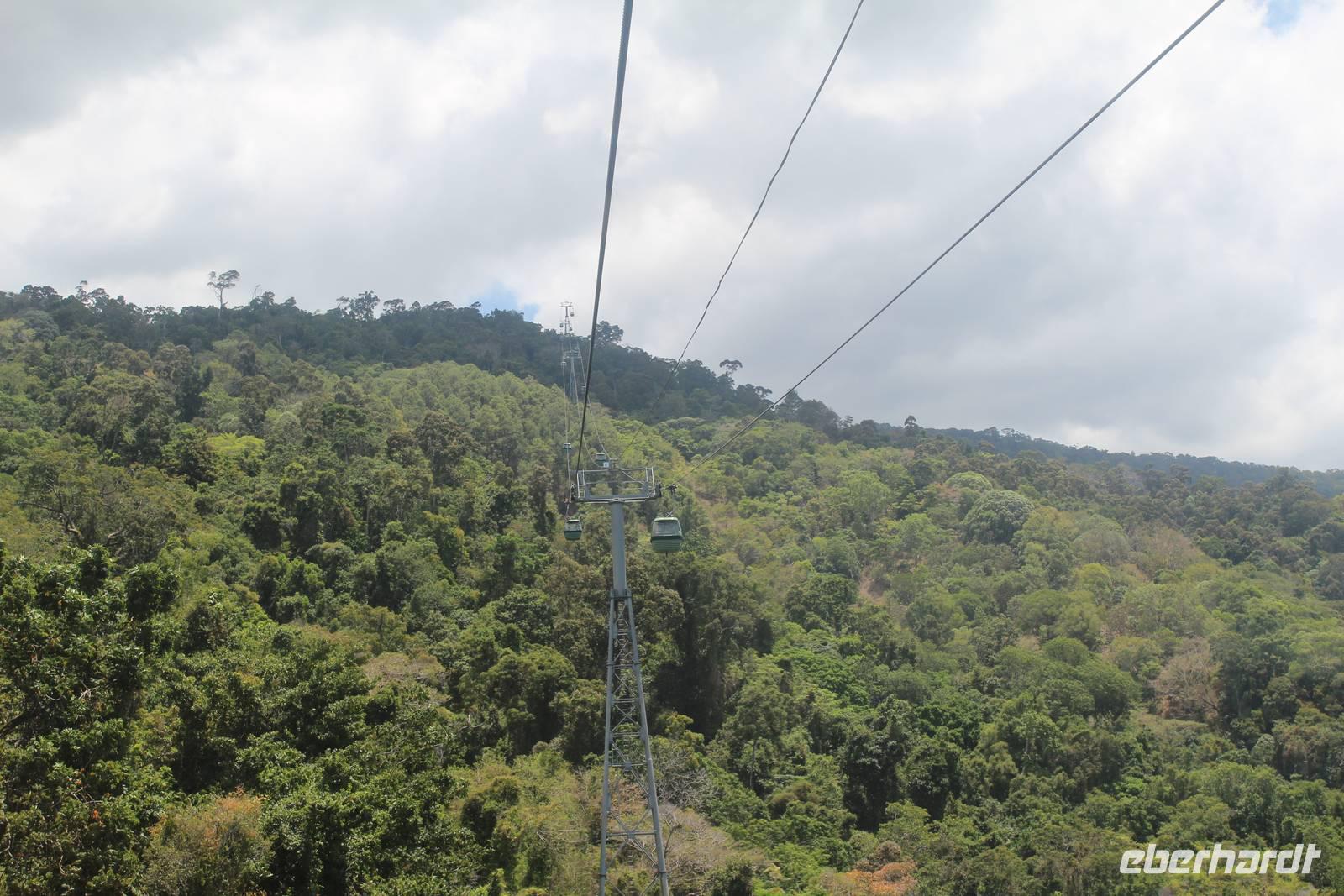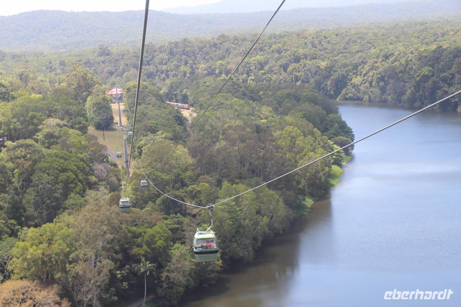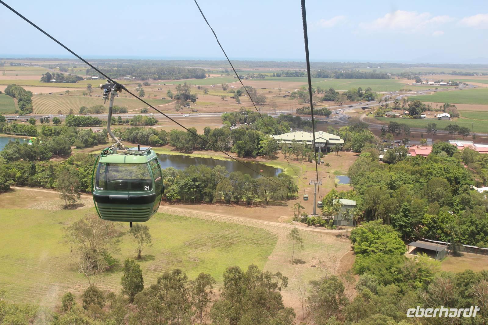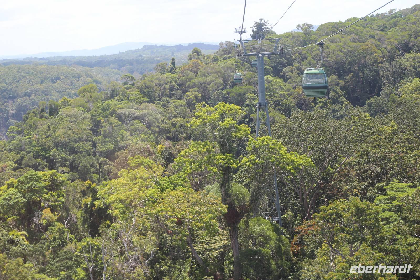 Danach ging es weiter mit der Skyrail. Die Seilbahn brachte uns auf der ersten Strecke zunächst zum Red Peak, dem höchsten Punkt der Seilbahn, zu dem wir schon knapp 15 Minuten unterwegs waren. Hier unternahmen wir einen kleinen Spaziergang durch den Regenwald, bevor es mit der Seilbahn weiter ging. Auf der weiteren gut 30minütigen Fahrt über den Dächern des Regenwalds kamen wir auch schon an den Barron Wasserfällen vorbei. An der Station fuhren wir aber vorbei, da wir die Wasserfälle schon auf dem Rückweg nach Cairns im Plan hatten. So erreichten wir dann zu späteren Mittagszeit das Örtchen Kuranda. Zur Eingewöhnung an die Heimat fanden sich auch einige in einem deutschen Lokal ein, wo es die typisch deutschen Würste und natürlich auch deutsches Bier gab. Die weitere Zeit nutzten wir dann hier noch ein wenig zum Bummeln und für die letzten Andenken.