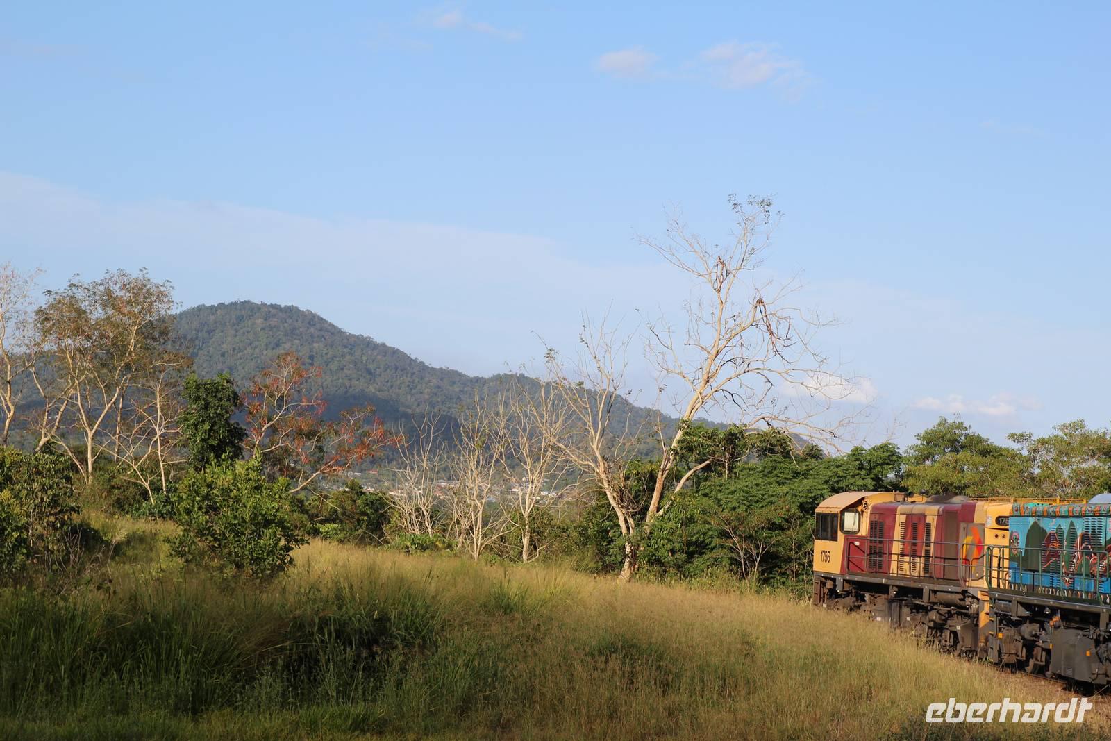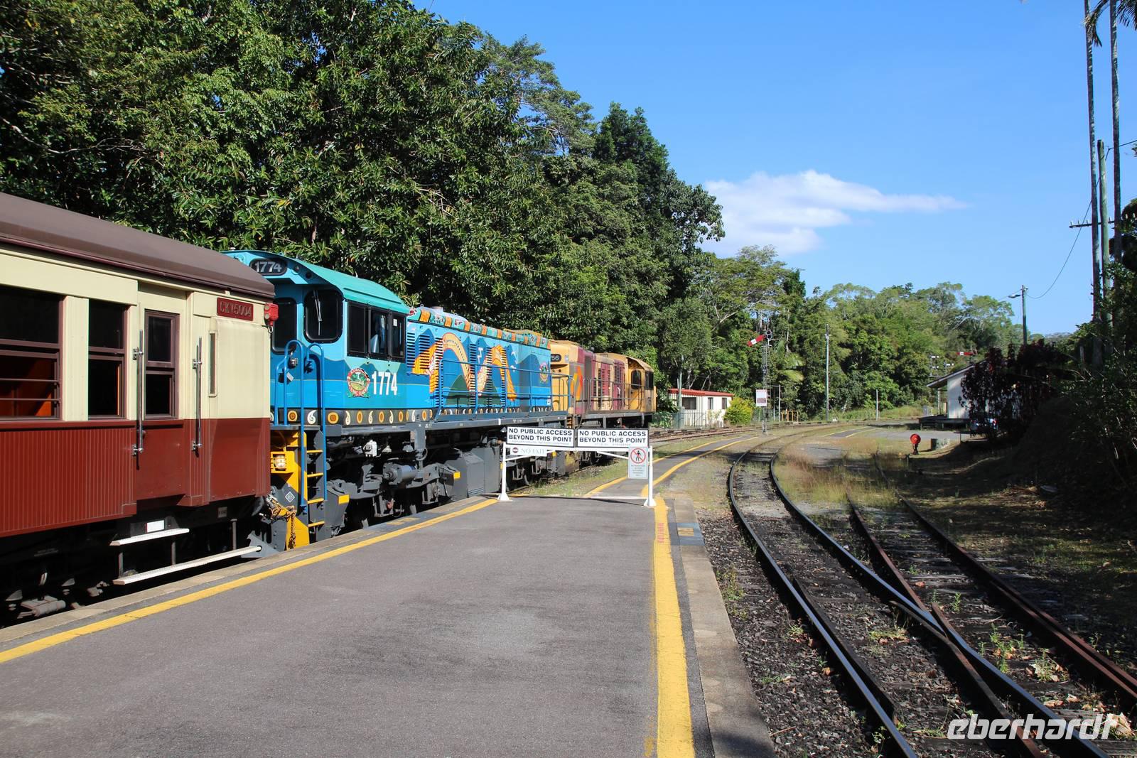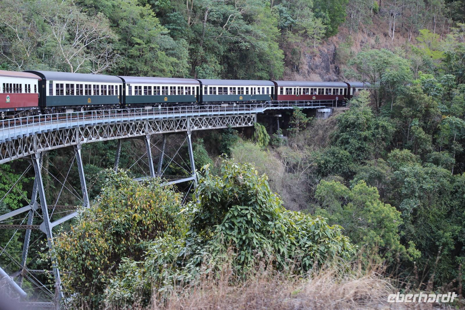 Zurück nach Cairns ging es mit der Kuranda Scenic Railway, der historischen Eisenbahnverbindung, die uns auf der seit 1891 unveränderten Strecke in knapp 1,5 Stunden bis zum Freshwater Bahnhof in die Nähe von Cairns brachte. Hier wurden wir dann vom Bus abgeholt, der uns wieder zum Hotel brachte, wo wir zum letzten Abend ein Barbecue Buffet serviert bekamen und in gemeinsamer Runde die ersten Reiseauswertungen machten.