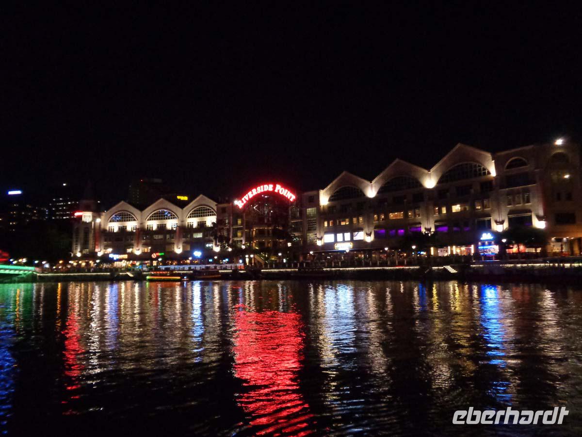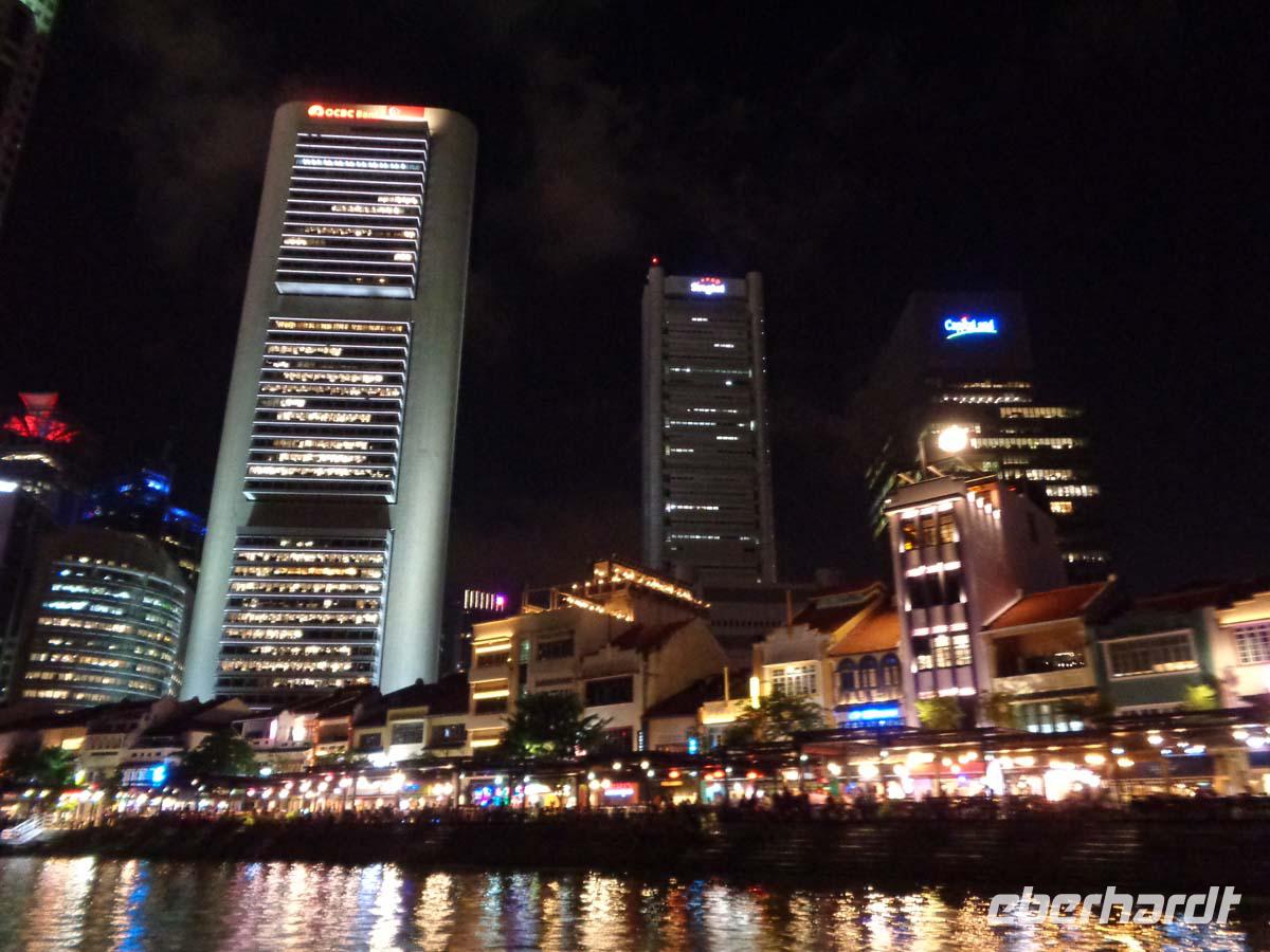 Das Frühstück gibt es an Bord. Nach meiner Uhr ist es Acht. Nun stelle ich die Zeit um und frühstücke eben um 14 Uhr. Wir landen pünktlich und nach den problemlosen Zollkontrollen empfängt uns unser örtl. Guide David, um uns im Bus zu unserem sehr zentral gelegenen Hotel zu begleiten. Danach werden wir ihn erst morgen wieder sehen. Nun wollen alle erst einmal duschen und sich frisch machen. Am Abend kommt der kleine Hunger und wir begeben uns zum Clarke Quai, einem alten Viertel mit historischen Lagerschuppen am Singapur River. Diese sind jedoch heute zu Restaurants, Geschäften Boutiquen und Kneipen umgestaltet worden. Wir nehmen einen kleinen Imbiss zu uns, was bei 30 Grad und 95% Luftfeuchtigkeit völlig ausreicht. Noch unternehmungslustig besteigen wir ein Boot zwecks einer Rundfahrt auf dem Fluß bei Nacht. Wir entscheiden uns für die Variante, in der eine Laser- und Wassershow vor dem neuen Marina Sands Hotel inkludiert ist. Die Stadt ist nachts prächtig illuminiert. Historische Gebäude, die Brücken und auch der Löwenfisch (Merlion) sind kunterbunt angestrahlt. Diese Skulptur ist eines der Wahrzeichen der Stadt. Der Löwe steht für die Gründungssage (Singapura heißt Löwenstadt) und der Fisch dafür, dass die Bewohner vom Meer leben. Das Boot stoppt mitten in der Marina Bay und wir sehen die Wassershow bequem vom Schiff aus, während sich vor dem supermodernen Marina Sands die Massen am Ufer drängeln. Die Skyline des CBD (Central Buisiness District) mit den Wolkenkratzern ist auch nachts eine stattliche Erscheinung. Davor am Ufer liegen noch ein paar Gassen des historischen Singapur mit Häusern aus dem 19. Jh. Dort wohnt jedoch niemand mehr, denn aus allen sind Restaurants und Bars geworden, wo nun nachts das Leben pulsiert. Vorbei an der alten Town Hall erblicken wir auch Sir Thomas Stamford Raffles als Denkmal auf seinem Podest. Er nahm 1819 das Gebiet im Namen der englisch-ostindischen Kompanie für das Empire in Besitz. Wieder angelandet gehen wir nur einige hundert Meter zu unserem Hotel und genießen den wohlverdienten Schlaf.