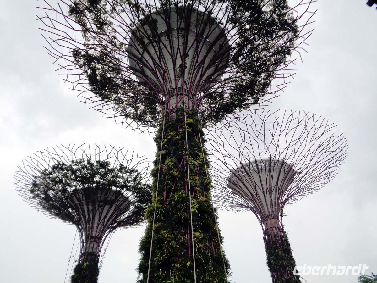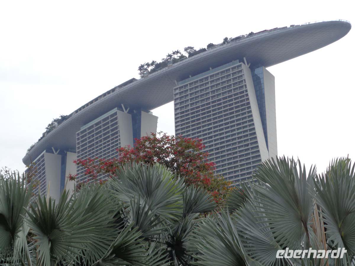 Nach einem opulenten Frühstück, welches europäische, asiatische und viele andere internationale Speisen bietet, wollen wir heute Vormittag Singapur auf eigene Faust kennen lernen. Ich besorge Taxis für alle und damit begeben wir uns zum „Singapur Flyer" dem höchsten Riesenrad der Welt. Aber es ziehen Gewitter auf und der Himmel ist am Horizont recht dunkel. So erfahren wir, dass diese Attraktion vorerst nicht öffnet. Plan B führt uns über die bereits präparierte und abgesperrte Piste der Formel 1 Rennstrecke über die Fußgängerbrücke „The Helix", von wo aus man einen wunderbaren Blick auf die Skyline der City, aber auch auf das Marina Sands Congress Center und Hotel hat. Gleich dahinter befinden sich die „gardens oft he bay", mit neuester Gartenarchitektur. Es ist der erste Teil eines öffentlichen Gartenringes, der einmal Singapur komplett umschließen soll. Wieder mit Taxis erreichen wir gegen Mittag unser Hotel, wo uns ein lokaler Guide zu einer Stadtrundfahrt erwartet.