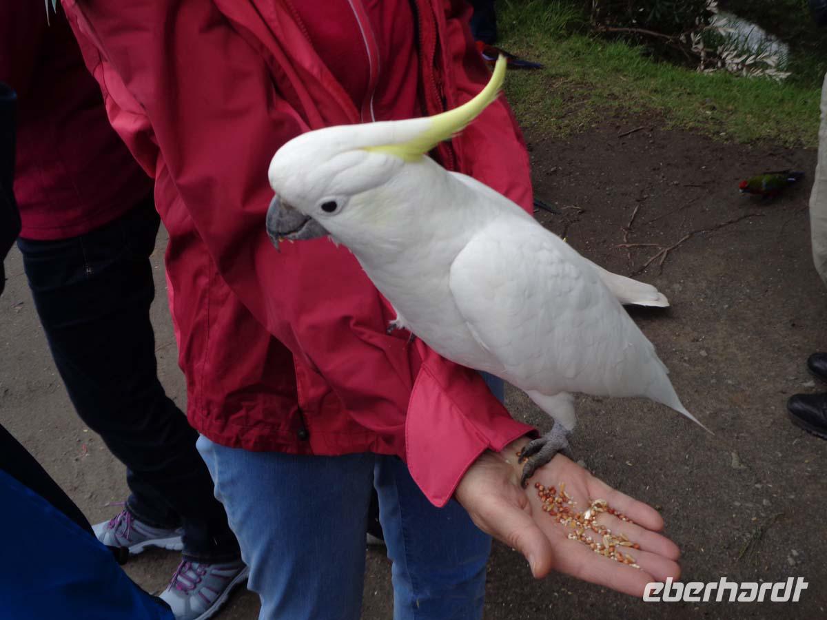 Nach einem opulenten Frühstücksbüffet treffen wir uns mit unserer lokalen Reiseleiterin zu einem Ausflug an die Küste. Die Great Ocean Road bereisen wir heute; eine der schönsten Panoramastraßen Australiens. Sie war quasi eine große Arbeitsbeschaffu7ngsmaßnahme für Soldaten zwischen 1919 und 1932 und wurde im wesentlichen von jenen per Handarbeit gebaut. Einen ersten Toilettenstop machen wir in der Ortschaft Lorne, wo man sich beim hierigen Bäcker auch noch etwas für unterwegs besorgen kann. Am Rastplatz Kenneth River bekommen wir ein erstes mal direkten Kontakt mit der heimischen Tierwelt. Sehr zutrauliche Rosella Papageien, Kakadus und auch die Magpies, eine Art Elstern lassen sich aus der Hand füttern. Nach unserem Mittag in Apollo Bay steuern wir dem Höhepunt des Tages entgegebn. Die 12 Apostel, von denen aber nur noch 8 stehen. Die Kalksteinfelsen ragen imposant aus der Brandung. Einige von uns unternehmen einen Helikopterflug an der Küste entlang, andere erkunden die Felsen vom Strand aus. Die Küste hier ist sehr gefährlich. Das erfahren wir am Loch Ard Aproachment. Das Schiff Loch Ard zerschellte an den Klippen und nur 2 der Passagiere überlebten die Havarie 1878. Der Tag ging wie im Flug vorbei und abends kommt der kleine Hunger. Wir gehen über den Yarra River ins Zentrum und nehmen noch eine Suppe zu uns. Die Stadt ist sehr schön beleuchtet und das Leben hier pulsiert bis in die späten Nachtstunden.