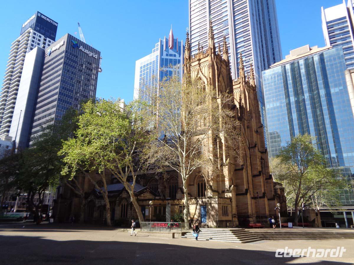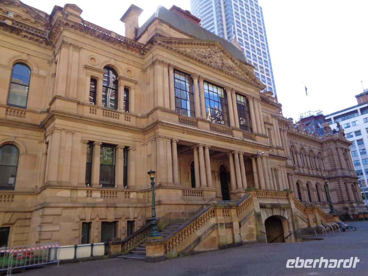 Zu Fuß führt uns heute der Weg in die City. Weite Entfernungen sind es nicht. Mit unserer Gästeführerin haben wir uns am Aquarium verabredet. Der Weg führt uns an der Kathedrale vorbei, die wir auch von innen sehen. Daneben steht gleich das alte Rathaus, die Cityhall und einen Steinwurf weiter das Victoria Building. Ein riesiger sehr schöner victorianischer Einkaufstempel, für den wir uns eine gute Stunde Zeit nehmen, um die schönen Auslagen in den Schaufenstern und vor allen die pompöse Architektur zu bestaunen. Am Darling Harbour angekommen, melde ich unsere Gruppe gecih für das Abendessen in der Coockle Bay Warf an. Mit unserem Guide schlendern wir zur weltberühmten Oper. Vom Dänischen Architekten Jörn Utzon entworfen, wurde sie 1953 eingeweiht. Sie steht auf der Unseco Welterbeliste. Utzon hat das selbst noch mitbekommen. Sicherlich ein Trost für ihn, denn er hatte sich mit den Auftraggebern noch während der Bauzeit so überworfen, dass er Australien verließ und nie wieder zurückkehrte. Nachdem wir eine sehr ausführliche Führung ind er Oper genossen haben schlendern wir kurz ins alte Zollhaus um hernach unser Schiff für eine Hafenrundfahrt zu besteigen. Vom Wasser aus sieht die Stadt wieder ganz anders aus. Nach dieser Tour spazieren wir noch durch The Rocks, das historische alte Viertel mit seinen vielen Bars und Kneipen, an der Garnisonskirche vorbei bis zum Planetarium. Unser Bus erwartet uns schon, um uns zu Hotel zu fahren. Abends genießen wir direkt am Darling Harbour im berühmten Nicks Seafoodrestaurant unser Abendessen. Der Rückweg durch die City wird durch ein in rotes Licht getauchtes Rathaus verschönert.