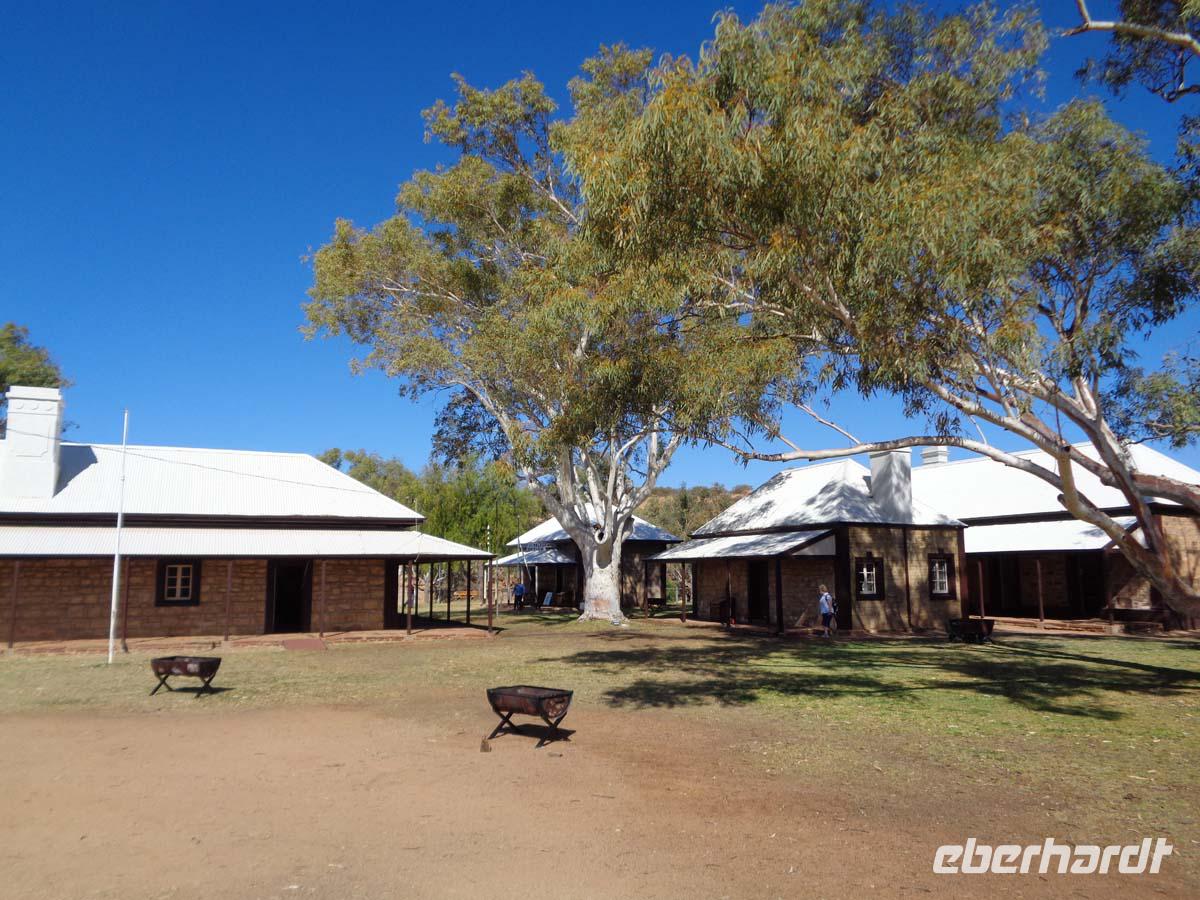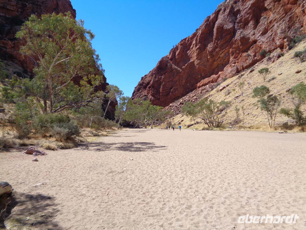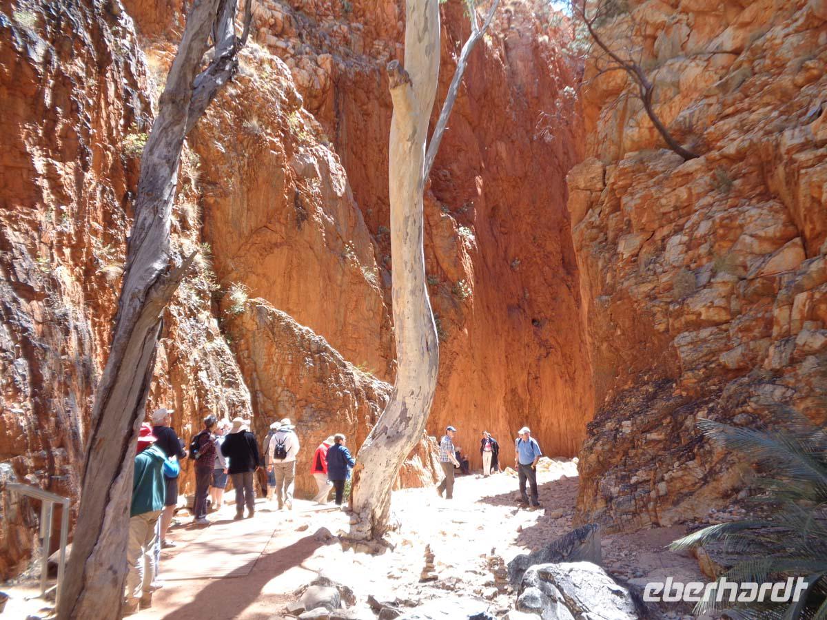 Der Vormittag steht im Zeichen des Desert Parks, in dem verschiedenen Tier- und Pflanzenarten vorgestellt werden. Gleich zu Beginn zieht eine Flugschau die Besucher an. Man kann sich wunderbar in der weitläufigen Anlage ergehen und viel über die Natur erfahren. Auch ein Nachttierhaus gibt es und es erstaunt, was sich des Nachts so alles draußen tut. Australien besitzt die giftigsten Spinnen und Schlangen der Welt. Wir bekommen sie gottlob nur hinter Glas zu Gesicht. Am frühen Nachmittag zeigt uns Carsten eine Schlucht namens Standley Chasem. Der Weg hindurch ist nicht anstrengend. Ein Mittagessen im nahe gelegenen Restaurant rundet den Besuch ab. Ein zweiter Spaziergang findet an einem ausgetrockneten Flußbett statt. In diesem stehen große Bäume namens Red River gum. Wasser muss sich also noch im Untergrund befinden. Leider halten die Wallabys, also die kleinen Felsenkängurus wohl gerade Mittagsschlaf. Theoretisch sollte man sie hier erblicken können. Aber wir haben ja keinen Termin mit ihnen vereinbart. Die Landschaft ist trotzdem wunderschön. Simpson Gap heißt dieser verwunschene Platz. Nachmittags sind wir schon wieder in der Stadt. Hier besichtigen wir noch die alte Telegraphenstation, quasi die ehemalige Verbindung zur Außenwelt. Einige gehen danach noch gucken und shoppen, andere nutzen die Gelegenheit zu einem erfrischenden Bad im Pool.
