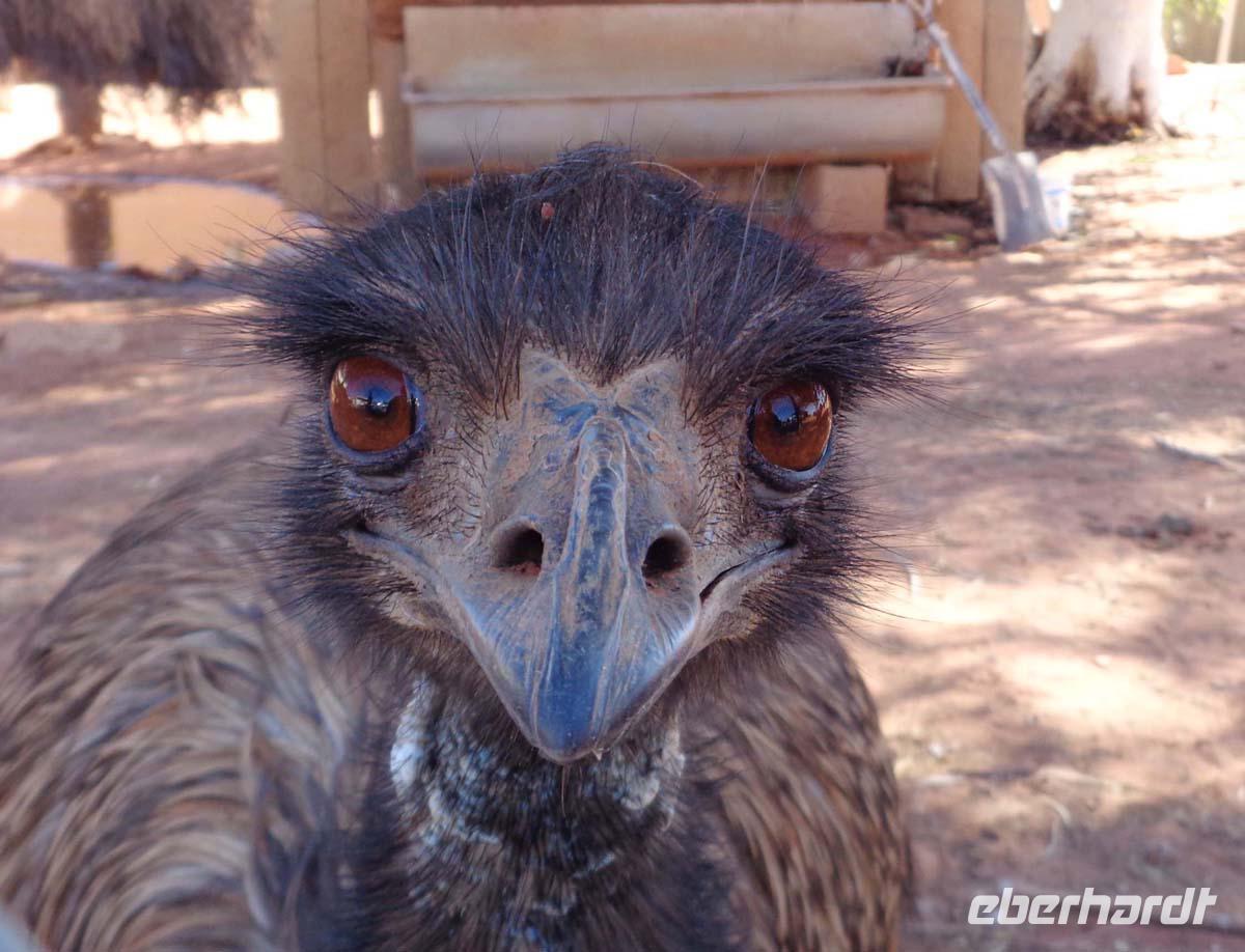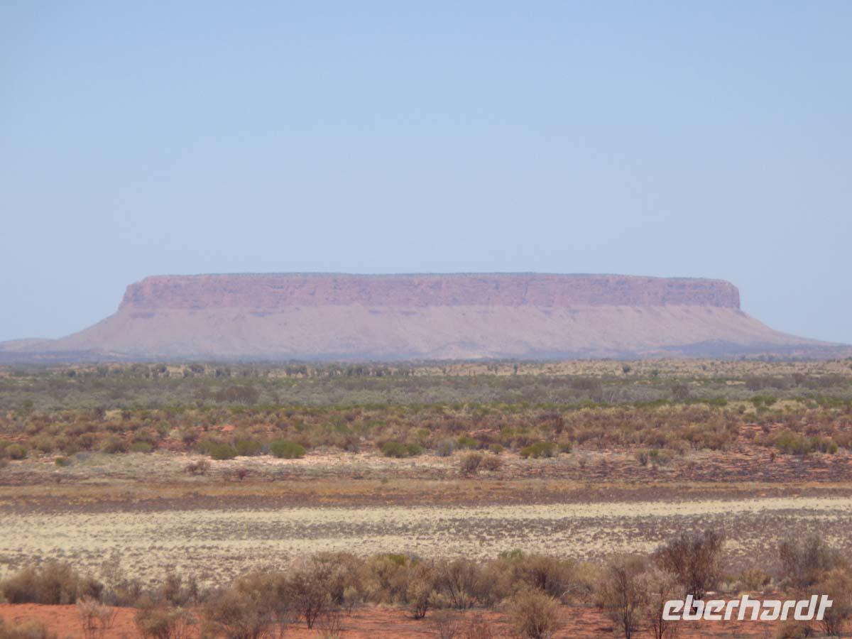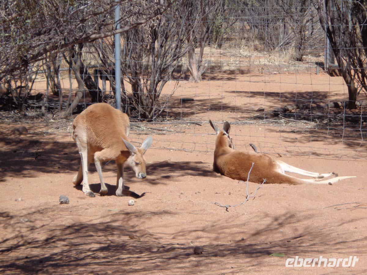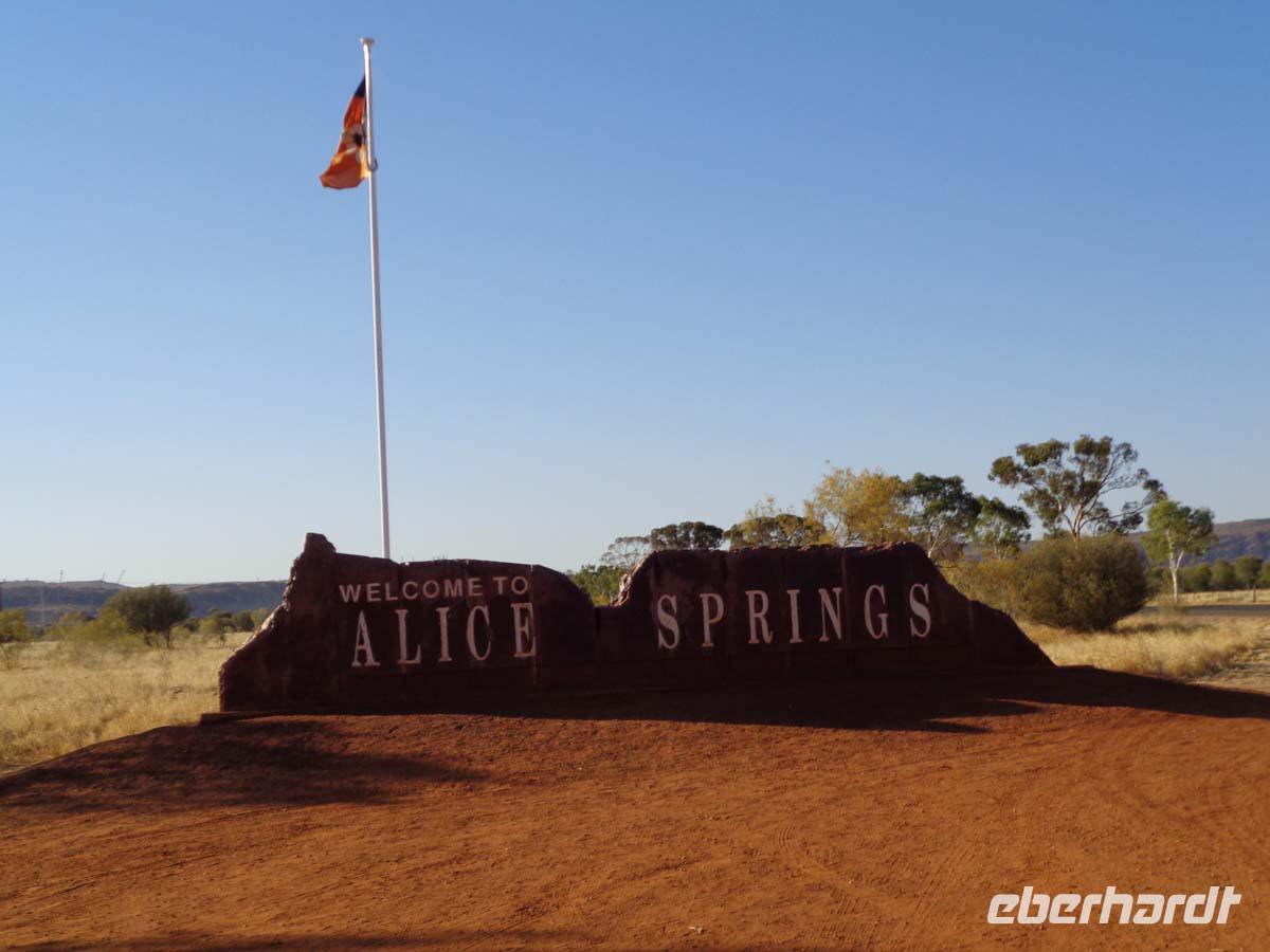 Wir stehen ganz früh auf. Es ist noch stockfinster, aber wir wollen den Sonnenaufgang nicht verpassen. Rechtzeitig sind wir am Aussichtspunkt und erleben das Farbenspiel des Felsens. Die Geräusche der erwachenden Natur runden das Erlebnis ab. Die Morgenkühle wird bald wieder der Hitze des Tages weichen. Am unweit gelegenen Kulturzentrum nehmen wir unser Frühstück ein, um danach noch eine kurze Wanderung zum Mutitjuli Wasserloch zu unternehmen. Wieder erklärt uns Carsten ausführlich die Felszeichnungen der Aborigines und auch die eine oder andere Pflanze. Alles ist doch merkwürdig fremd. Nichts gedeiht hier, was wir aus heimischen Gärten kennen.Carsten erzählt auch, dass das nächste Wasserloch 20 km entfernt ist. Man sollte sich also schon gut auskennen, sonst kann es hier schnell kritisch werden. Nun führt uns unsere Reise durch das Outback fast immer schnurgeradeaus. Unser Mittagsimbiss nehmen wir im Eldoura Roadhouse ein, wo auch Emus zu bestaunen sind. Weil das Bergfest ansteht, besorge ich eine Flasche Bundaberg Rum und Säfte zum mixen. Abwechslung bringt auch ein Stop mit Sicht auf den Connor Mountain, einem riesigen Tafelberg, sowie der Besuch einer Kamelfarm, wo sich auch die Gelegenheit zu einem Kamelritt anbietet. Gegen Abend erreichen wir Alice Springs und stoßen am Ortsschild mit dem Australischen Rum an. Ein üppiges Mahl nehmen wir abends im Overlanders Steakhouse zu uns. Dort fahren wir mit Taxen hin und zurück, denn es sind doch mehr als 2 km durch mitunter schlecht beleuchtete Straßen.