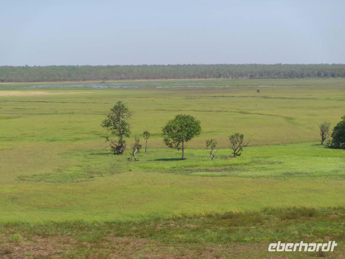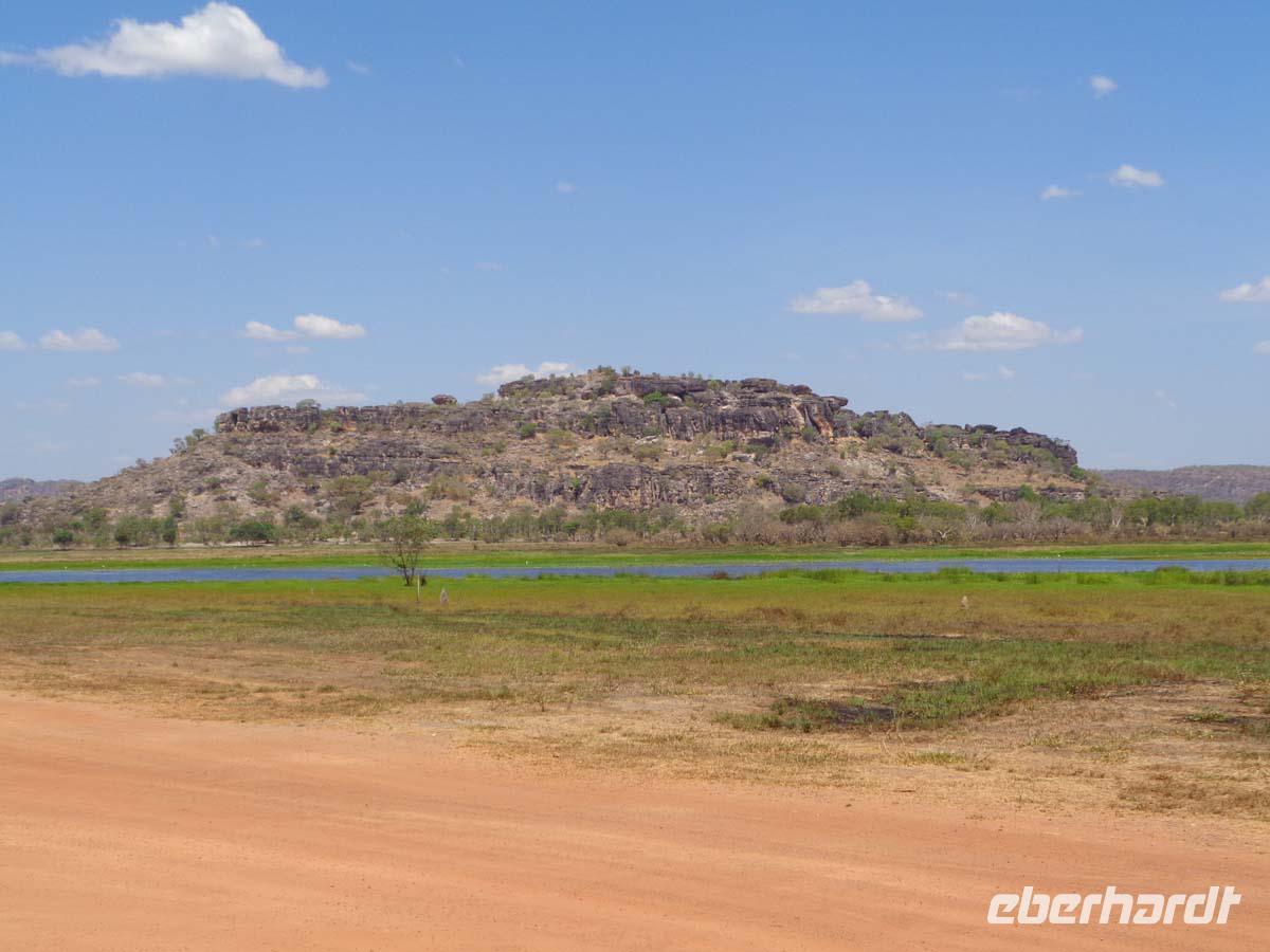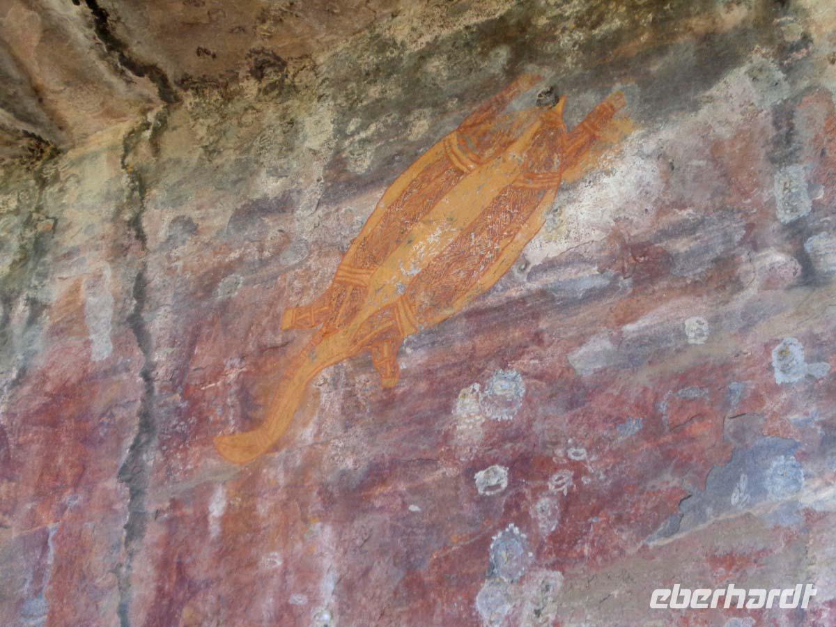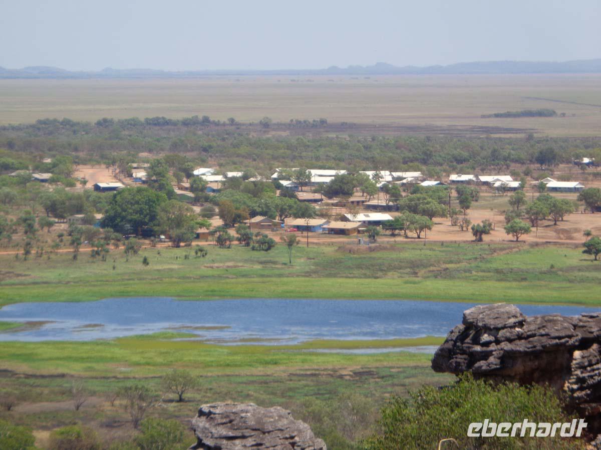 Für halb 5 Uhr habe ich einen Weckruf bestellt. Mit Lunchpacketen werden wir heute in zwei Allrad getriebenen Geländebussen ins Arnhem Land fahren. Das über 100000qkm große Gebiet ist heute wieder Eigentum der ursprünglichen Bevölkerung und man kommt dort auch nur mit einer Sondergenehmigung hinein. Da achten die Leute sehr drauf. Wir reisen über staubige unbefestigte Pisten in das Dorf Gunbalanya, von wo uns zwei Einheimische Guides begleiten. Unser Ziel ist der nahe gelegene Injalak Hill, dessen bedeutende Felszeichnungen auf der Unesco Welterbeliste stehen. Der Weg ist steinig und steil, also nichts für Menschen mit Knie oder Hüftproblemen. Unsere Guides erläutern uns die Felszeichnungen, von denen einige 20000 Jahre alt sein sollen. Oben angekommen erwartet uns ein Picknick mit allem, was dazu gehört. Wie das unsere Guides so schnell hierauf bekommen haben, kann sich niemand erklären. Bei herrlicher Aussicht lassen wir es uns schmecken, und unten am Bus warten die Führer mit geeisten Orangenscheiben auf. Einfach köstlich. Wieder im Dorf steht uns noch das Injalak Kunsthandwerkzentrum offen und wir haben Gelegenheit, Frauen beim Siebdruck auf Stoff zuzuschauen. Eisgekühlte Handtücher erfrischen bei der Hitze hier. Am Nachmittag verlassen wir das Arnhem Land und nach dem westlichen Alligator River, in dem wir unser erstes Krokodil sichten erreichen wir den Kakadu Nationalpark. Dieser schließt sich westlich ans Arnhem Land an. Mitten drin in der Natur befindet sich unser Resort. Schnell finden sich alle am Pool ein und genießen das kühle Nass. Das Abendessen gibt es auch im Resort. Wo auch sonst, denn die nächste Ortschaft ist bestimmt -zig kilometer weit entfernt.