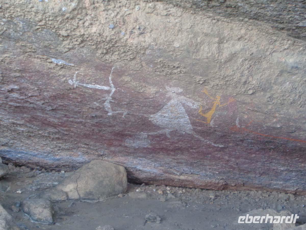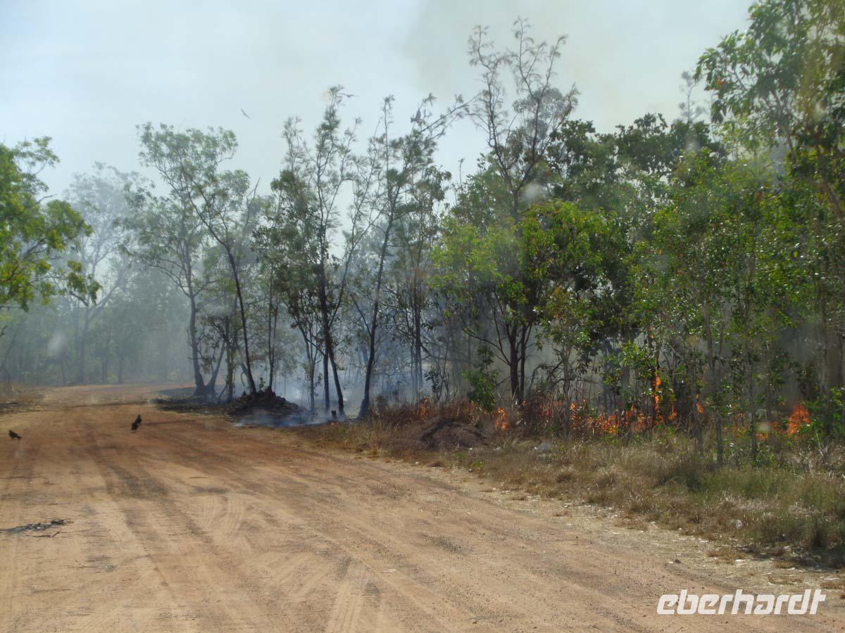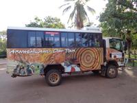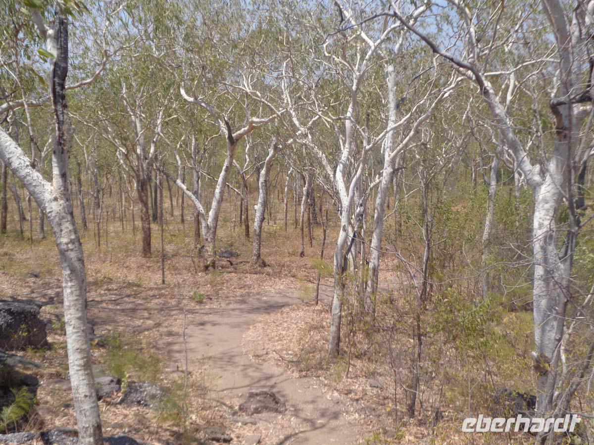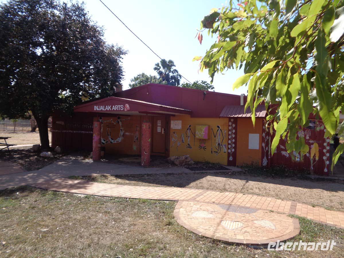 Für halb 5 Uhr habe ich einen Weckruf bestellt. Mit Lunchpacketen werden wir heute in zwei Allrad getriebenen Geländebussen ins Arnhem Land fahren. Das über 100000qkm große Gebiet ist heute wieder Eigentum der ursprünglichen Bevölkerung und man kommt dort auch nur mit einer Sondergenehmigung hinein. Da achten die Leute sehr drauf. Wir reisen über staubige unbefestigte Pisten in das Dorf Gunbalanya, von wo uns zwei Einheimische Guides begleiten. Unser Ziel ist der nahe gelegene Injalak Hill, dessen bedeutende Felszeichnungen auf der Unesco Welterbeliste stehen. Der Weg ist steinig und steil, also nichts für Menschen mit Knie oder Hüftproblemen. Unsere Guides erläutern uns die Felszeichnungen, von denen einige 20000 Jahre alt sein sollen. Oben angekommen erwartet uns ein Picknick mit allem, was dazu gehört. Wie das unsere Guides so schnell hierauf bekommen haben, kann sich niemand erklären. Bei herrlicher Aussicht lassen wir es uns schmecken, und unten am Bus warten die Führer mit geeisten Orangenscheiben auf. Einfach köstlich. Wieder im Dorf steht uns noch das Injalak Kunsthandwerkzentrum offen und wir haben Gelegenheit, Frauen beim Siebdruck auf Stoff zuzuschauen. Eisgekühlte Handtücher erfrischen bei der Hitze hier. Am Nachmittag verlassen wir das Arnhem Land und nach dem westlichen Alligator River, in dem wir unser erstes Krokodil sichten erreichen wir den Kakadu Nationalpark. Dieser schließt sich westlich ans Arnhem Land an. Mitten drin in der Natur befindet sich unser Resort. Schnell finden sich alle am Pool ein und genießen das kühle Nass. Das Abendessen gibt es auch im Resort. Wo auch sonst, denn die nächste Ortschaft ist bestimmt -zig kilometer weit entfernt.