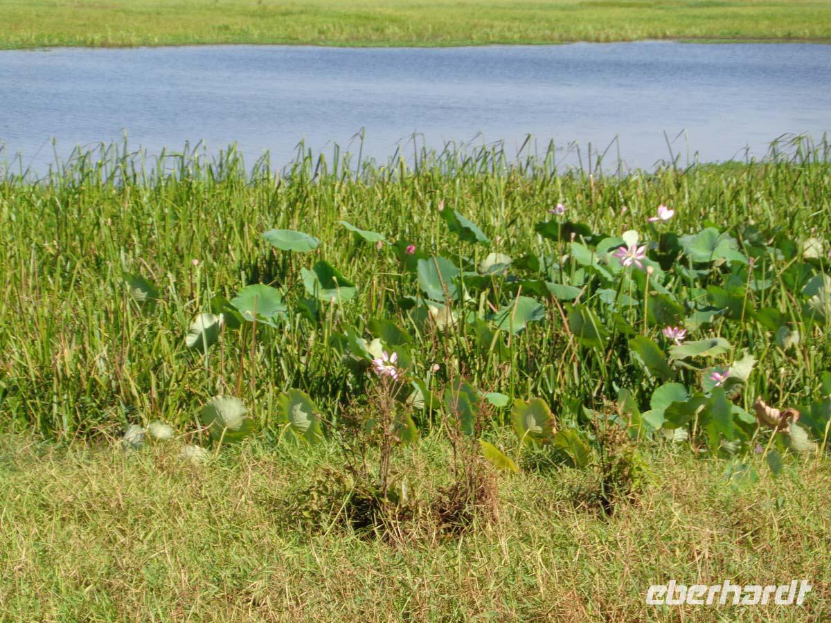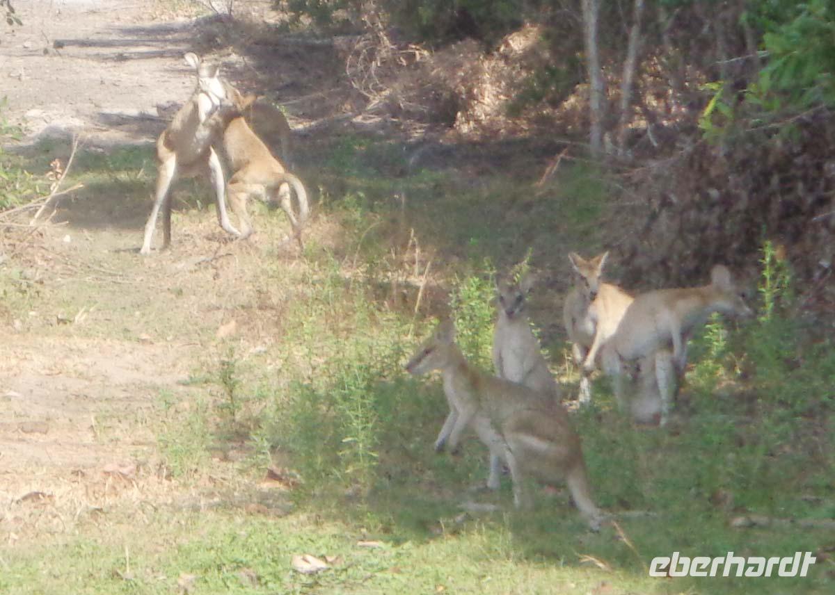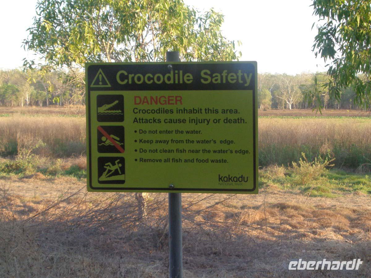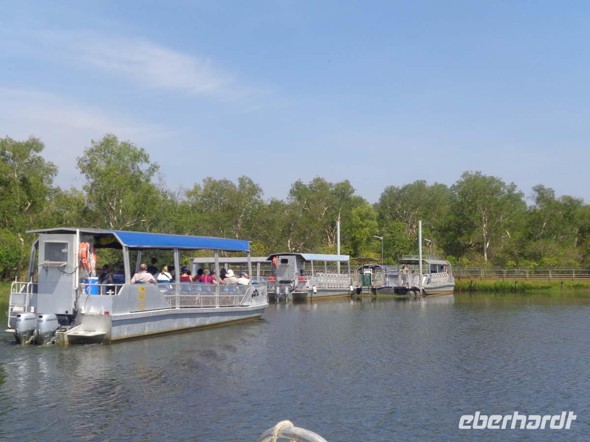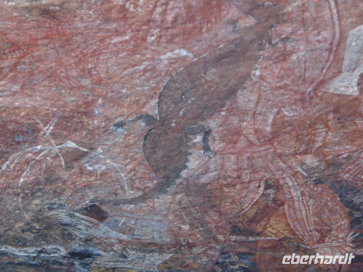 Noch einmal bestaunen wir Felszeichnungen. Diesmal am Nourlangie Rock. Die kleine Wanderung ist im gegensatz zu gestern eine wahre Erholung. Es geht ca. 1,5 km über gut ausgebaute fast ebene Wege an den Kultstätten der Aborigines vorbei. Zudem ist es unter den Felsen und im Wald recht schattig und die Hitze deshalb erträglich. Am Nachmittag unternehmen wir eine Bootsfahrt auf dem Yellow Water. Esther kennt jeden Vogel. Der Kapitän warnt uns, uns nicht über die Reeling zu lehnen und auch keinen Hand rüberhängen zu lassen. Es soll von Krokodilen nur so wimmeln, und die können hoch aus dem Wasser schnellen. Zunächst tut sich nichts, aber dann sehen wir das erste und noch eines und noch eines. Am Ende werden es acht Krokodilbegegnungen sein. Das beste kommt zum Schluss. Ein Weibchen steuert zielgerichtet auf ein großes Männchen zu. Sie umkreisen sich und reißen die Mäuler auf. Und dann kommt es zur Begattung. Damit hatte niemand gerechnet. Die Sensation ist perfekt. Nach dem Akt sucht das Weibchen aber sehr schnell das Weite. Den letzten Besuch des Tages machen wir im Warradjin Kulturzentrum, wo wir nochmals Gelegenheit haben, uns eingehend mit der Kultur der ortsansässigen Stämme zu beschäftigen. Leider herrscht hier absolutes Photographierverbot, was mit Urheberrechten zusammenhängen soll. Nach einem ausgedehnten Bad im Pool nehmen wir unser Abendessen wieder im Resortrestaurant ein.