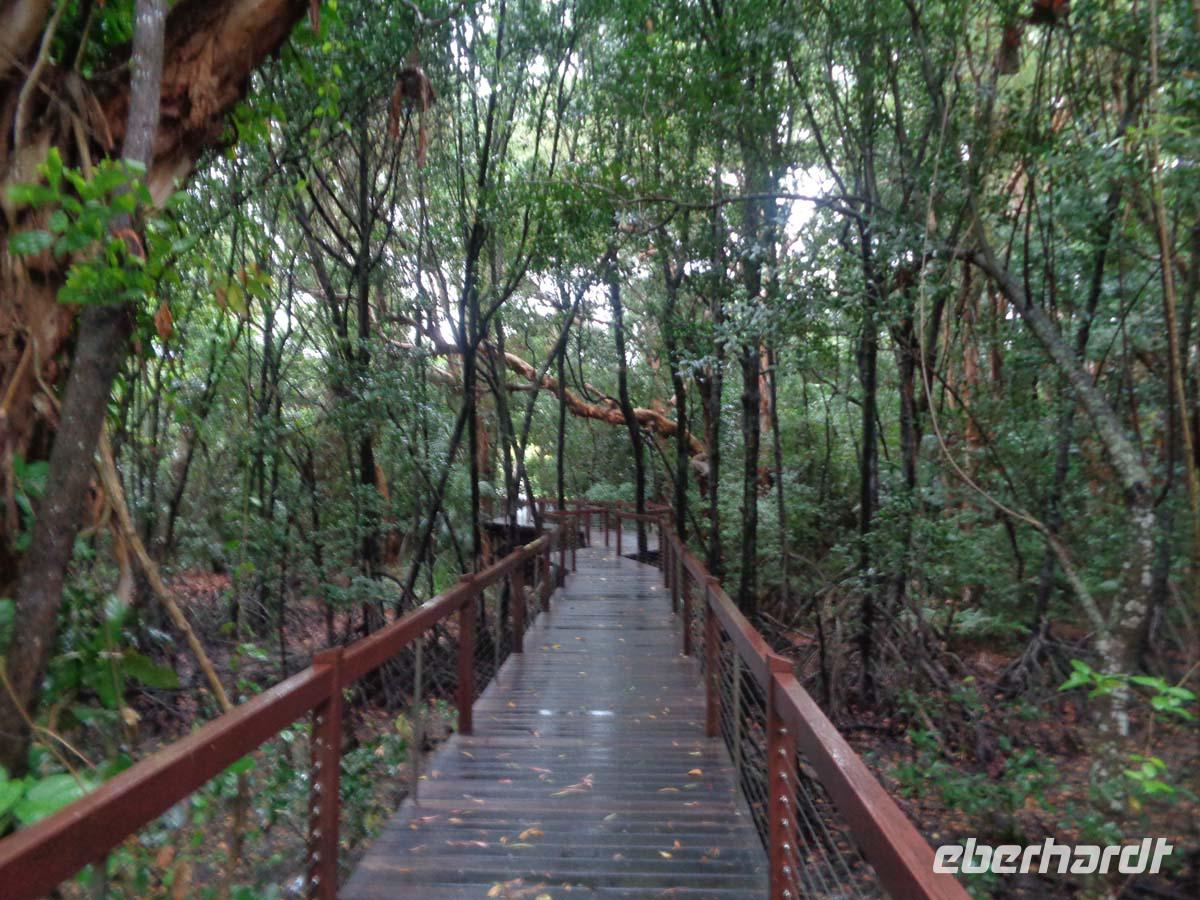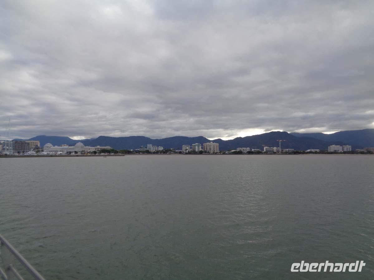 Heute ist völliges Relaxen angesagt. Ein freier Tag steht im Programm. Ich verabrede mich mit einem großen Teil der Gruppe zu einem Erkundungsspaziergang. Doch wir sind nicht weit gekommen, da geht ein Platzregen nieder. Das hat keinen Zweck. Wir kehren ins Hotel zurück und versuchen individuell unser Glück am Nachmittag. Warm ist es trotz Regens und die Pools laden zum Baden ein. Die Strandpromenade ist wirklich sehr schön. Aber auch hier stehen am Strand Warnschilder wegen der Krokodile und vor allem der Würfelquallen. Trotzdem sieht man viele Menschen im Wasser. Das Wetter macht auch den Gästen einen Strich durch die Rechnung, welche für den Mittag einen Rundflug über das Riff gebucht hatten. Die Fluggesellschaft ruft im Hotel an und sagt die Flüge wegen des miesen Wetters und schlechter Sicht ab. Die Australier erfreut der Regen allerdings, denn seit 9 Wochen hat es hier nicht mehr geregnet. Den Tag beschließen wir beim Abendbüffet im Hotel.