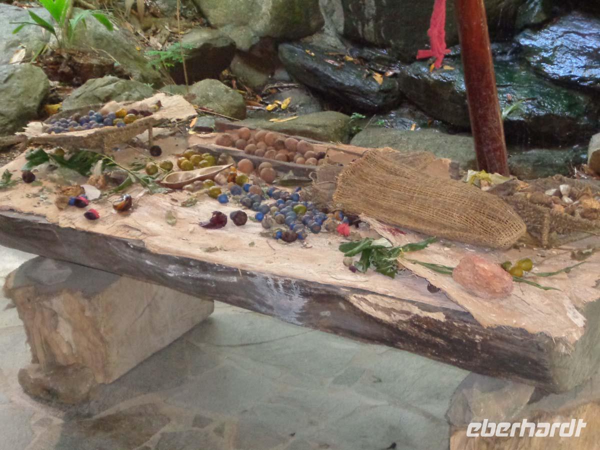 Ein letztes Mal wollen wir uns heute mit der Kultur der Ureinwohner vertraut machen. Der Tjapukai Cultural Park bietet dafür beste Gelegenheiten. Ein schön bemalter Guide erklärt uns zunächst, was man alles so aus dem Urwald an Früchten essen kann. Danach spielt er uns auf dem Digeridoo vor und zeigt uns die Waffen, wie Bumerang Speere und Speerschleudern. Speerwerfen und Bumerangwerfen können wir alsbald selbst ausprobieren. Eine Tanzshow und eine kleines Stück über die Entstehungsgeschichte der Welt bieten weitere Informationsmöglichkeiten. Gleich nebenan beginnt eine 7,5 km lange Seilbahn. Diese benutzen wir, um uns den tropischen Regenwald von oben anzuschauen. Es gibt verschiedene Zwischenstationen, von wo aus wir kleine Spaziergänge unternehmen, auf denen uns Gaby sehr viel über verschiedene Pflanzenarten erzählt. Die Seilbahn endet in Kuranda, wo sich prima noch das eine oder andere Andenken erwerben lässt. Auch das Angebot an Bars und Restaurants ist sehr groß, sodass niemand hungrig von dannen ziehen muss. Den Rückweg treten wir in einer historischen Regenwaldeisenbahn an in einem Wagon von 1909. Sie endet für uns an der Freshwater Station kurz vor Cairns. Es ist heute unser Letzter Abend in Australien, und so stoßen wir beim Abendessen mit einem Gläschen Sekt auf das Erlebte und Gesehene an.