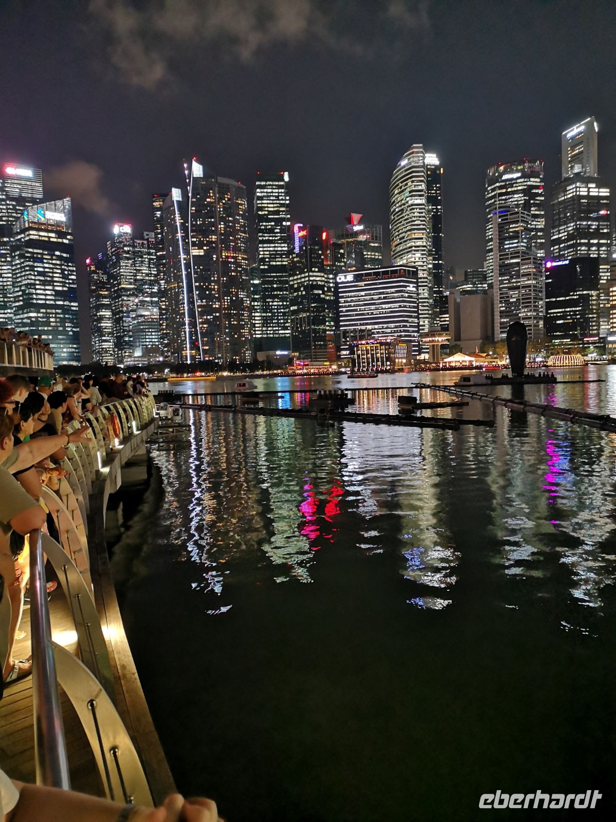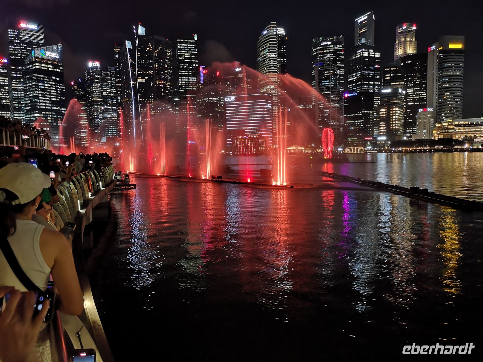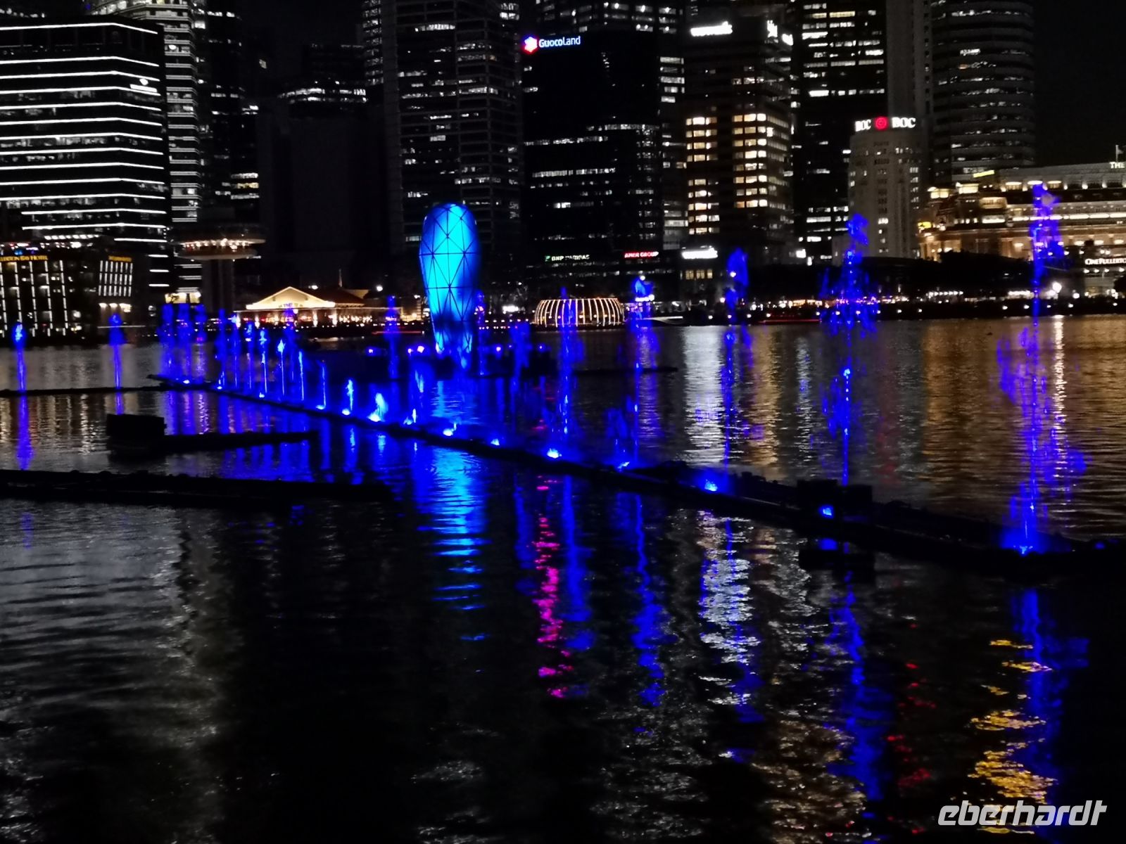 Eine wunderschöne Lichtershow mit Wasserfontänen, untermahlt mit passender Musik, fand auf der Wasserfläche vor dem Marie Bay Sands Hotel statt. Singapore hat viele Tagesgäste die auf der Durchreise hier einen Stopp machen und sich diese allabendliche Show ansehen. Nur 45 min später startet auf der Seite hinter dem Hotelkomplex die nächste Lichtershow, im „Garden by the Bay“. Hier werden die monumentalen, künstlichen Bäume des Gartens, die sogenannten Supertrees, als Objekt für diese Show genutzt.