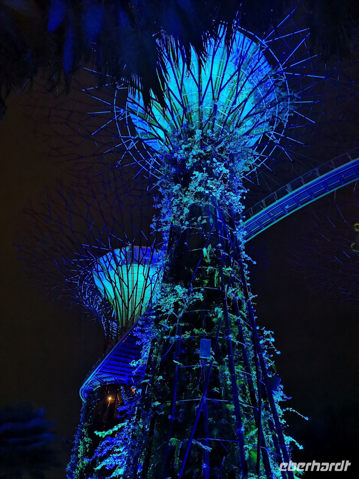 Um diese Show nicht zu verpassen, bewegen wir uns quere durch die Hotelanlage, zusammen mit vielen anderen Besuchern, und kommen rechtzeitig bei den künstlichen Bäumen an. Pünktlich wie vermutlich jeden Abend, beginnt nun hier die Lichtershow, hoch über unseren Köpfen. Auf dem Rücken liegend, auf runden Sitzbänken unter den Bäumen, lassen sich die magischen Lichtreize am besten verfolgen.